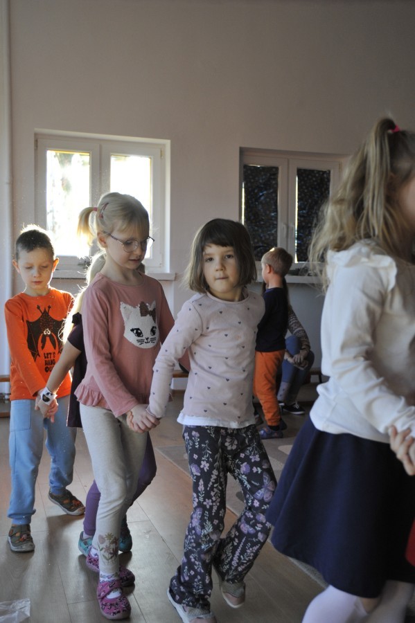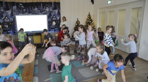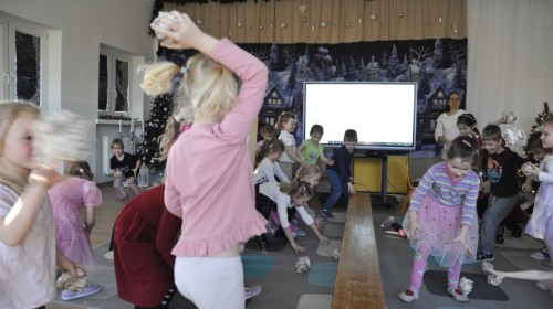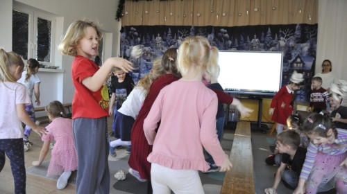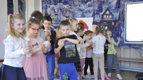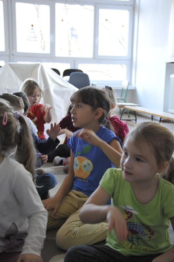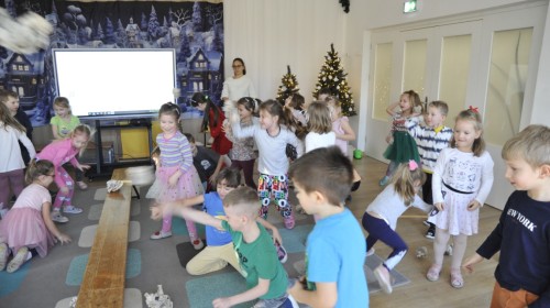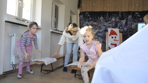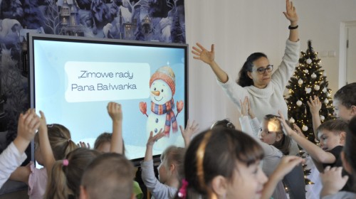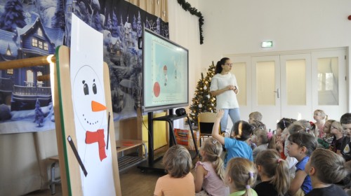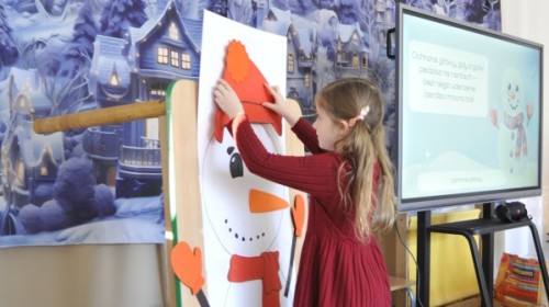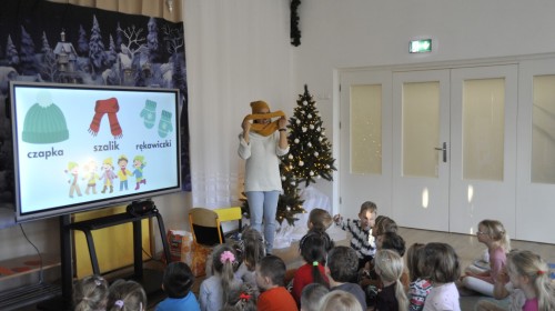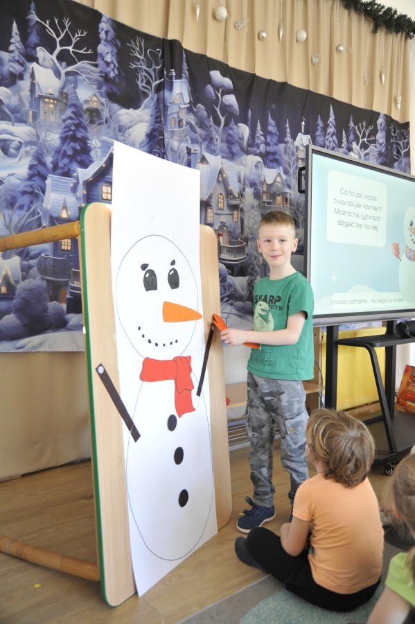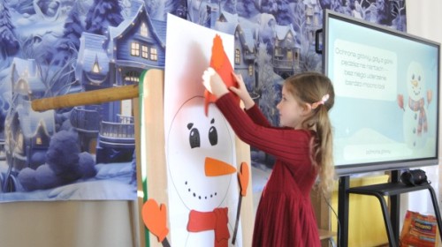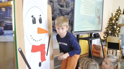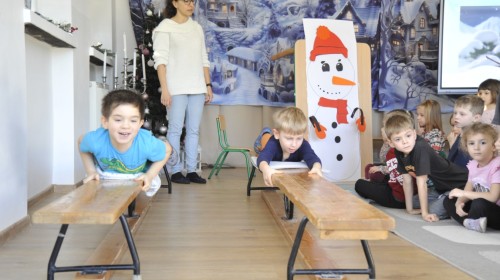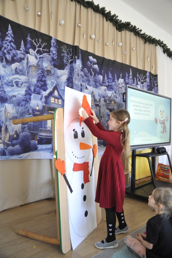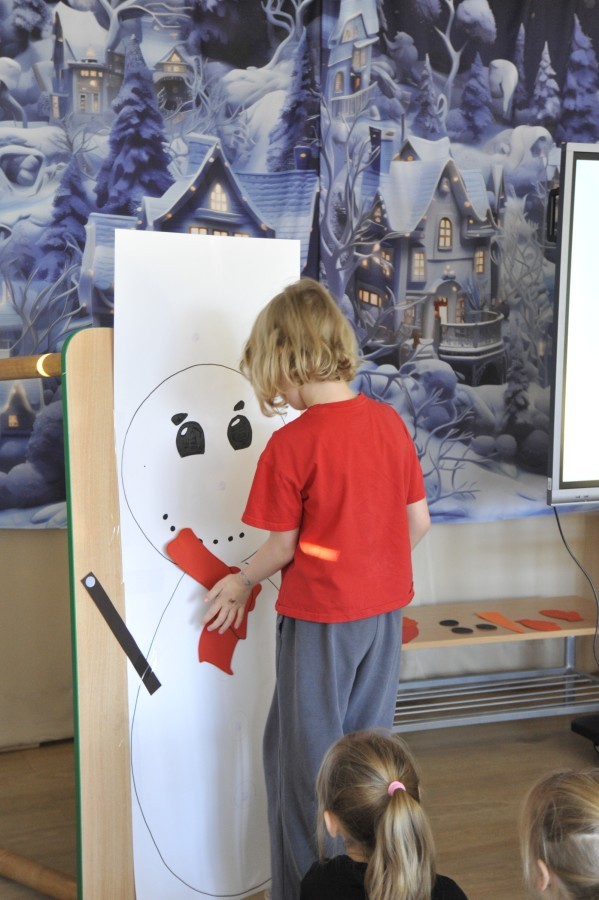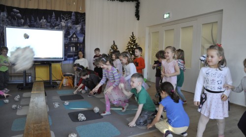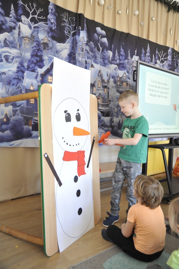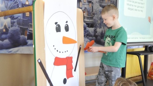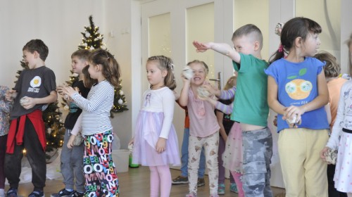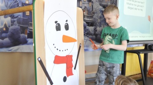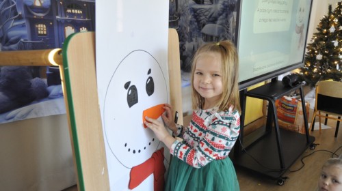 Dzięki radom Pana Bałwanka dowiedziały się jak należy ubierać się zimą, jak bezpiecznie zjeżdżać na sankach, jak wygląda bezpieczny kulig, bezpieczne zabawy na lodzie i na co należy uważać zimą, aby nie zrobić sobie krzywdy podczas zimowych zabaw i spacerów. Były też piosenki i zabawy ruchowe po polsku i po angielsku, zimowy tor przeszkód a na koniec bitwa papierowymi śnieżkami, której towarzyszyło mnóstwo radości i dziecięcych śmiechów!:)