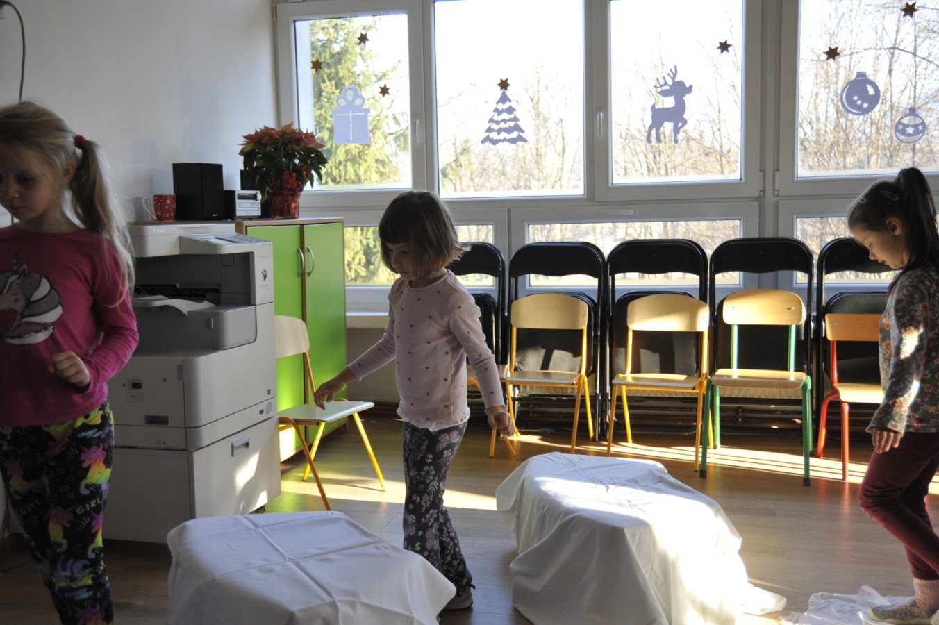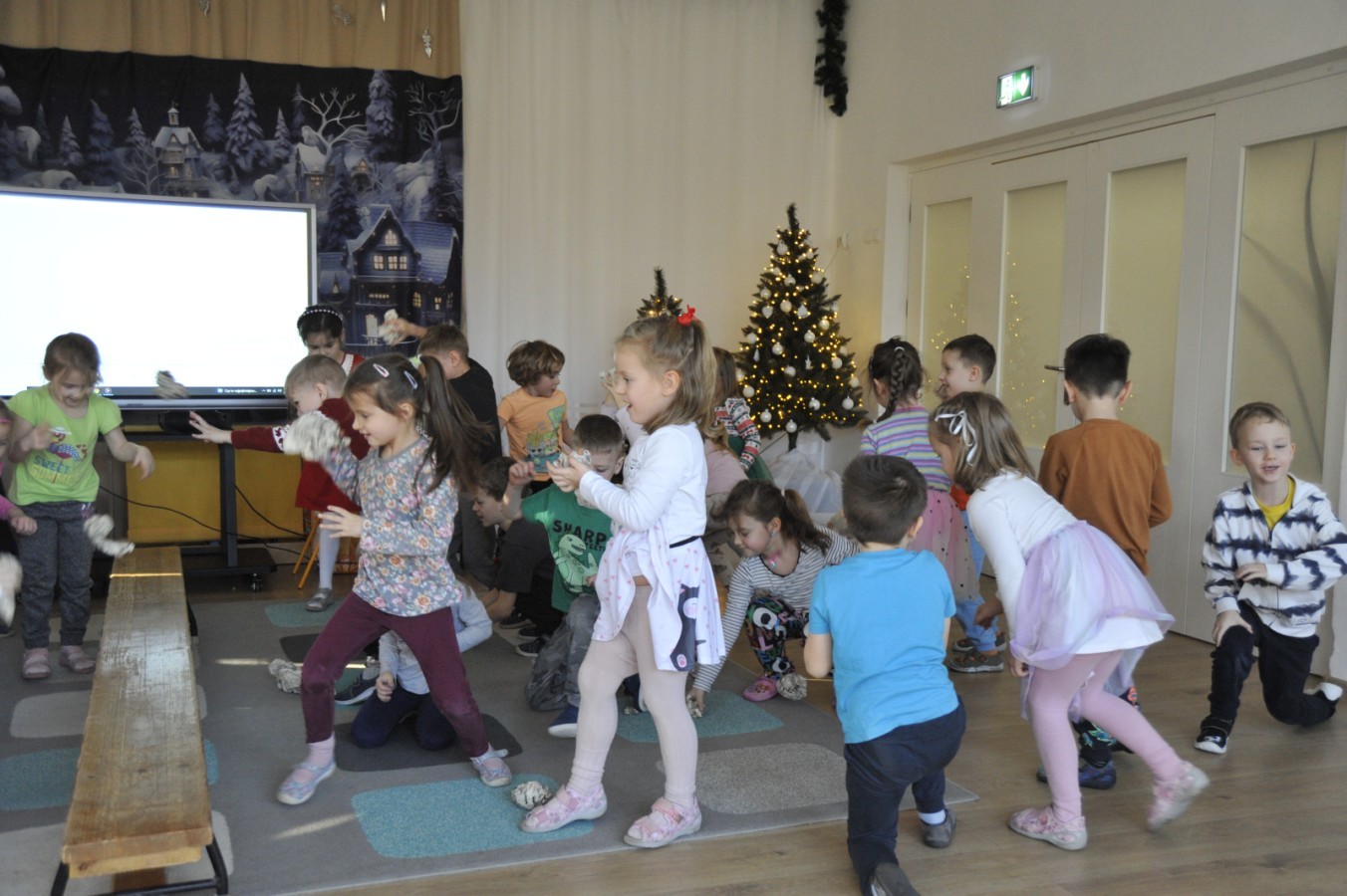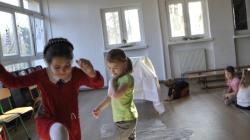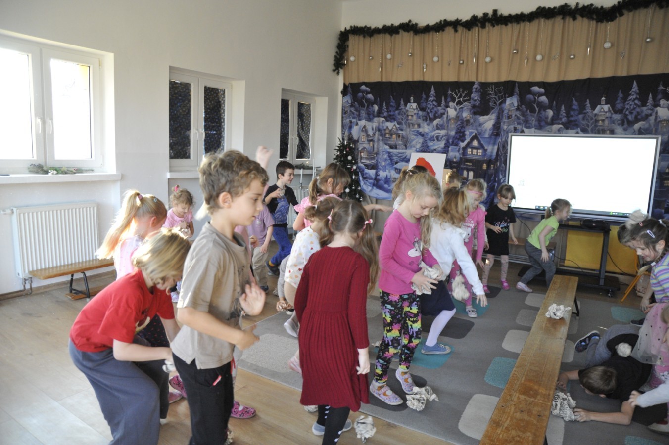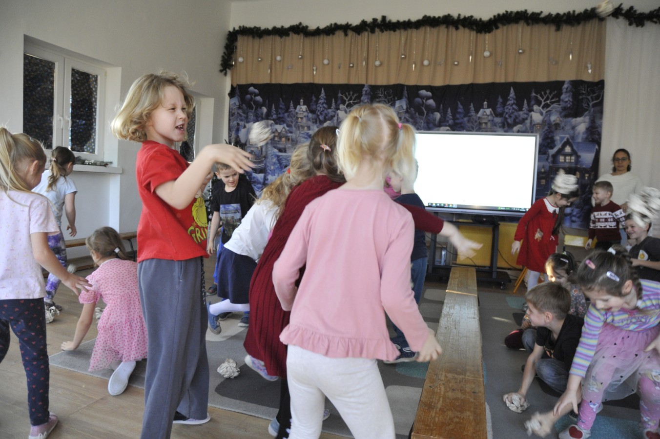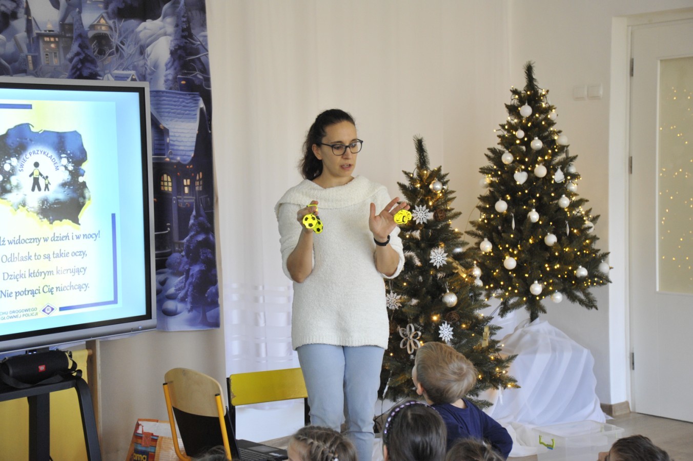 Dzięki radom Pana Bałwanka dowiedziały się jak należy ubierać się zimą, jak bezpiecznie zjeżdżać na sankach, jak wygląda bezpieczny kulig, bezpieczne zabawy na lodzie i na co należy uważać zimą, aby nie zrobić sobie krzywdy podczas zimowych zabaw i spacerów. Były też piosenki i zabawy ruchowe po polsku i po angielsku, zimowy tor przeszkód a na koniec bitwa papierowymi śnieżkami, której towarzyszyło mnóstwo radości i dziecięcych śmiechów!:)