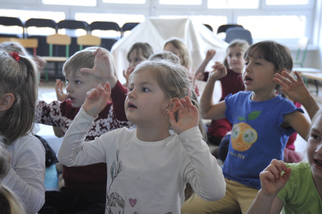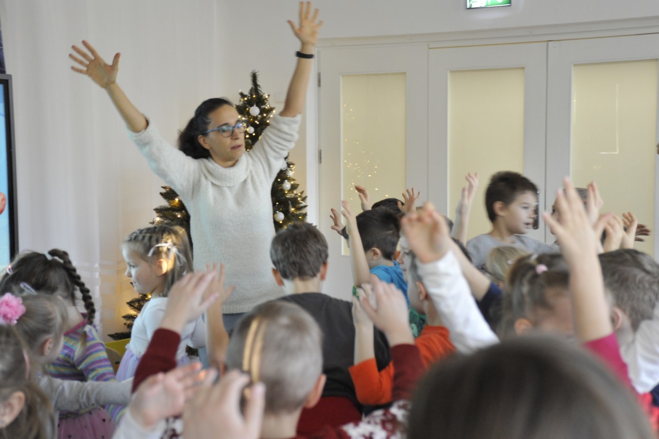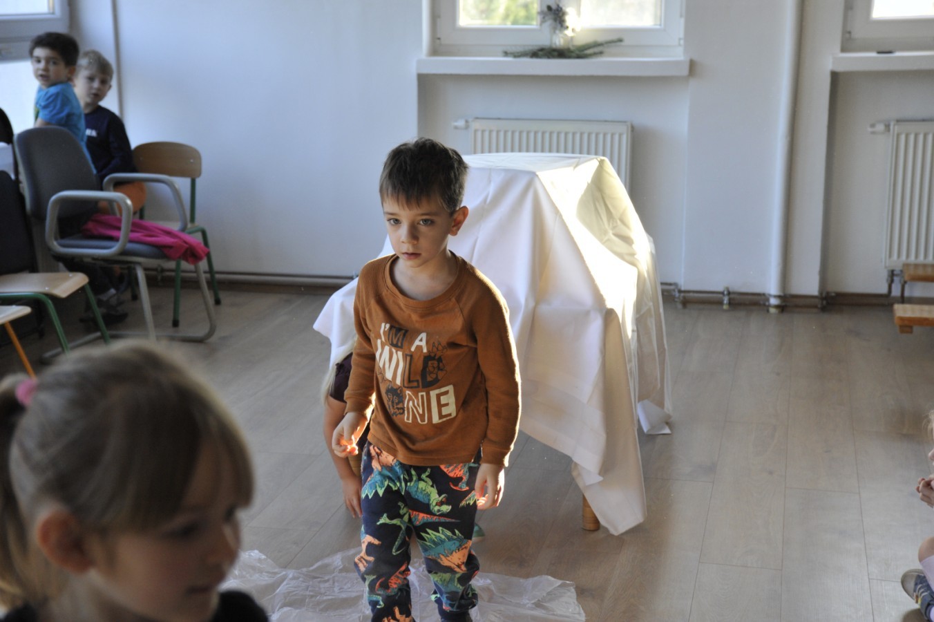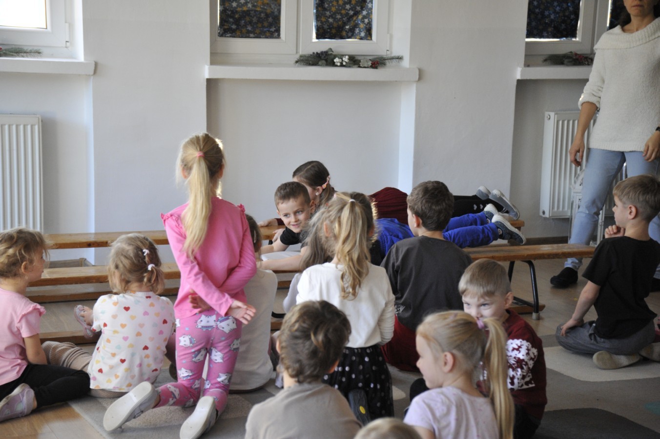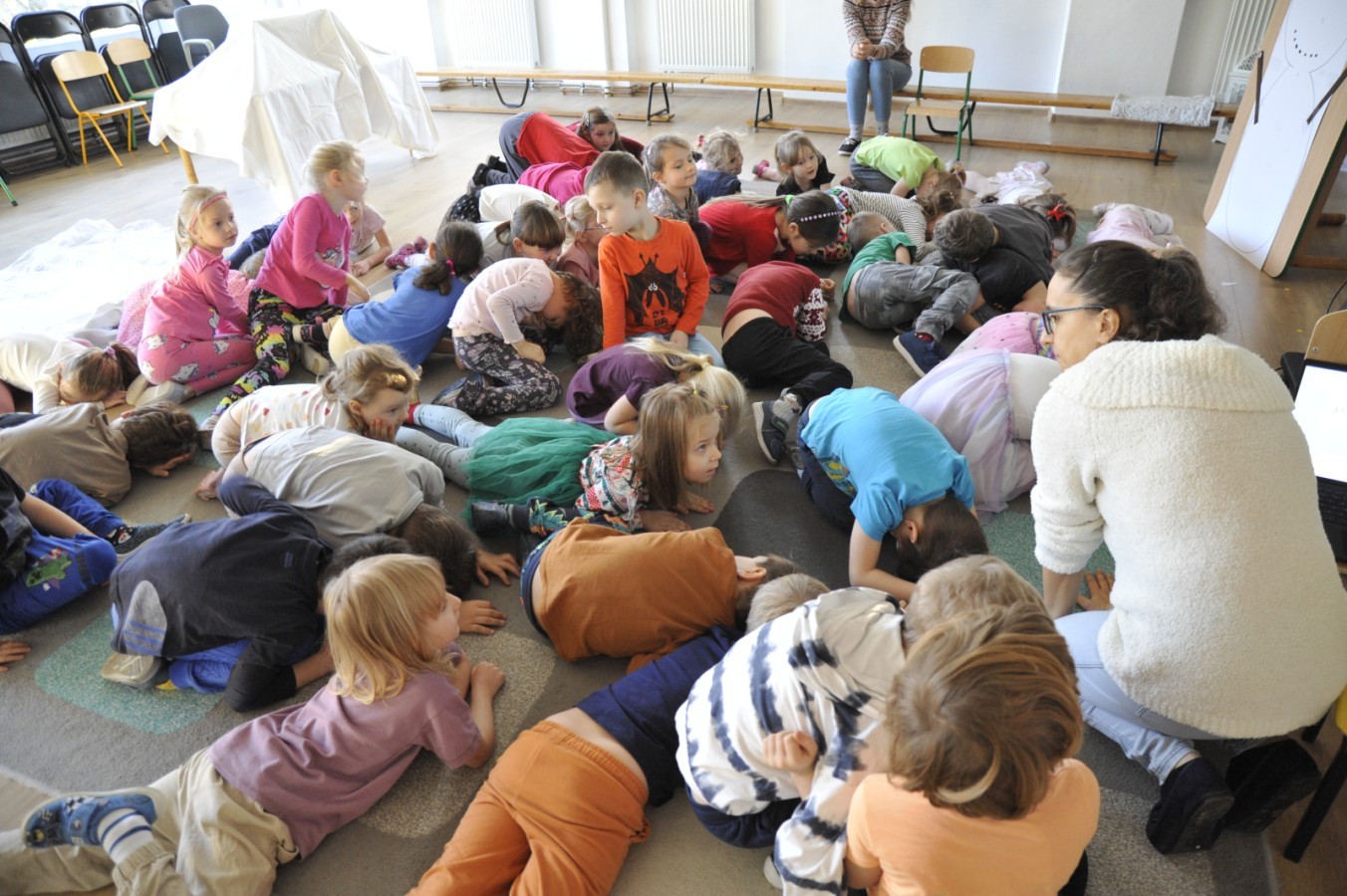 Dzięki radom Pana Bałwanka dowiedziały się jak należy ubierać się zimą, jak bezpiecznie zjeżdżać na sankach, jak wygląda bezpieczny kulig, bezpieczne zabawy na lodzie i na co należy uważać zimą, aby nie zrobić sobie krzywdy podczas zimowych zabaw i spacerów. Były też piosenki i zabawy ruchowe po polsku i po angielsku, zimowy tor przeszkód a na koniec bitwa papierowymi śnieżkami, której towarzyszyło mnóstwo radości i dziecięcych śmiechów!:)