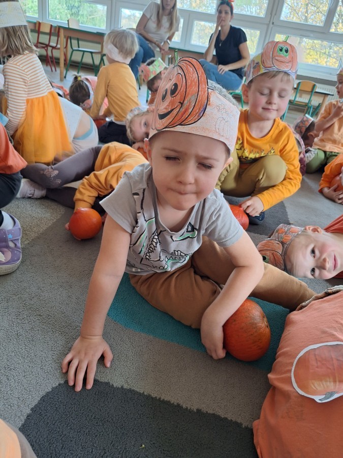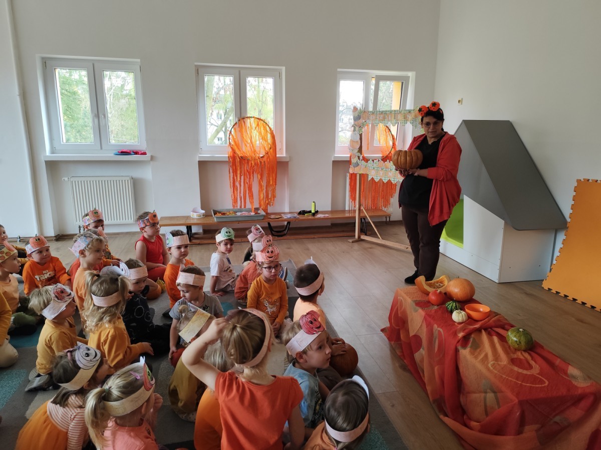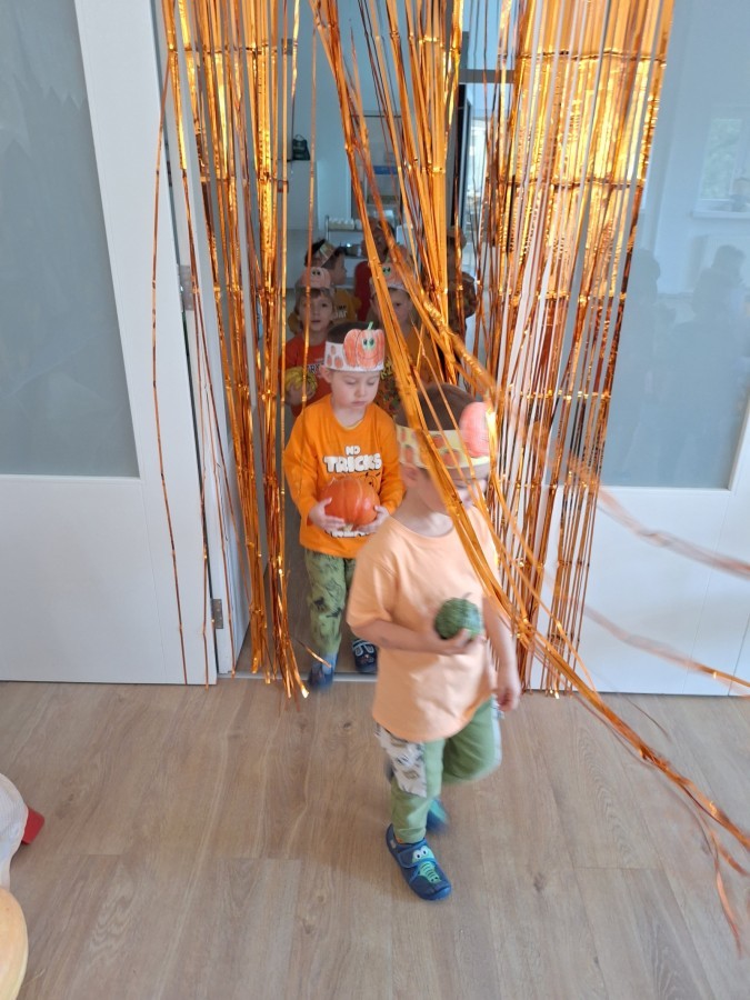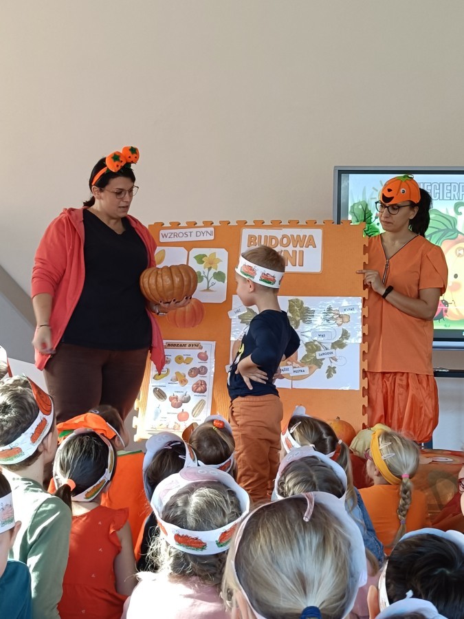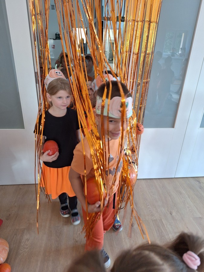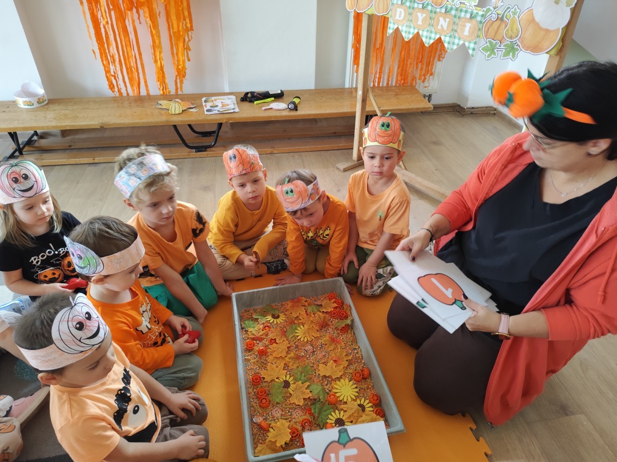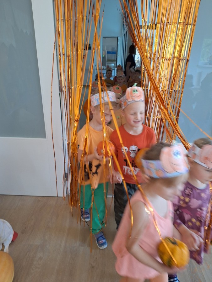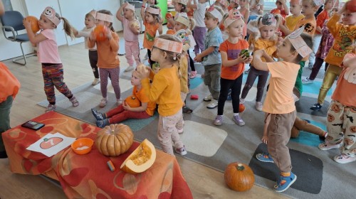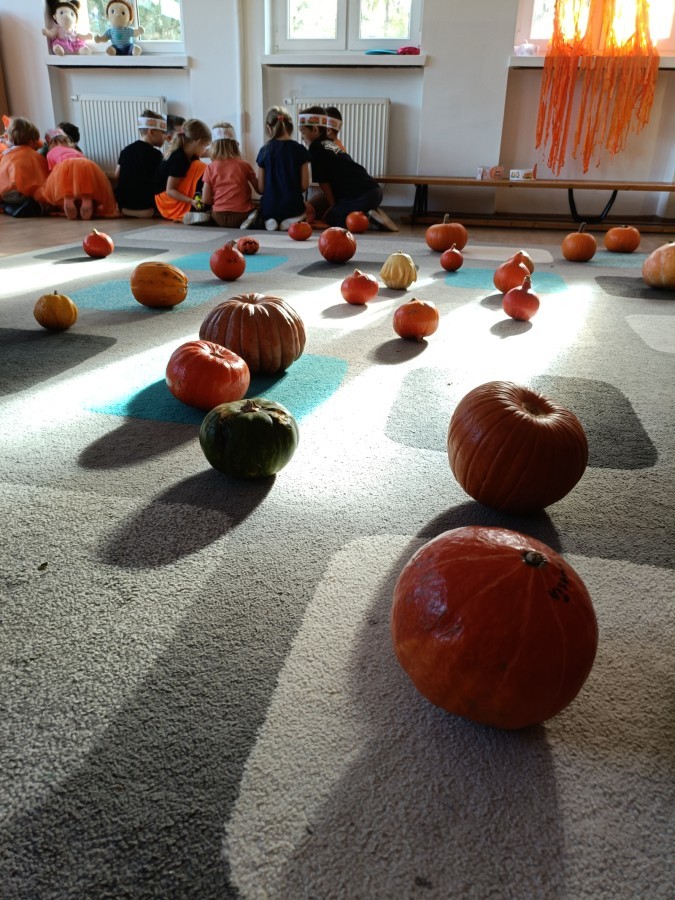 Dzieci z wszystkich grup poznały ciekawostki o dyniach, poznały budowę dyni, dowiedziały się jakie są rodzaje i odmiany dyni. Nie zabrakło zabaw muzyczno-ruchowych po polsku i po angielsku, tańców i zabaw matematycznych. Dzieci odszukiwały cienie, układały rytmy z dyń, wyszukiwały dynie w pudełku sensorycznym a także odkrywały ukryte przetwory z dyni przy pomocy latarek. Na koniec była gra terenowa oraz zabawy z dyniami i pomarańczowymi balonami w ogrodzie przedszkolnym zakończone tańcem na liściach do piosenki po angielsku "Fall freeze". Zabawa trwała dopóki z ogrodu nie przegonił nas jesienny deszcz. Wtedy przyszedł czas na obiad i pyszną zupkę dyniową!:)