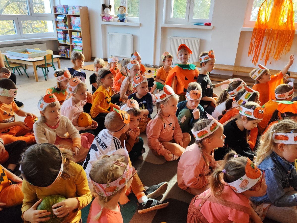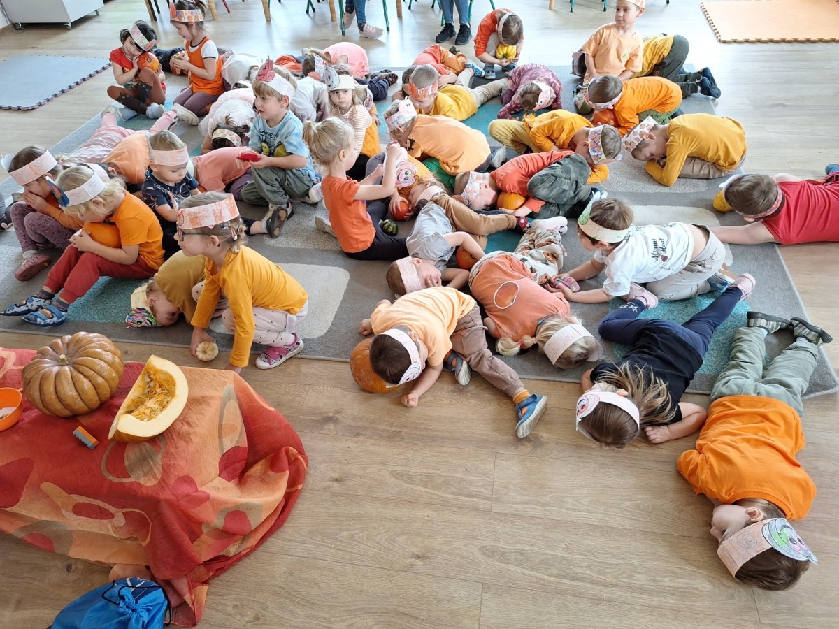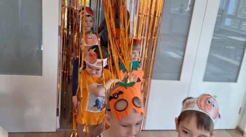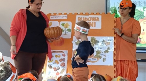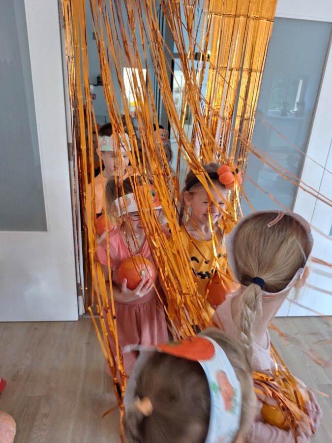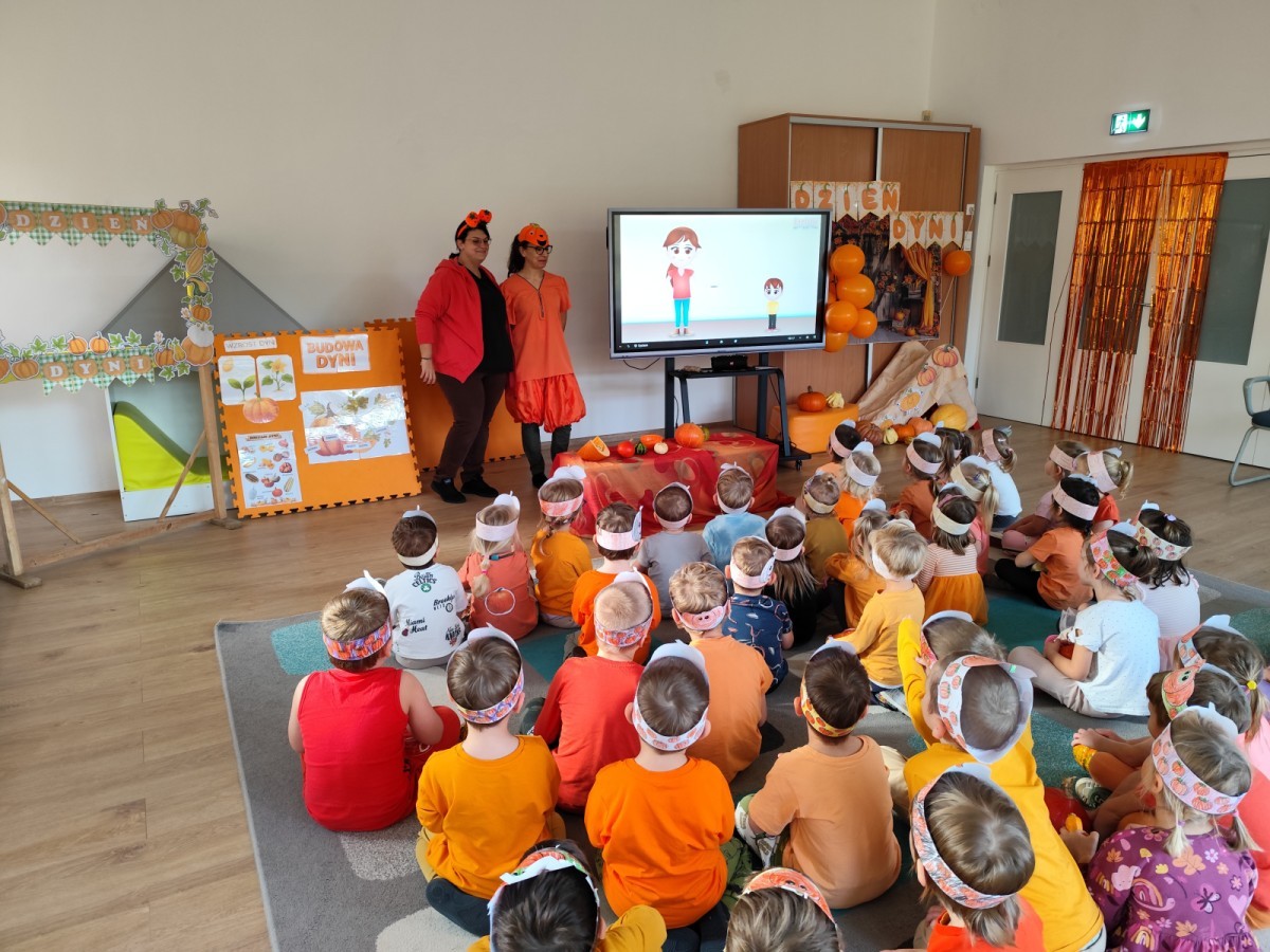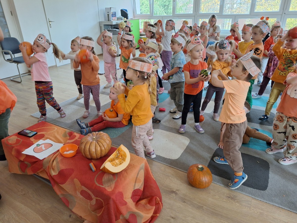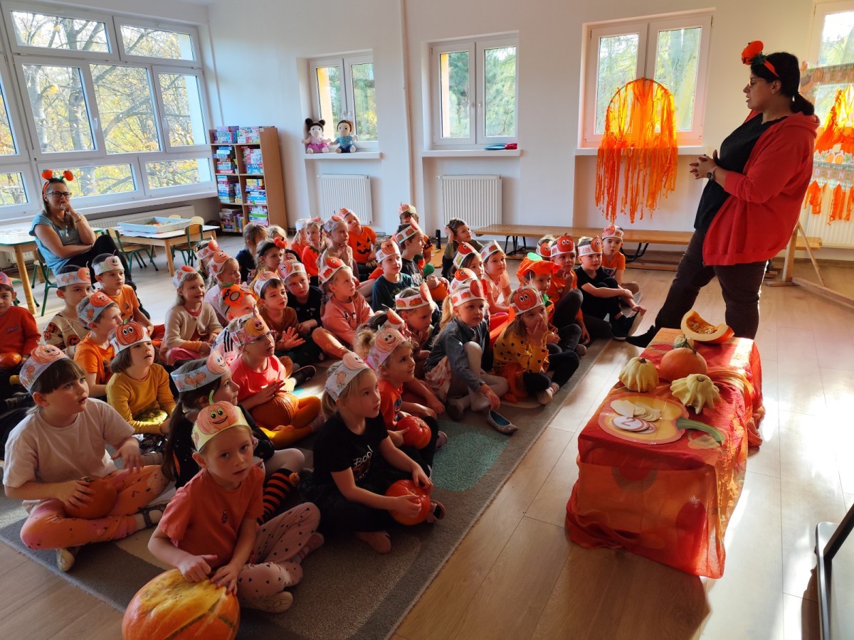 Dzieci z wszystkich grup poznały ciekawostki o dyniach, poznały budowę dyni, dowiedziały się jakie są rodzaje i odmiany dyni. Nie zabrakło zabaw muzyczno-ruchowych po polsku i po angielsku, tańców i zabaw matematycznych. Dzieci odszukiwały cienie, układały rytmy z dyń, wyszukiwały dynie w pudełku sensorycznym a także odkrywały ukryte przetwory z dyni przy pomocy latarek. Na koniec była gra terenowa oraz zabawy z dyniami i pomarańczowymi balonami w ogrodzie przedszkolnym zakończone tańcem na liściach do piosenki po angielsku "Fall freeze". Zabawa trwała dopóki z ogrodu nie przegonił nas jesienny deszcz. Wtedy przyszedł czas na obiad i pyszną zupkę dyniową!:)