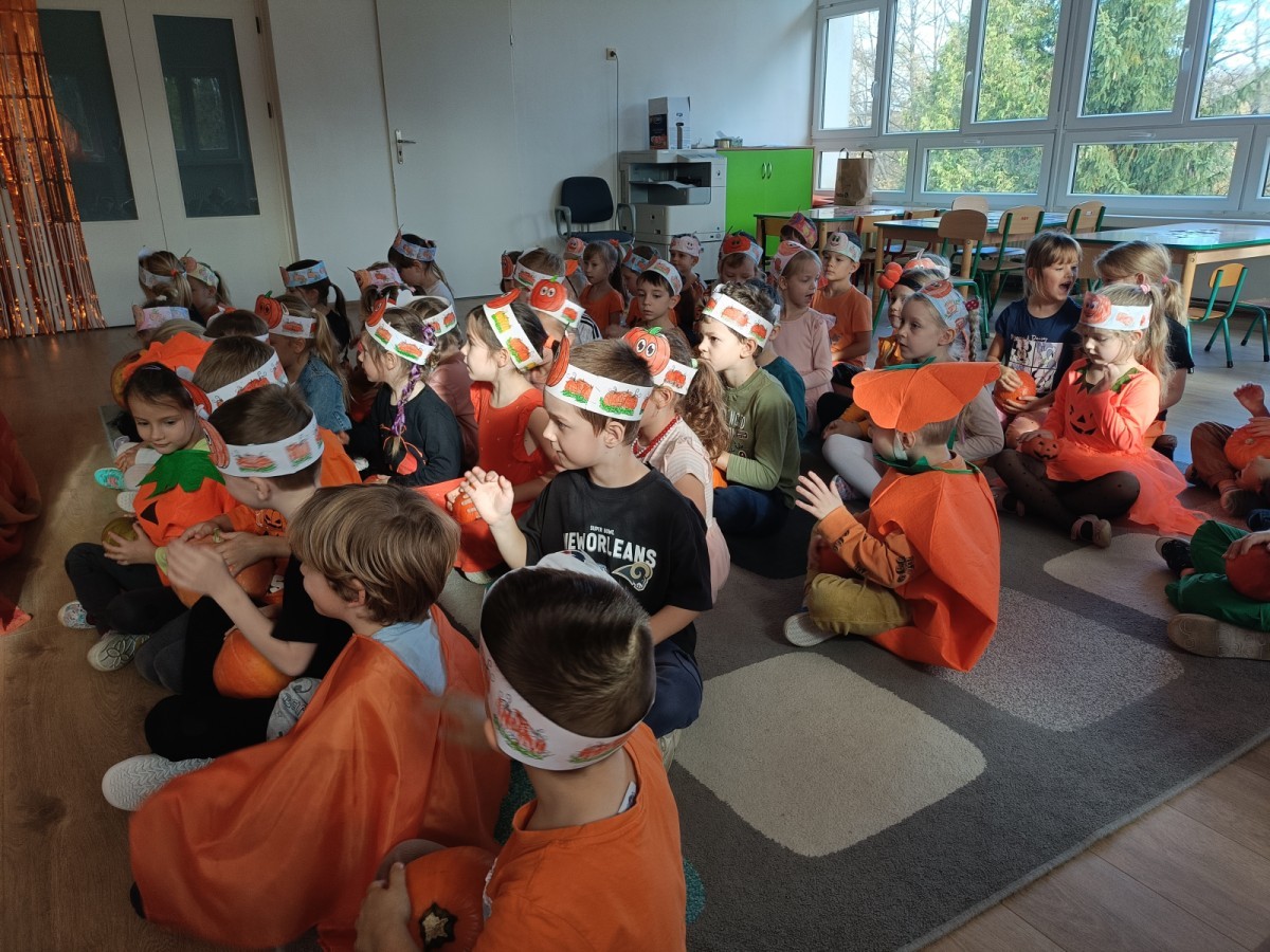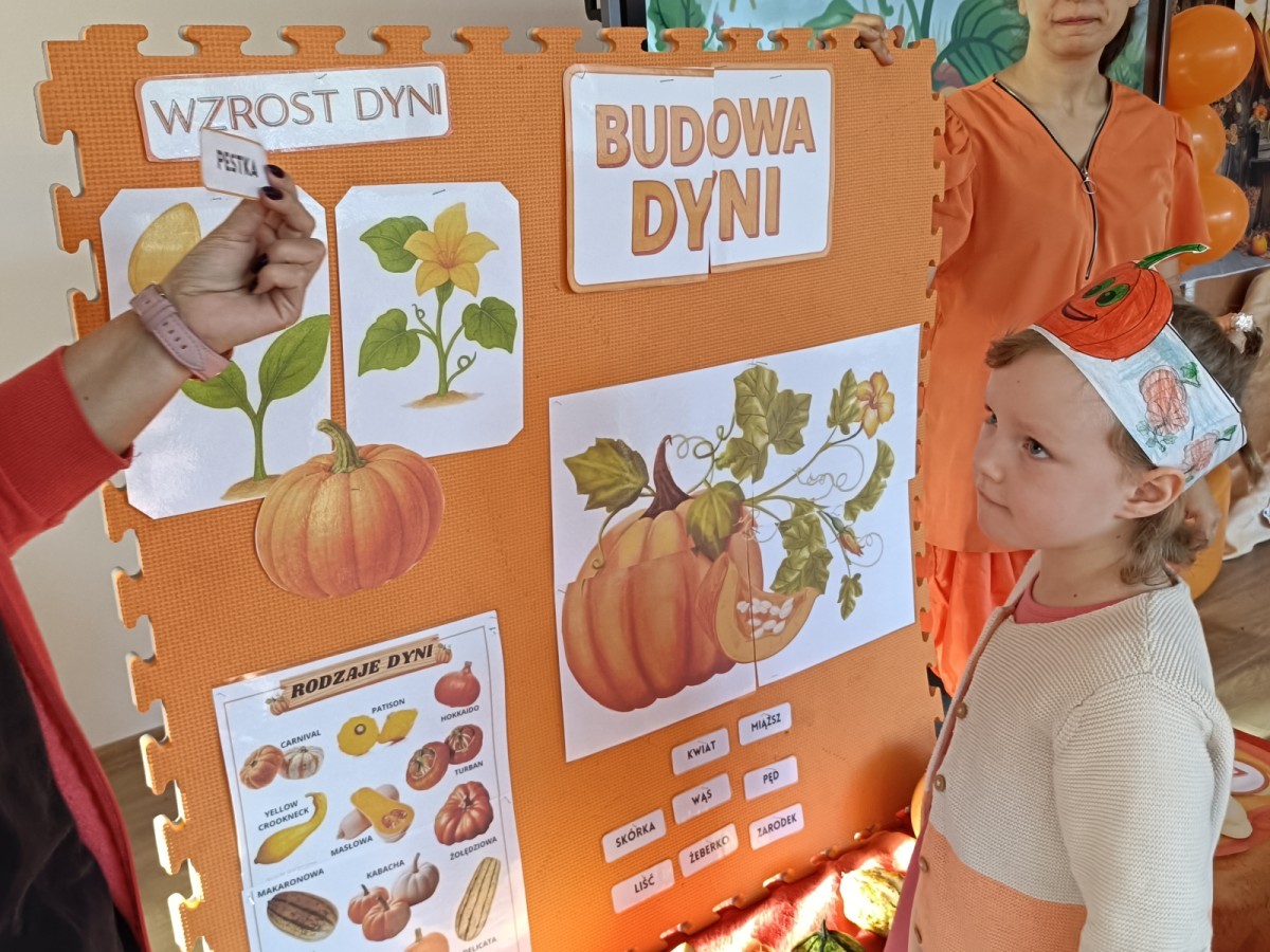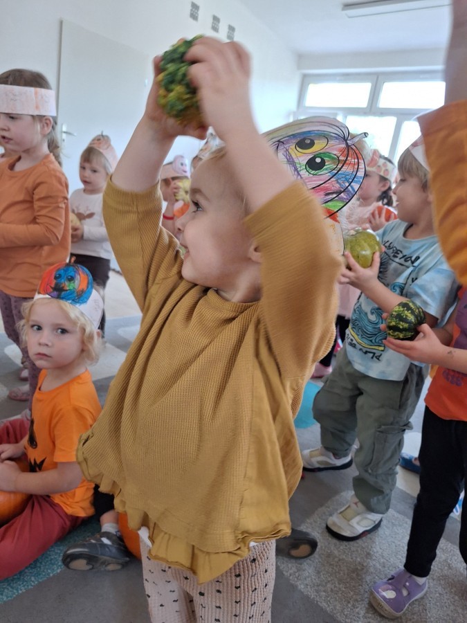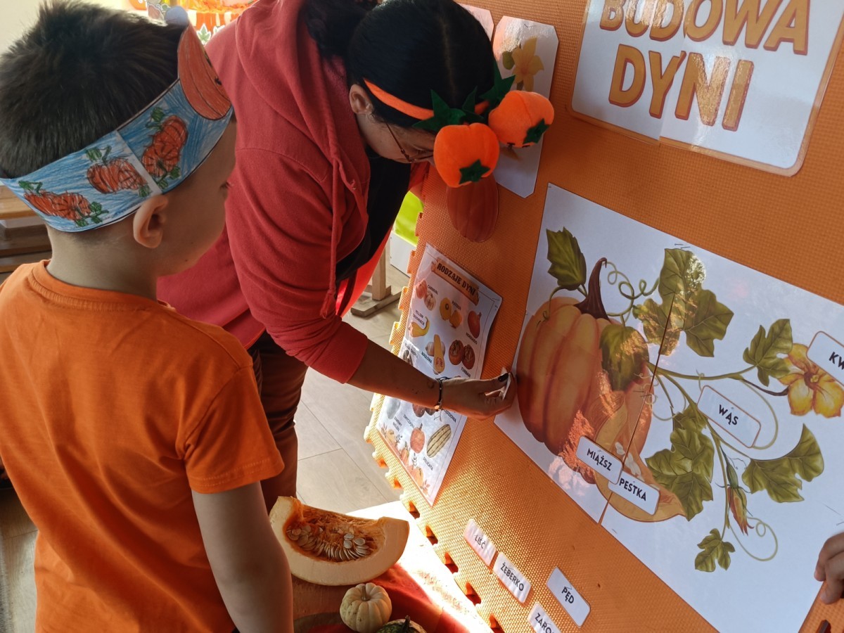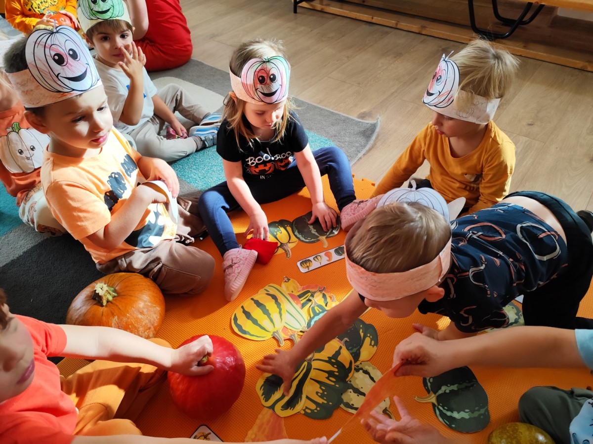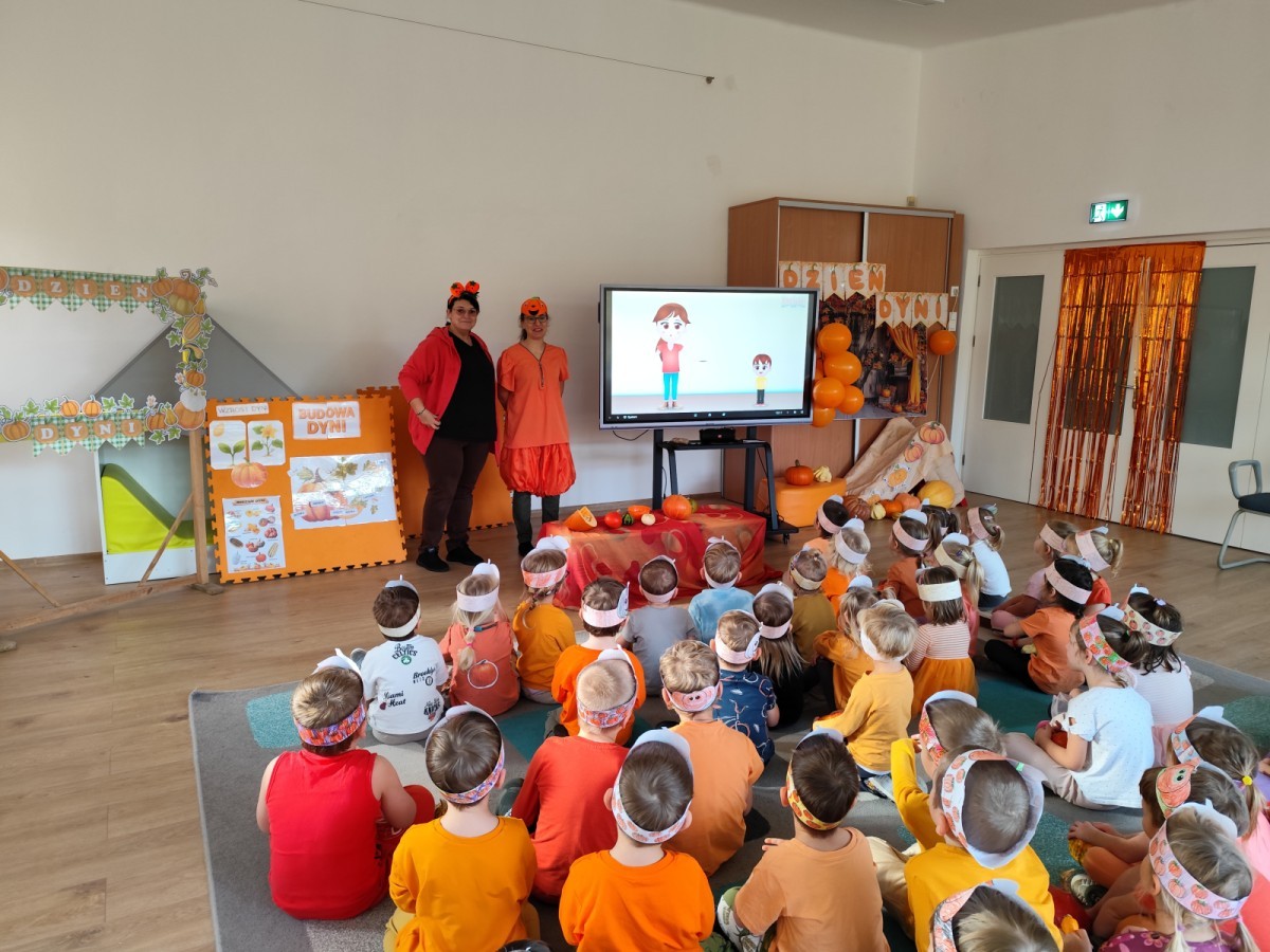 Dzieci z wszystkich grup poznały ciekawostki o dyniach, poznały budowę dyni, dowiedziały się jakie są rodzaje i odmiany dyni. Nie zabrakło zabaw muzyczno-ruchowych po polsku i po angielsku, tańców i zabaw matematycznych. Dzieci odszukiwały cienie, układały rytmy z dyń, wyszukiwały dynie w pudełku sensorycznym a także odkrywały ukryte przetwory z dyni przy pomocy latarek. Na koniec była gra terenowa oraz zabawy z dyniami i pomarańczowymi balonami w ogrodzie przedszkolnym zakończone tańcem na liściach do piosenki po angielsku "Fall freeze". Zabawa trwała dopóki z ogrodu nie przegonił nas jesienny deszcz. Wtedy przyszedł czas na obiad i pyszną zupkę dyniową!:)
