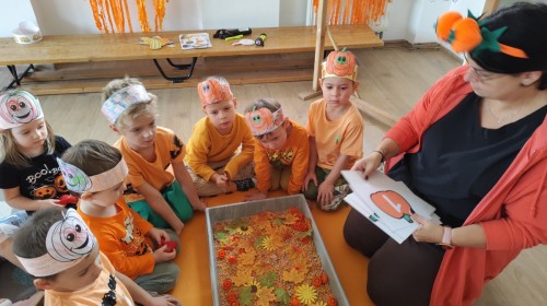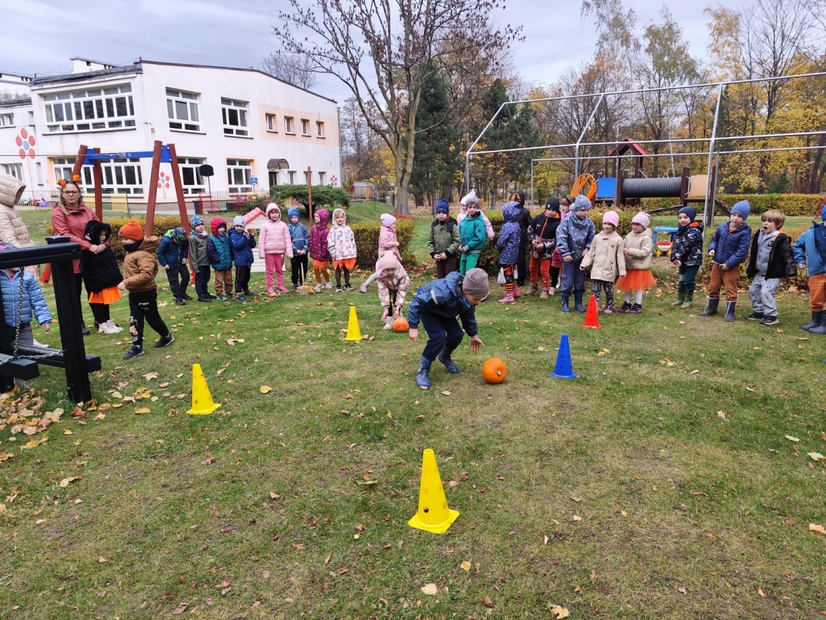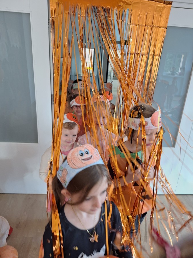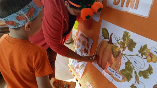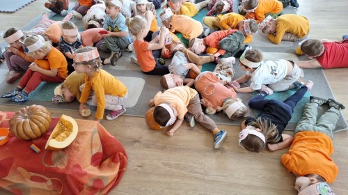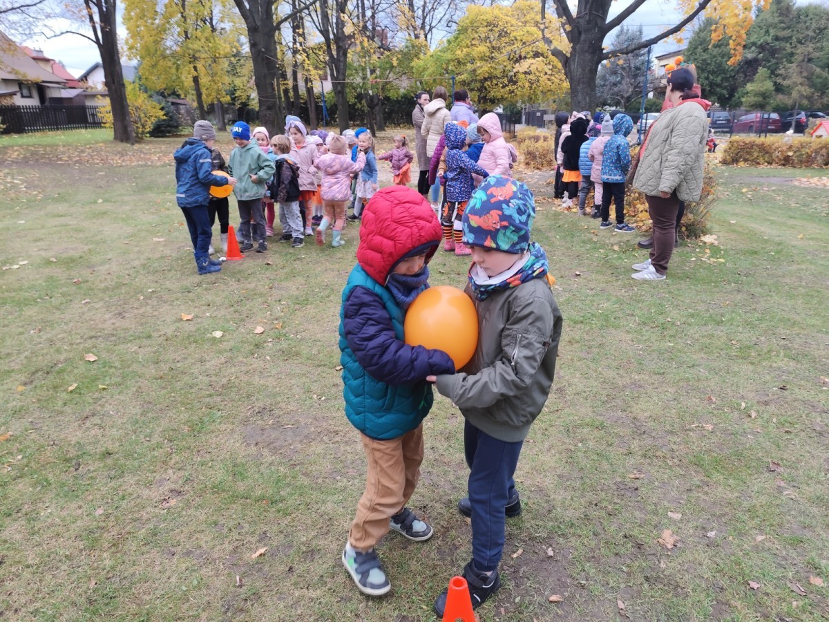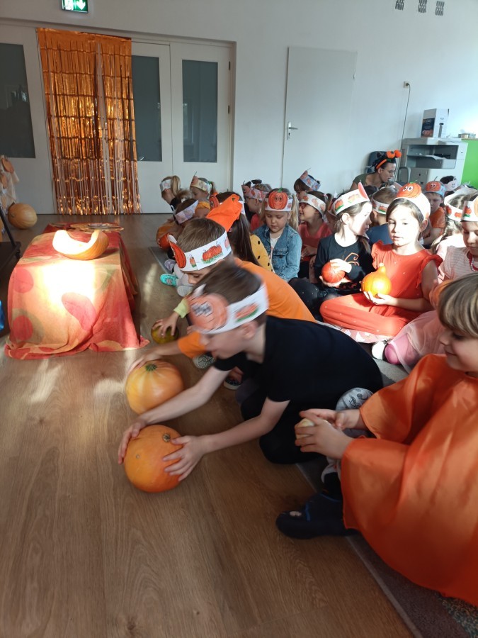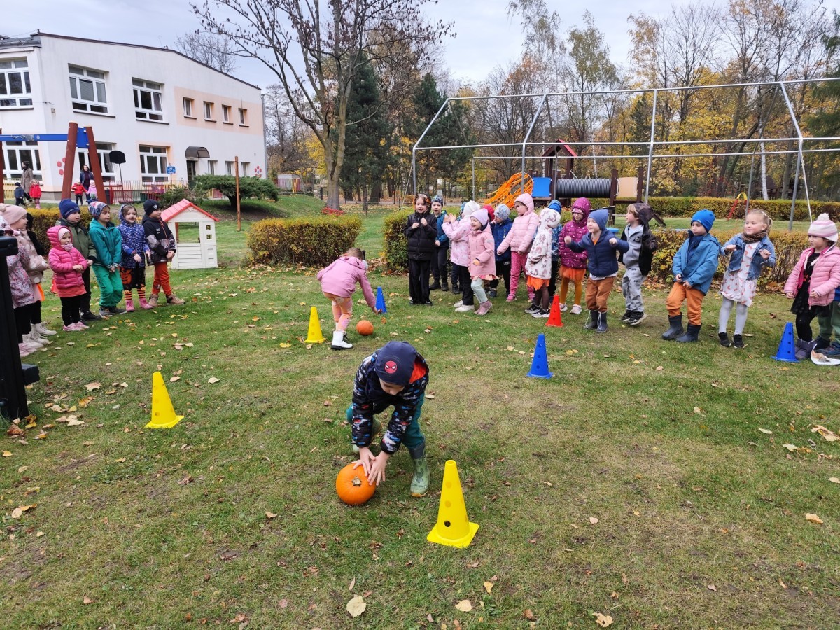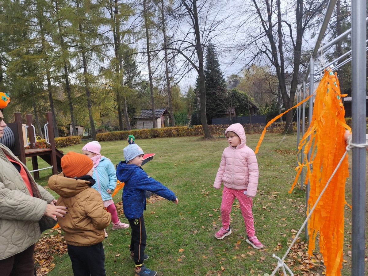 Dzieci z wszystkich grup poznały ciekawostki o dyniach, poznały budowę dyni, dowiedziały się jakie są rodzaje i odmiany dyni. Nie zabrakło zabaw muzyczno-ruchowych po polsku i po angielsku, tańców i zabaw matematycznych. Dzieci odszukiwały cienie, układały rytmy z dyń, wyszukiwały dynie w pudełku sensorycznym a także odkrywały ukryte przetwory z dyni przy pomocy latarek. Na koniec była gra terenowa oraz zabawy z dyniami i pomarańczowymi balonami w ogrodzie przedszkolnym zakończone tańcem na liściach do piosenki po angielsku "Fall freeze". Zabawa trwała dopóki z ogrodu nie przegonił nas jesienny deszcz. Wtedy przyszedł czas na obiad i pyszną zupkę dyniową!:)