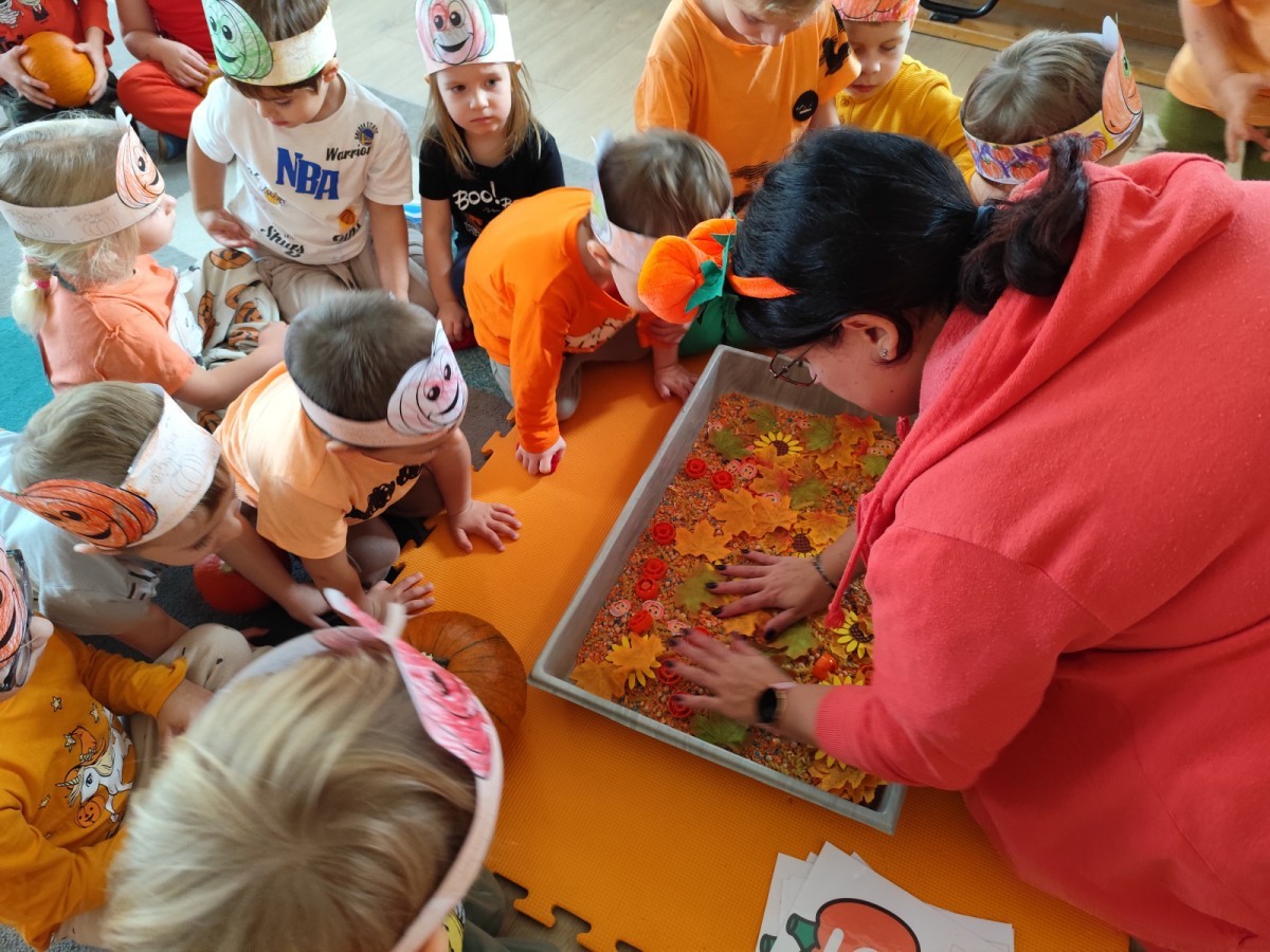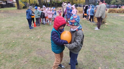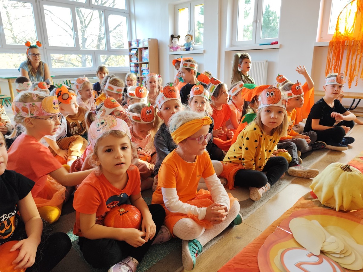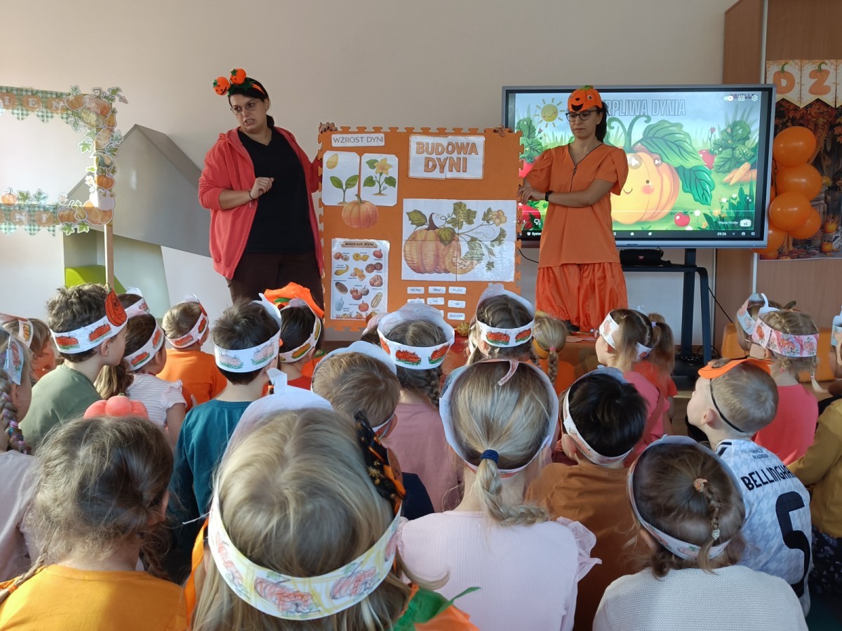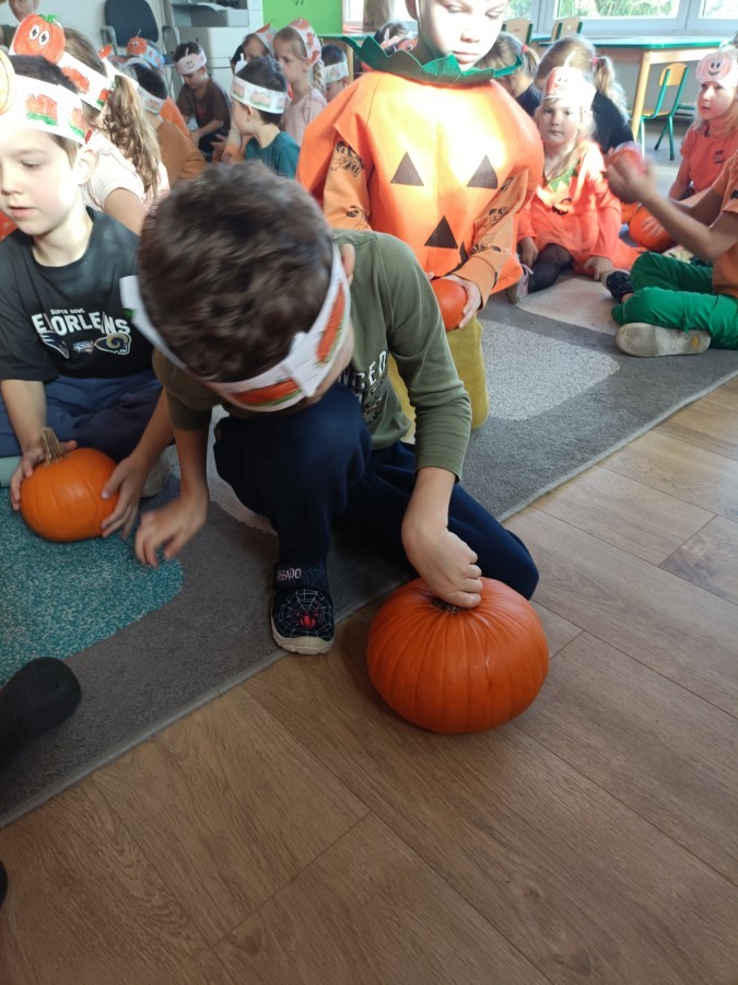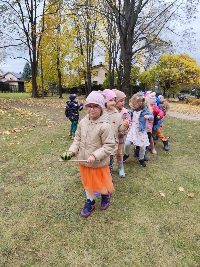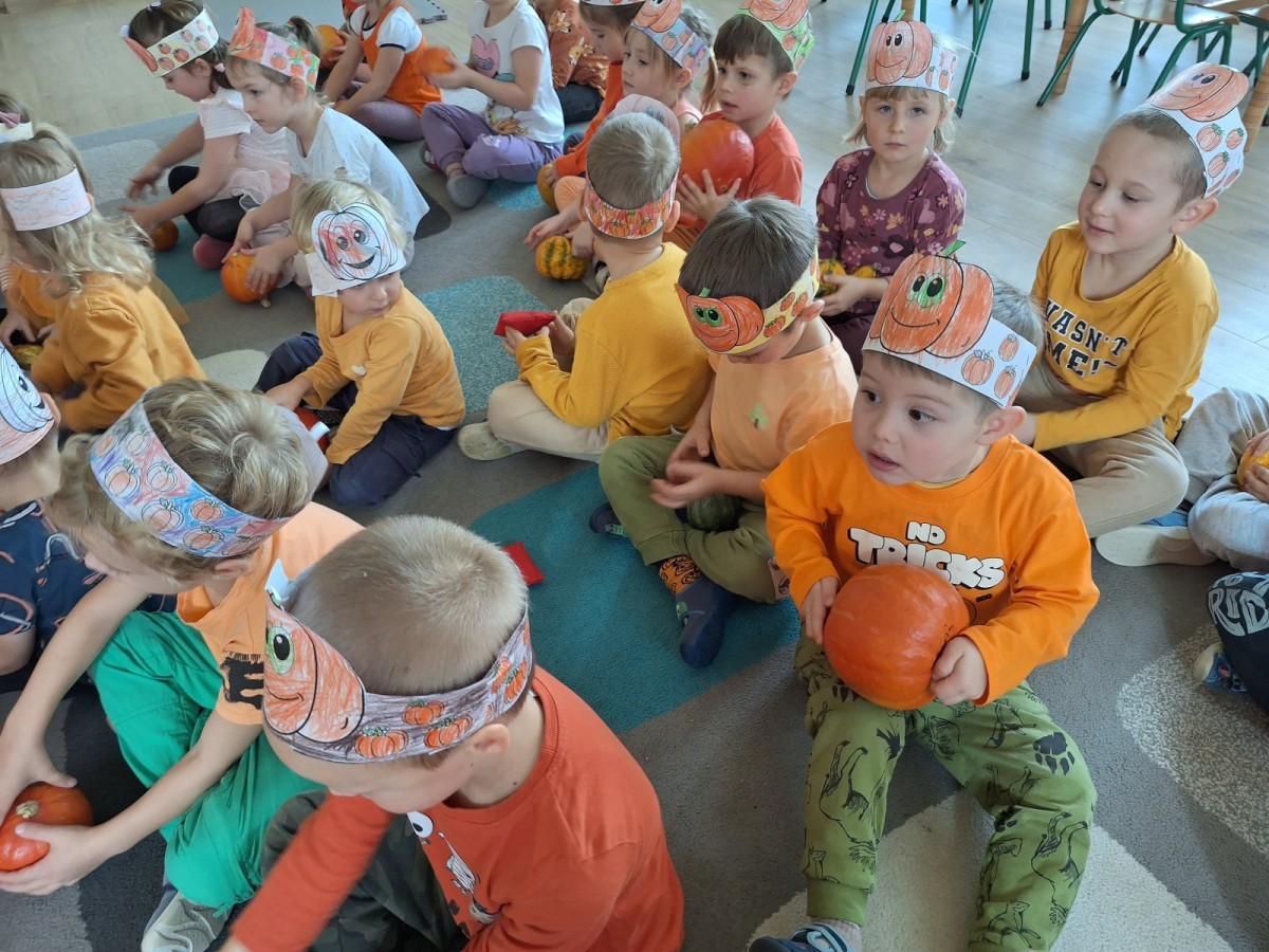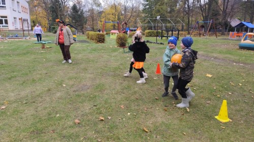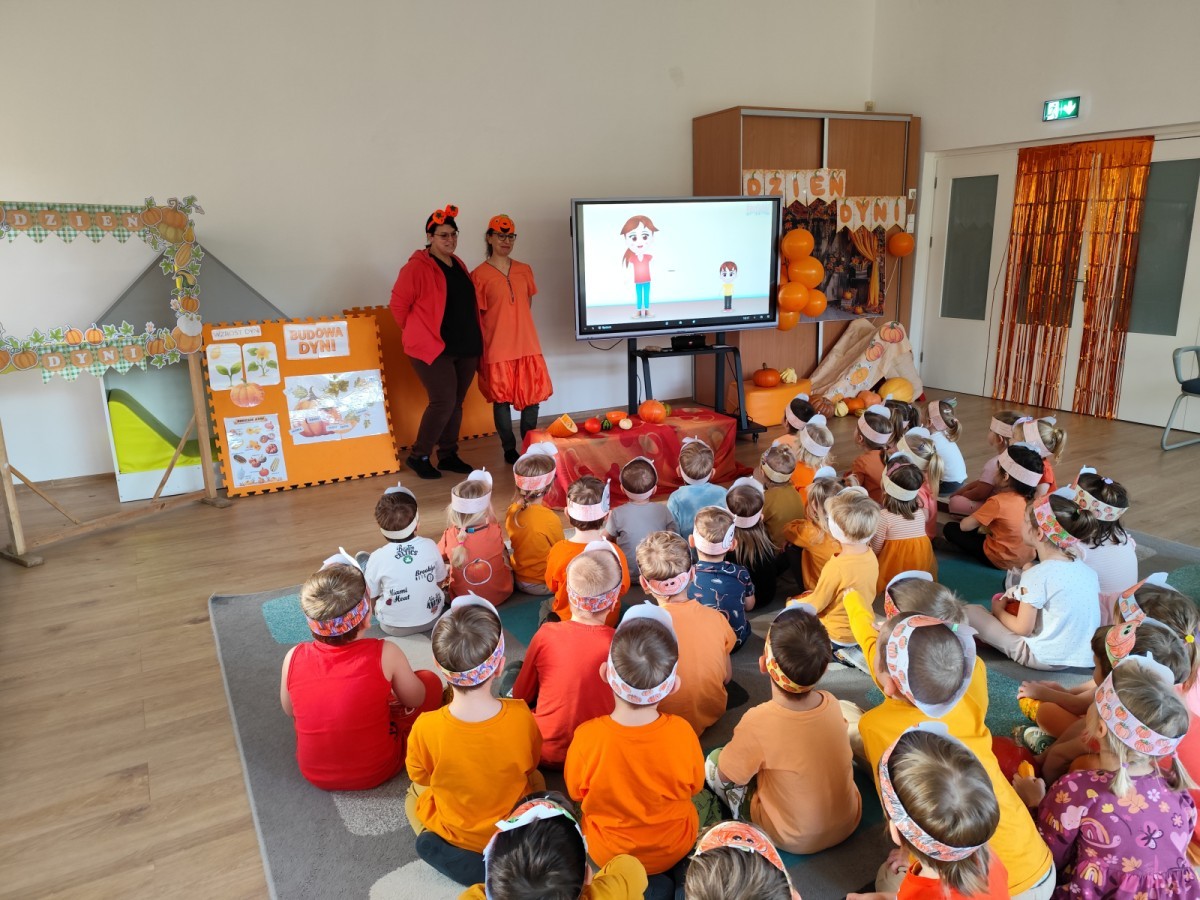 Dzieci z wszystkich grup poznały ciekawostki o dyniach, poznały budowę dyni, dowiedziały się jakie są rodzaje i odmiany dyni. Nie zabrakło zabaw muzyczno-ruchowych po polsku i po angielsku, tańców i zabaw matematycznych. Dzieci odszukiwały cienie, układały rytmy z dyń, wyszukiwały dynie w pudełku sensorycznym a także odkrywały ukryte przetwory z dyni przy pomocy latarek. Na koniec była gra terenowa oraz zabawy z dyniami i pomarańczowymi balonami w ogrodzie przedszkolnym zakończone tańcem na liściach do piosenki po angielsku "Fall freeze". Zabawa trwała dopóki z ogrodu nie przegonił nas jesienny deszcz. Wtedy przyszedł czas na obiad i pyszną zupkę dyniową!:)