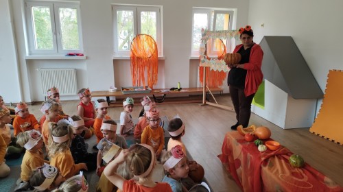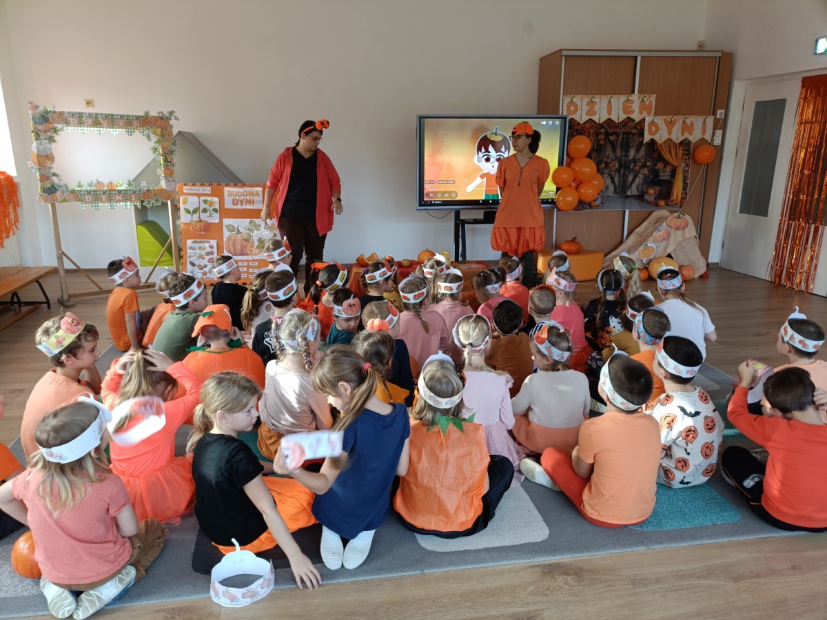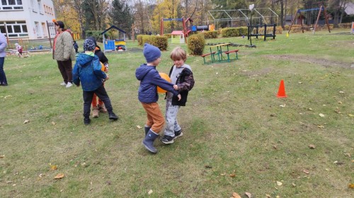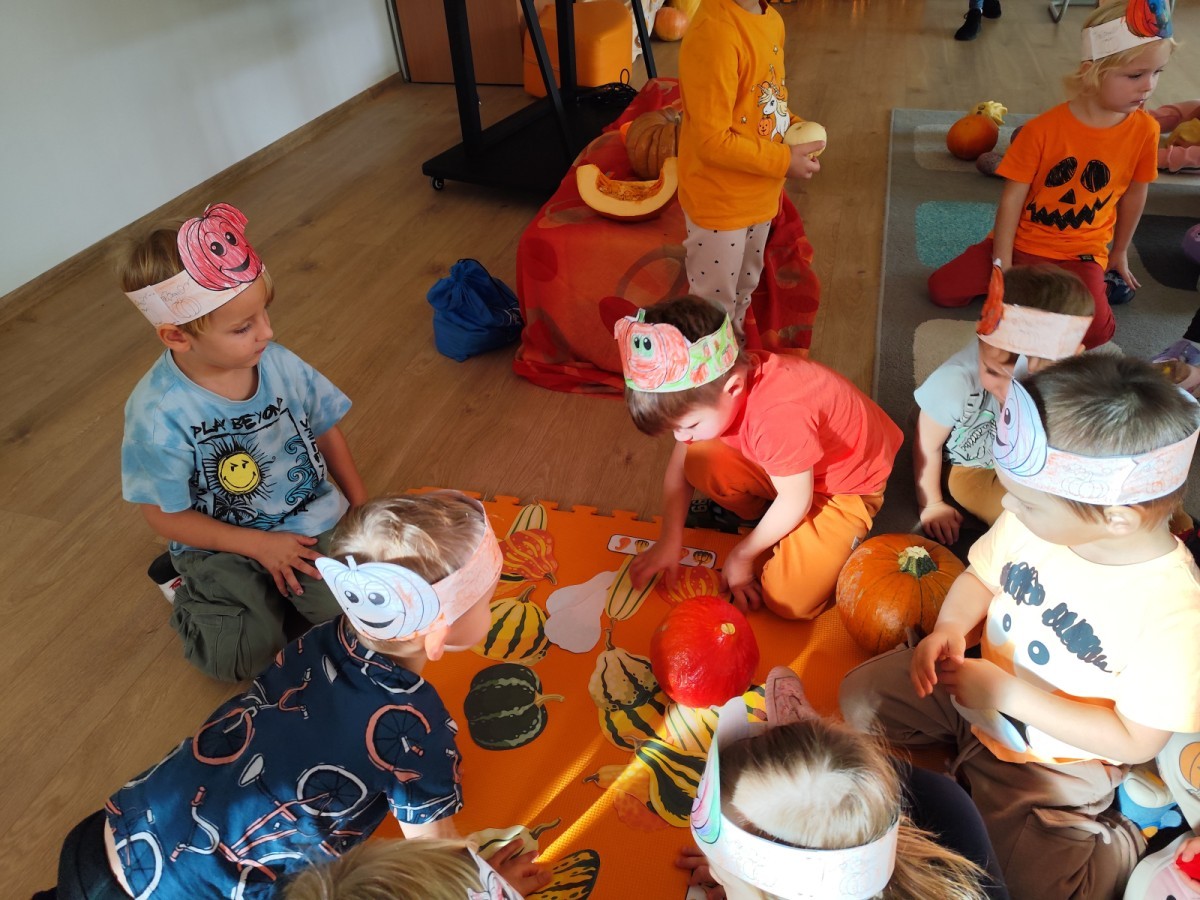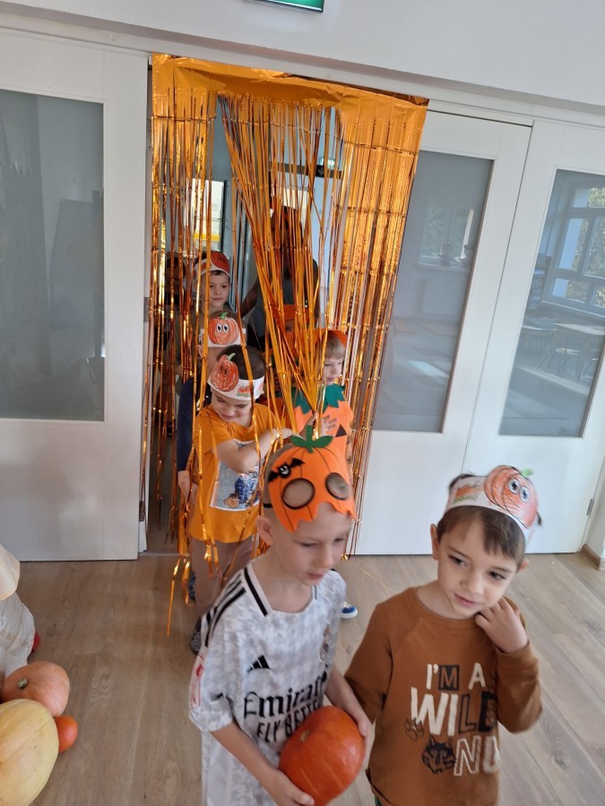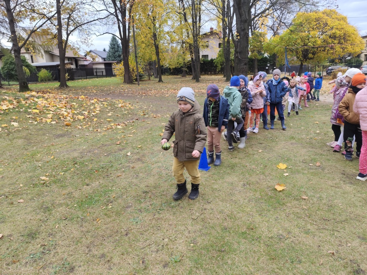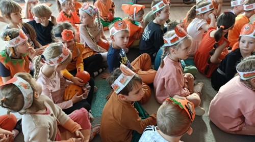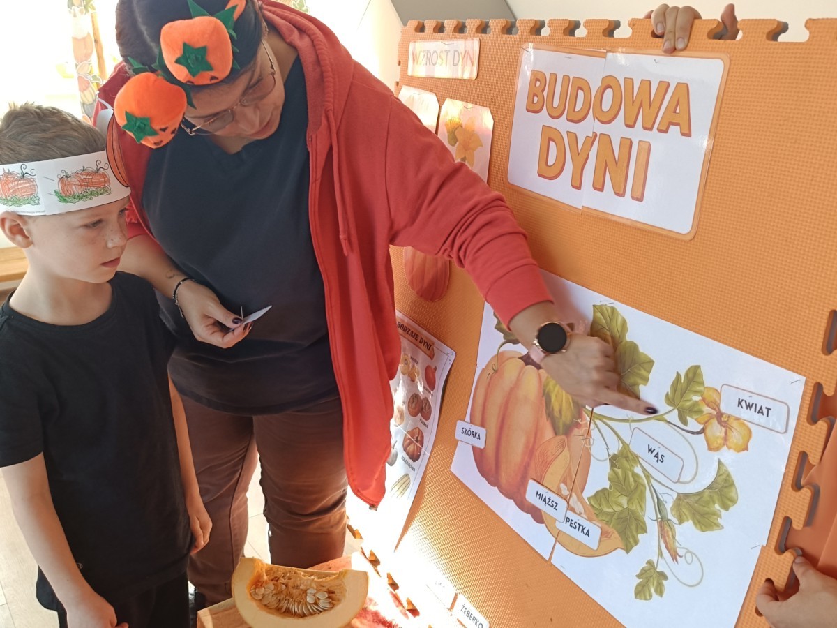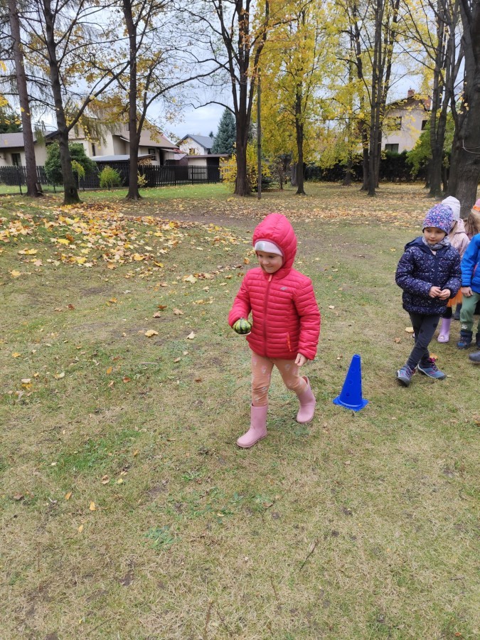 Dzieci z wszystkich grup poznały ciekawostki o dyniach, poznały budowę dyni, dowiedziały się jakie są rodzaje i odmiany dyni. Nie zabrakło zabaw muzyczno-ruchowych po polsku i po angielsku, tańców i zabaw matematycznych. Dzieci odszukiwały cienie, układały rytmy z dyń, wyszukiwały dynie w pudełku sensorycznym a także odkrywały ukryte przetwory z dyni przy pomocy latarek. Na koniec była gra terenowa oraz zabawy z dyniami i pomarańczowymi balonami w ogrodzie przedszkolnym zakończone tańcem na liściach do piosenki po angielsku "Fall freeze". Zabawa trwała dopóki z ogrodu nie przegonił nas jesienny deszcz. Wtedy przyszedł czas na obiad i pyszną zupkę dyniową!:)