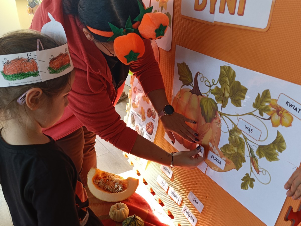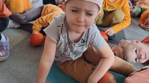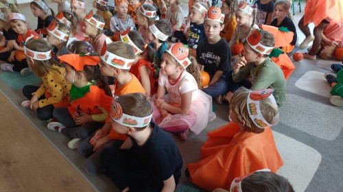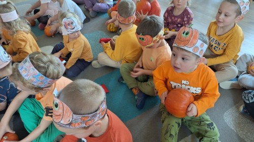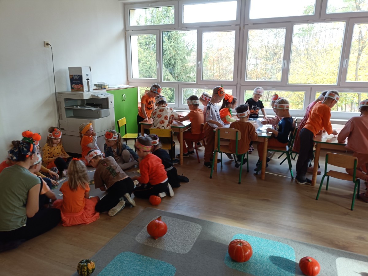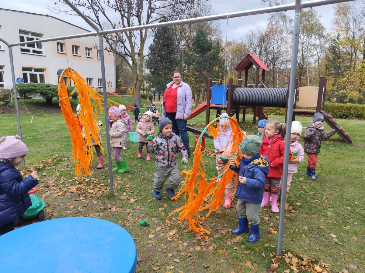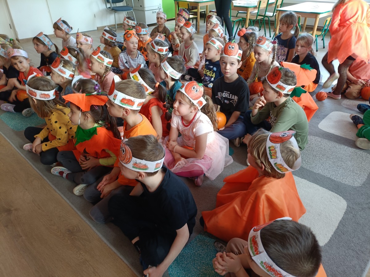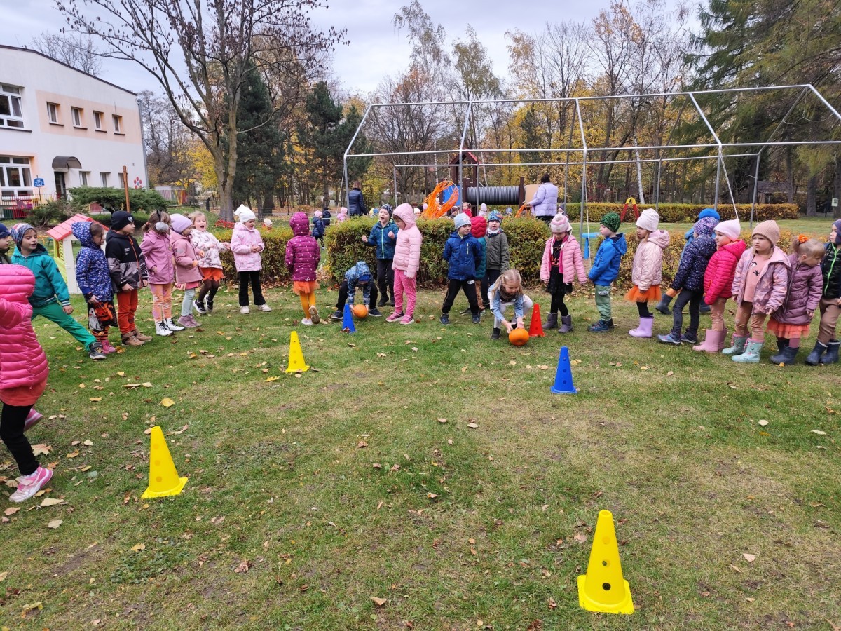 Dzieci z wszystkich grup poznały ciekawostki o dyniach, poznały budowę dyni, dowiedziały się jakie są rodzaje i odmiany dyni. Nie zabrakło zabaw muzyczno-ruchowych po polsku i po angielsku, tańców i zabaw matematycznych. Dzieci odszukiwały cienie, układały rytmy z dyń, wyszukiwały dynie w pudełku sensorycznym a także odkrywały ukryte przetwory z dyni przy pomocy latarek. Na koniec była gra terenowa oraz zabawy z dyniami i pomarańczowymi balonami w ogrodzie przedszkolnym zakończone tańcem na liściach do piosenki po angielsku "Fall freeze". Zabawa trwała dopóki z ogrodu nie przegonił nas jesienny deszcz. Wtedy przyszedł czas na obiad i pyszną zupkę dyniową!:)