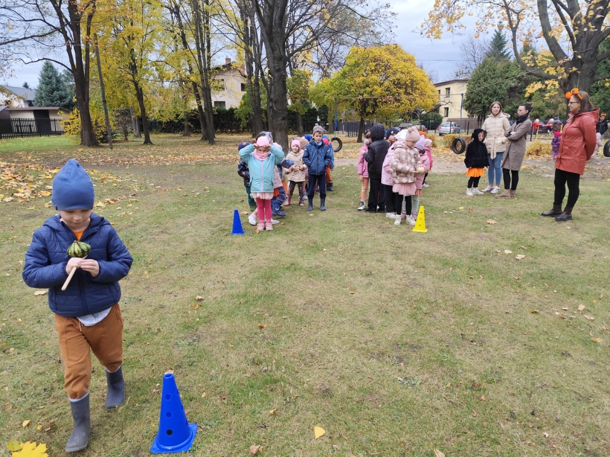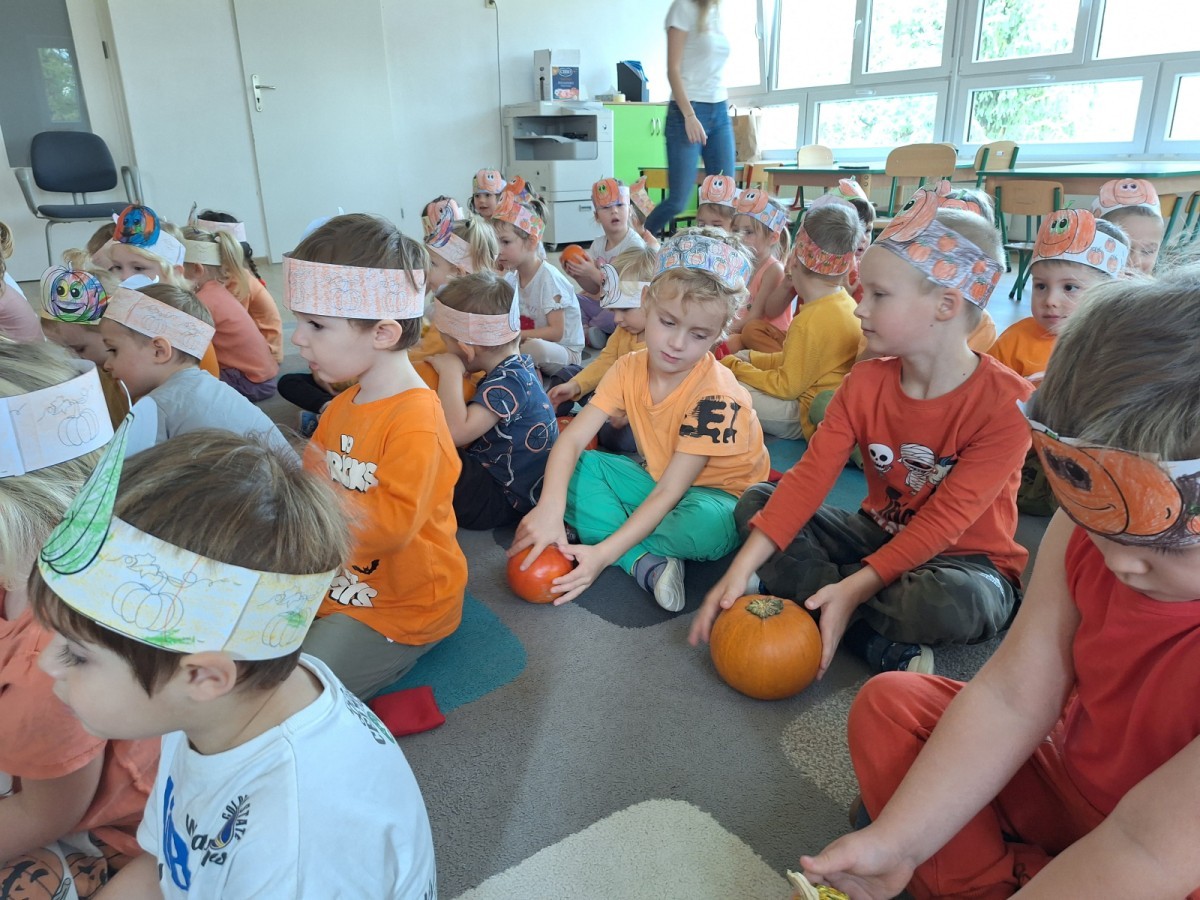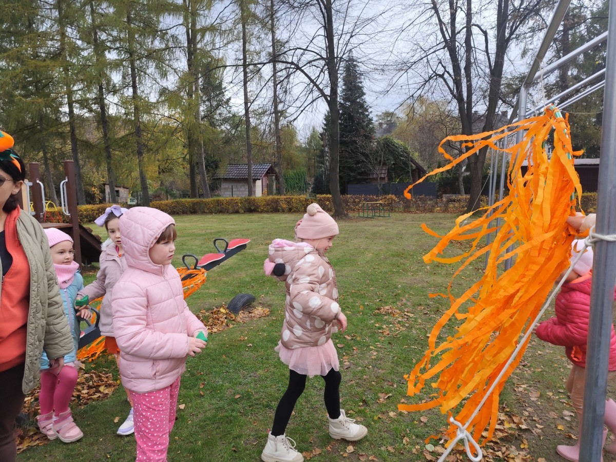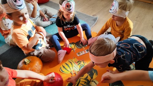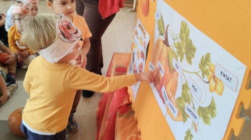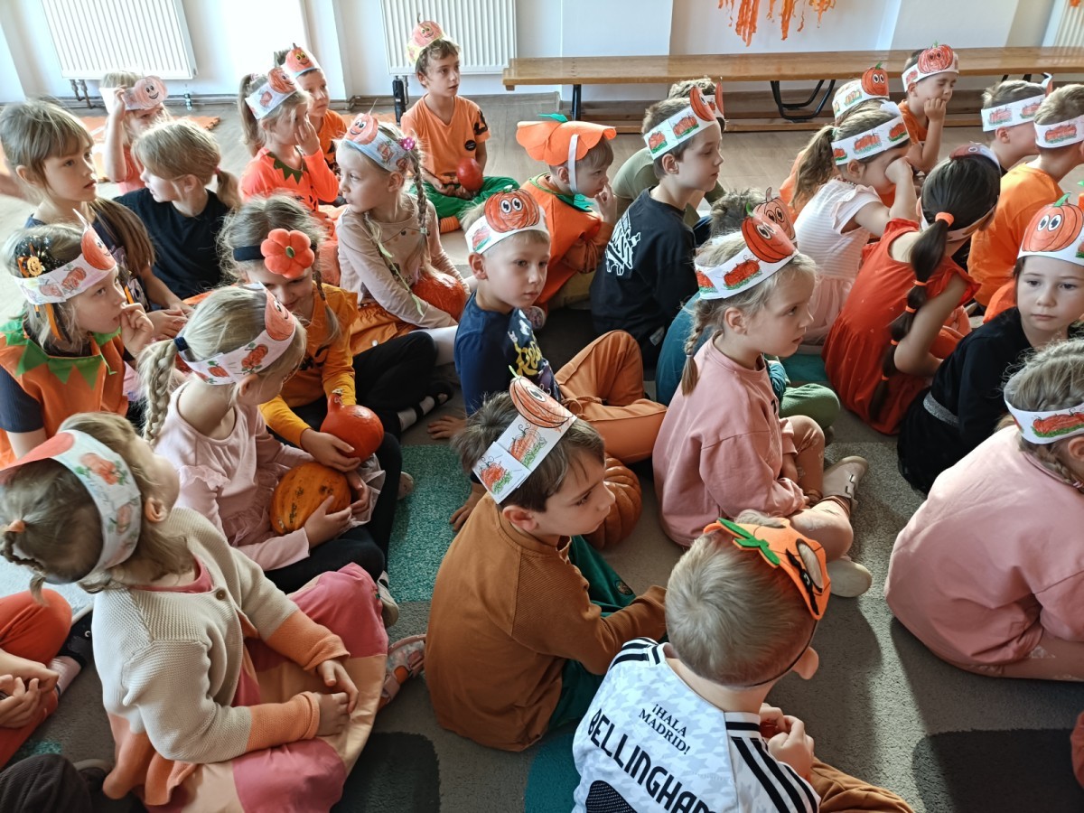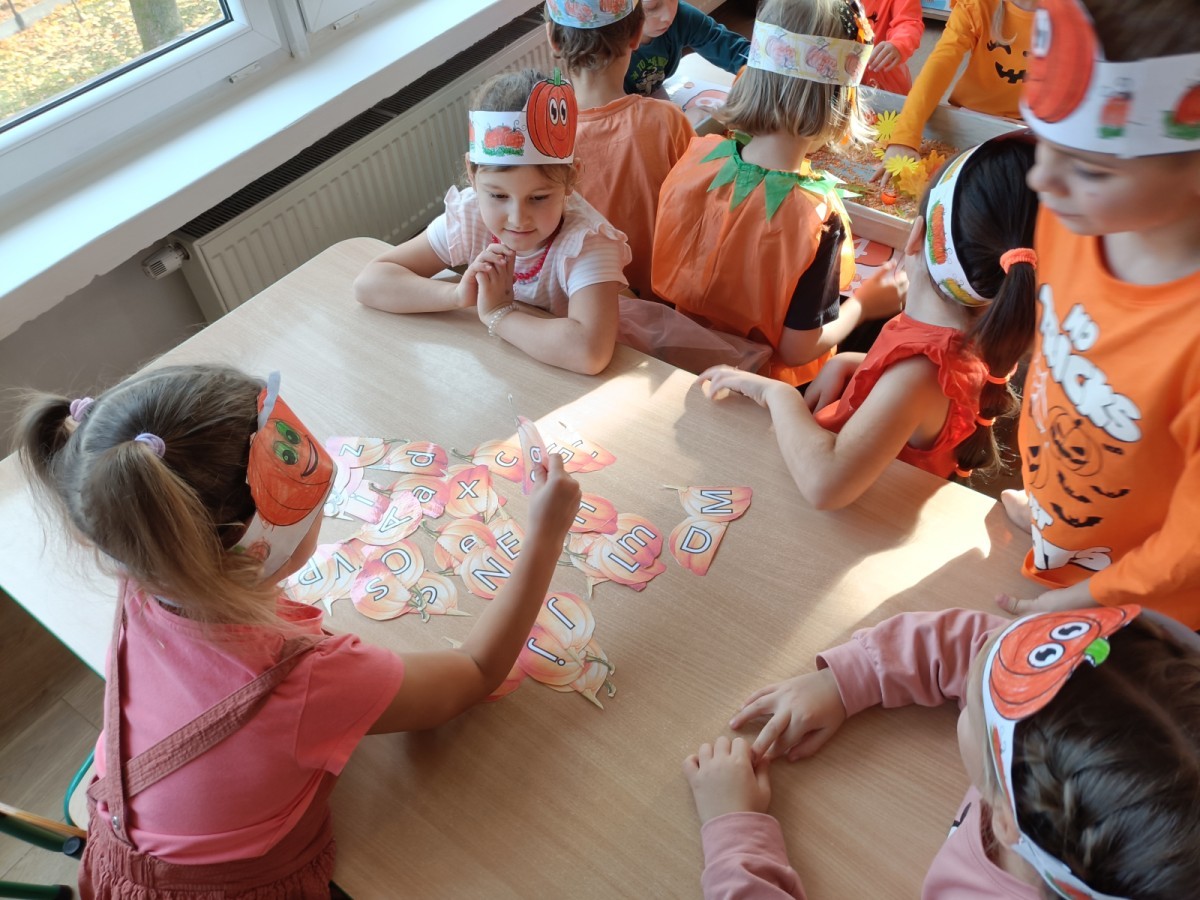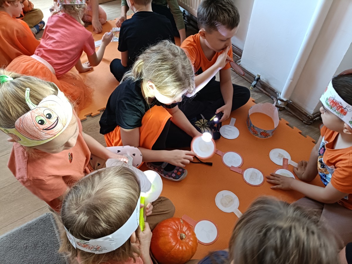 Dzieci z wszystkich grup poznały ciekawostki o dyniach, poznały budowę dyni, dowiedziały się jakie są rodzaje i odmiany dyni. Nie zabrakło zabaw muzyczno-ruchowych po polsku i po angielsku, tańców i zabaw matematycznych. Dzieci odszukiwały cienie, układały rytmy z dyń, wyszukiwały dynie w pudełku sensorycznym a także odkrywały ukryte przetwory z dyni przy pomocy latarek. Na koniec była gra terenowa oraz zabawy z dyniami i pomarańczowymi balonami w ogrodzie przedszkolnym zakończone tańcem na liściach do piosenki po angielsku "Fall freeze". Zabawa trwała dopóki z ogrodu nie przegonił nas jesienny deszcz. Wtedy przyszedł czas na obiad i pyszną zupkę dyniową!:)