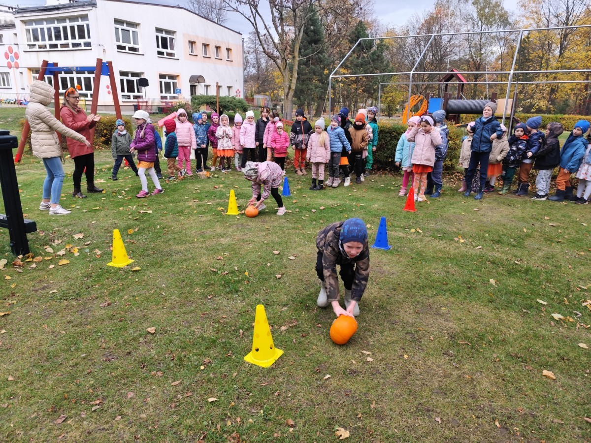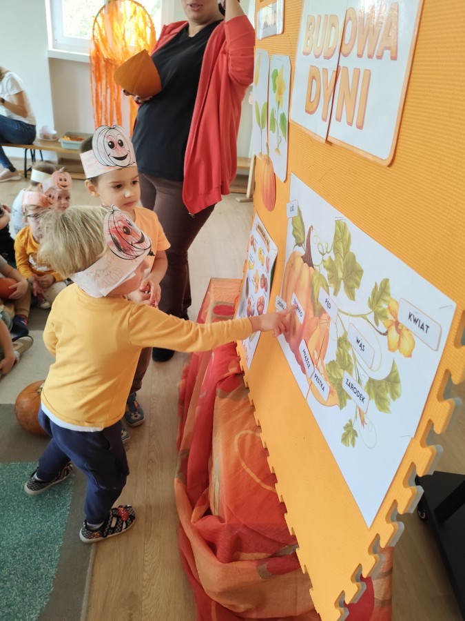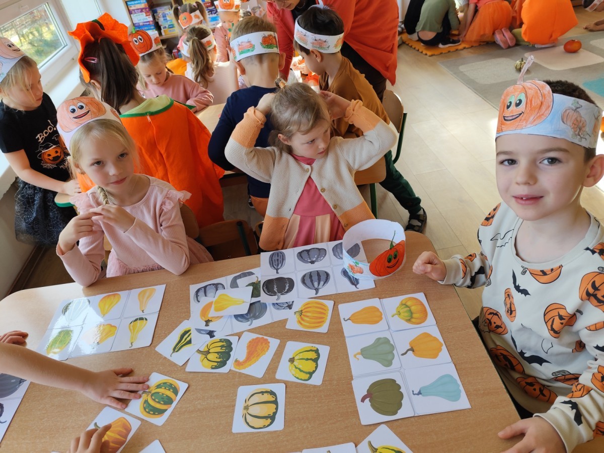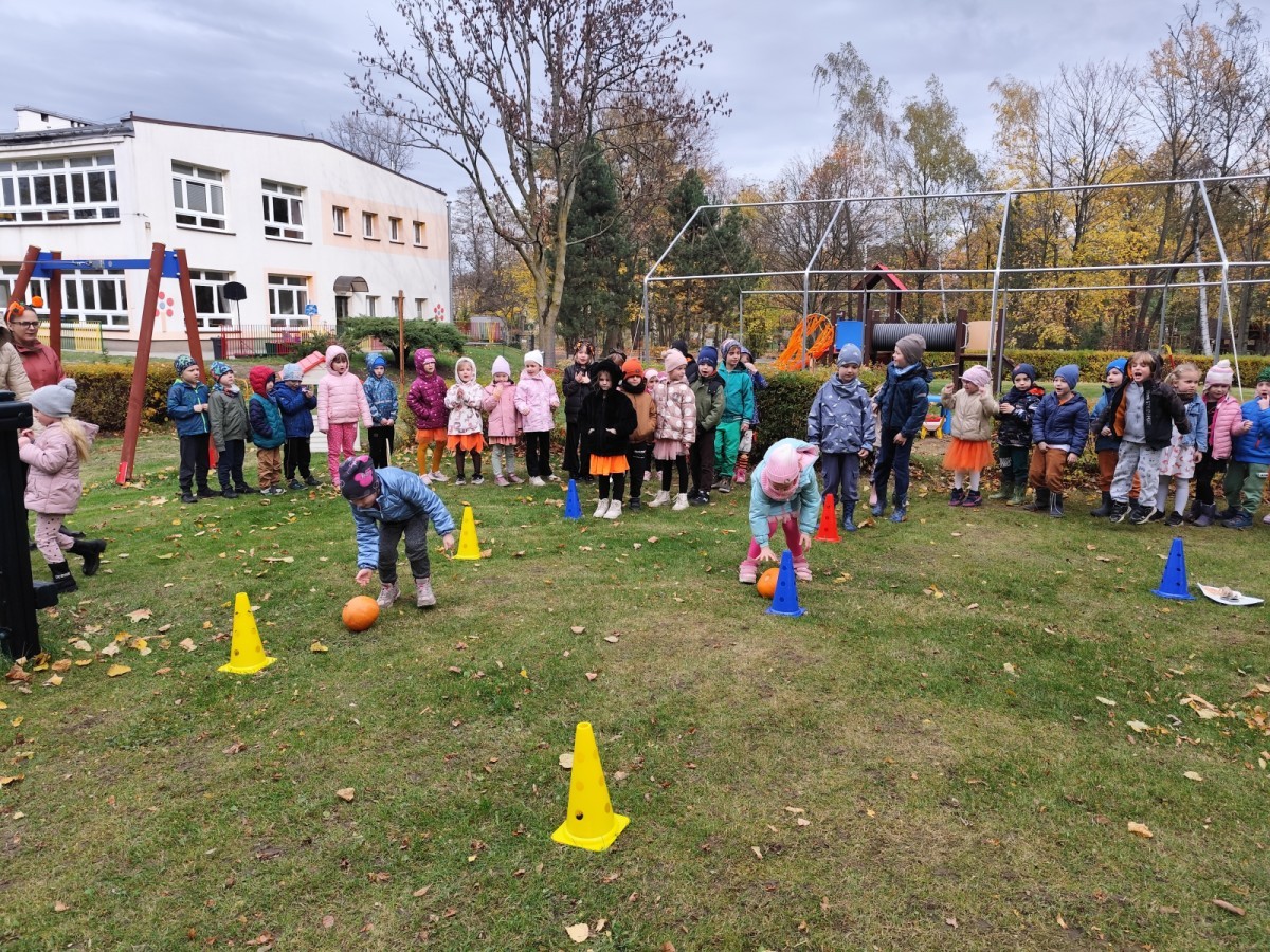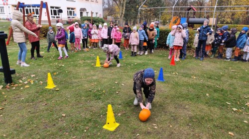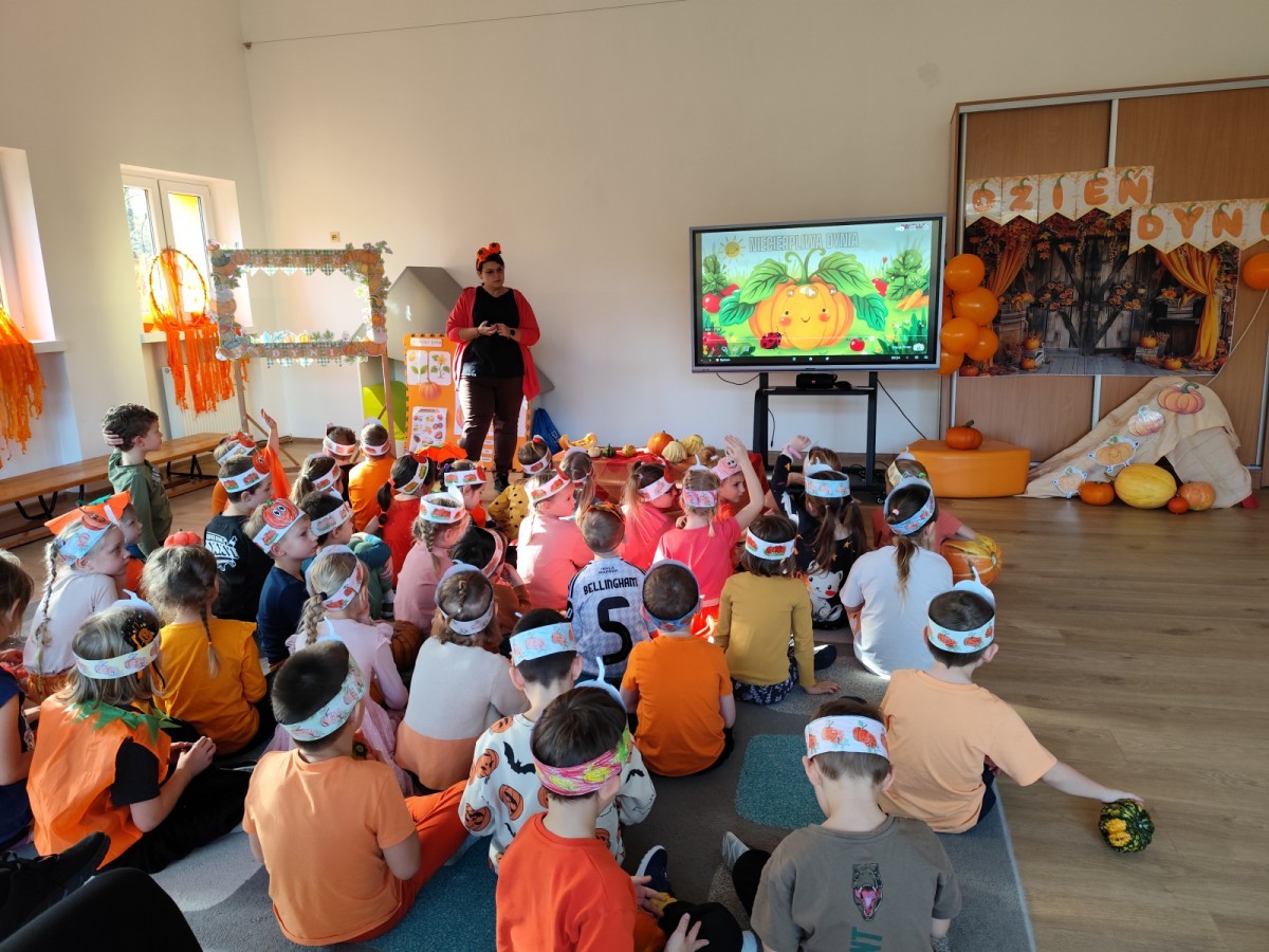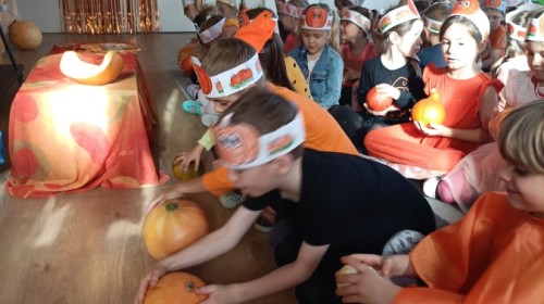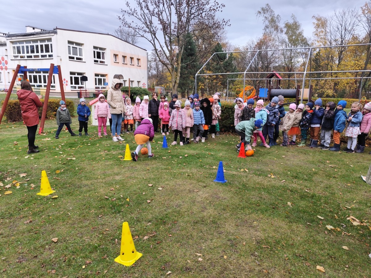 Dzieci z wszystkich grup poznały ciekawostki o dyniach, poznały budowę dyni, dowiedziały się jakie są rodzaje i odmiany dyni. Nie zabrakło zabaw muzyczno-ruchowych po polsku i po angielsku, tańców i zabaw matematycznych. Dzieci odszukiwały cienie, układały rytmy z dyń, wyszukiwały dynie w pudełku sensorycznym a także odkrywały ukryte przetwory z dyni przy pomocy latarek. Na koniec była gra terenowa oraz zabawy z dyniami i pomarańczowymi balonami w ogrodzie przedszkolnym zakończone tańcem na liściach do piosenki po angielsku "Fall freeze". Zabawa trwała dopóki z ogrodu nie przegonił nas jesienny deszcz. Wtedy przyszedł czas na obiad i pyszną zupkę dyniową!:)