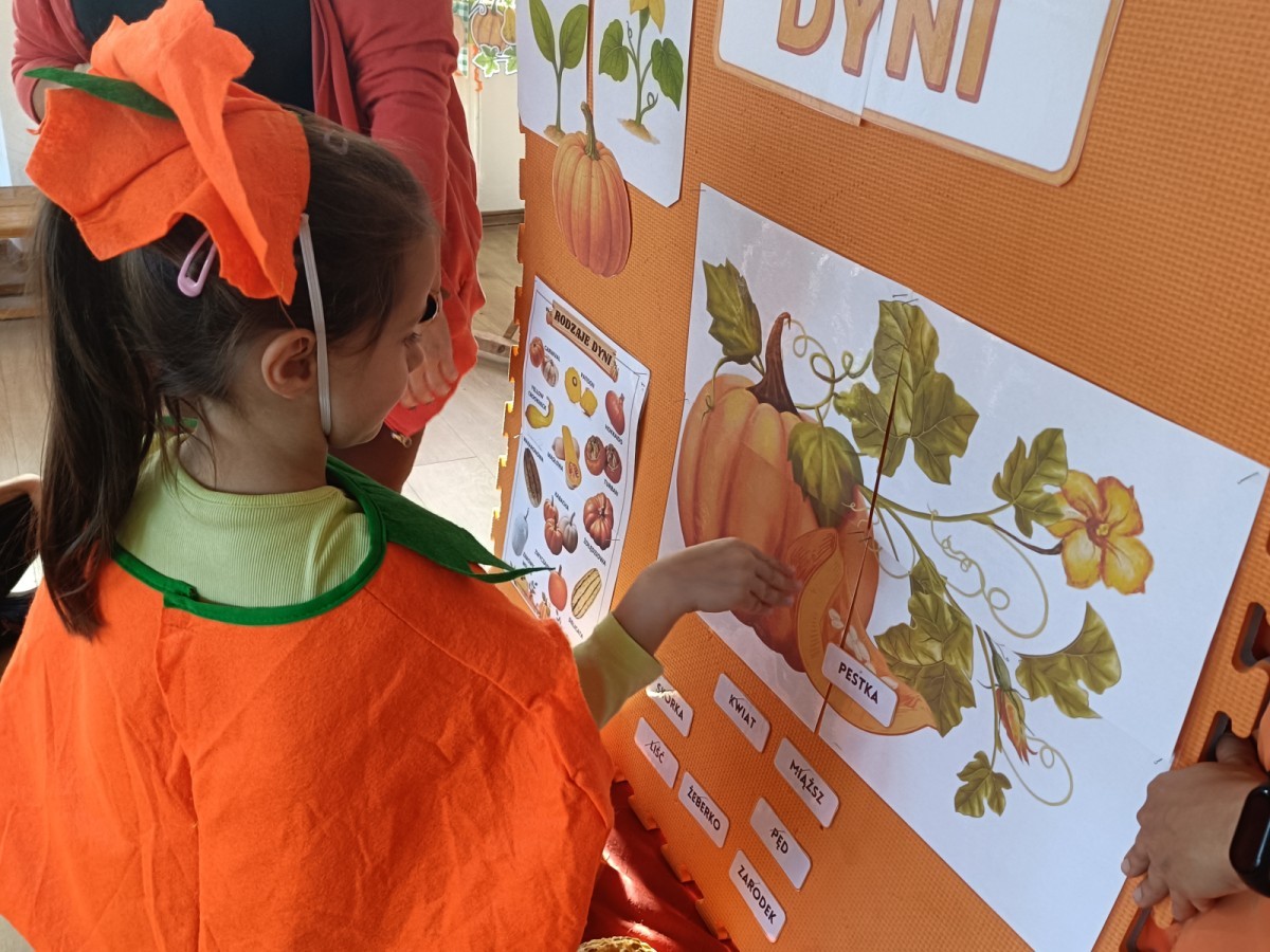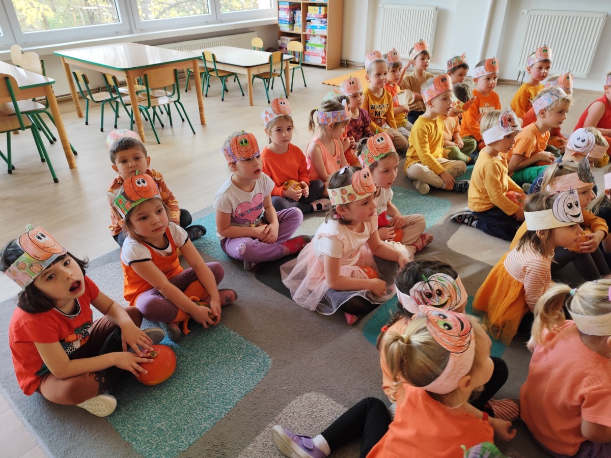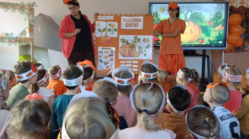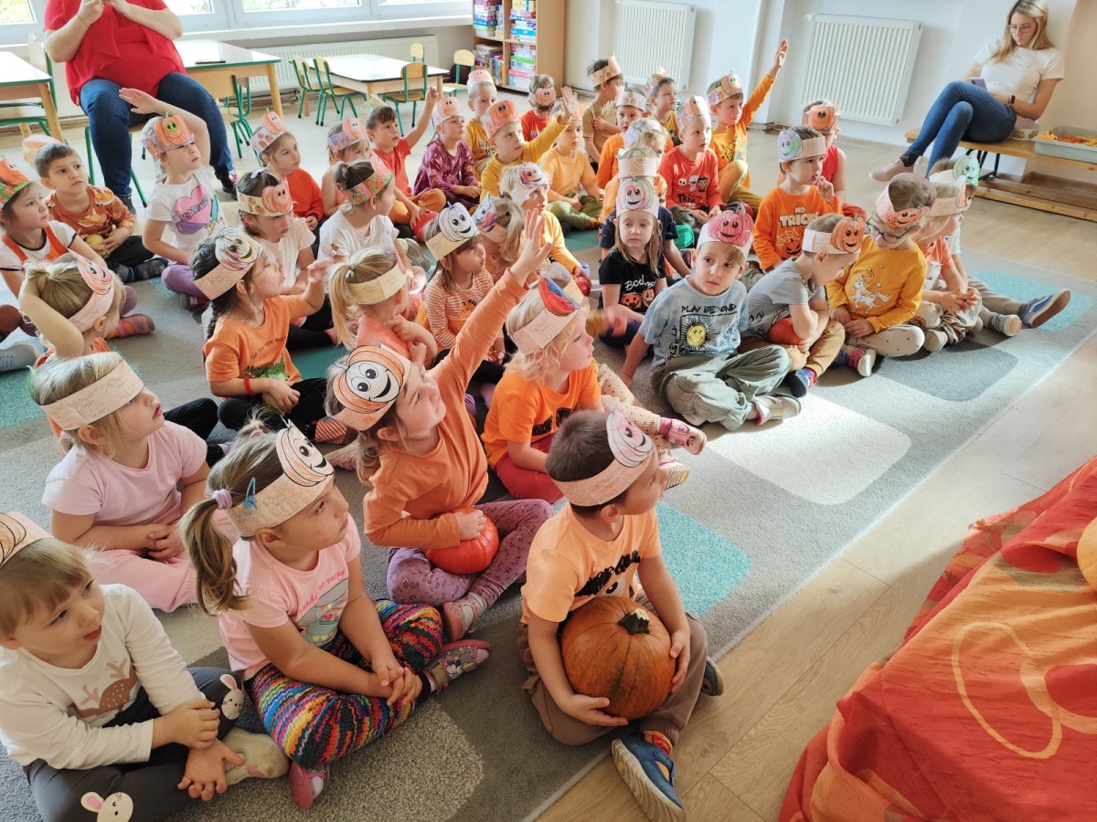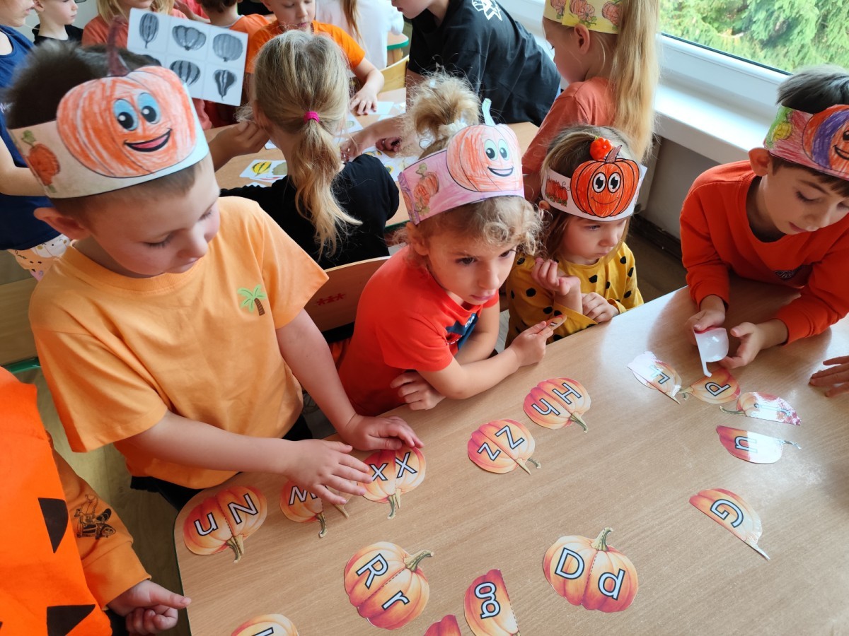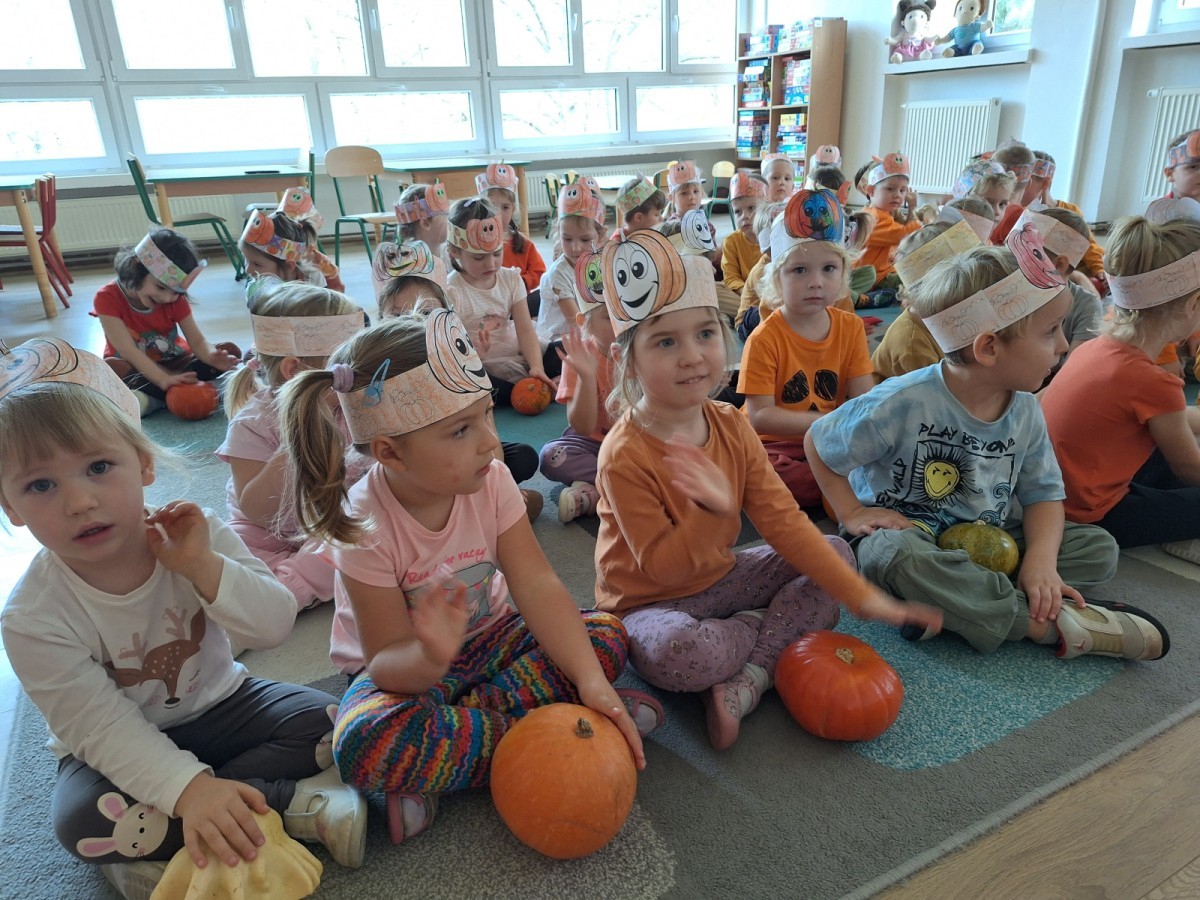 Dzieci z wszystkich grup poznały ciekawostki o dyniach, poznały budowę dyni, dowiedziały się jakie są rodzaje i odmiany dyni. Nie zabrakło zabaw muzyczno-ruchowych po polsku i po angielsku, tańców i zabaw matematycznych. Dzieci odszukiwały cienie, układały rytmy z dyń, wyszukiwały dynie w pudełku sensorycznym a także odkrywały ukryte przetwory z dyni przy pomocy latarek. Na koniec była gra terenowa oraz zabawy z dyniami i pomarańczowymi balonami w ogrodzie przedszkolnym zakończone tańcem na liściach do piosenki po angielsku "Fall freeze". Zabawa trwała dopóki z ogrodu nie przegonił nas jesienny deszcz. Wtedy przyszedł czas na obiad i pyszną zupkę dyniową!:)