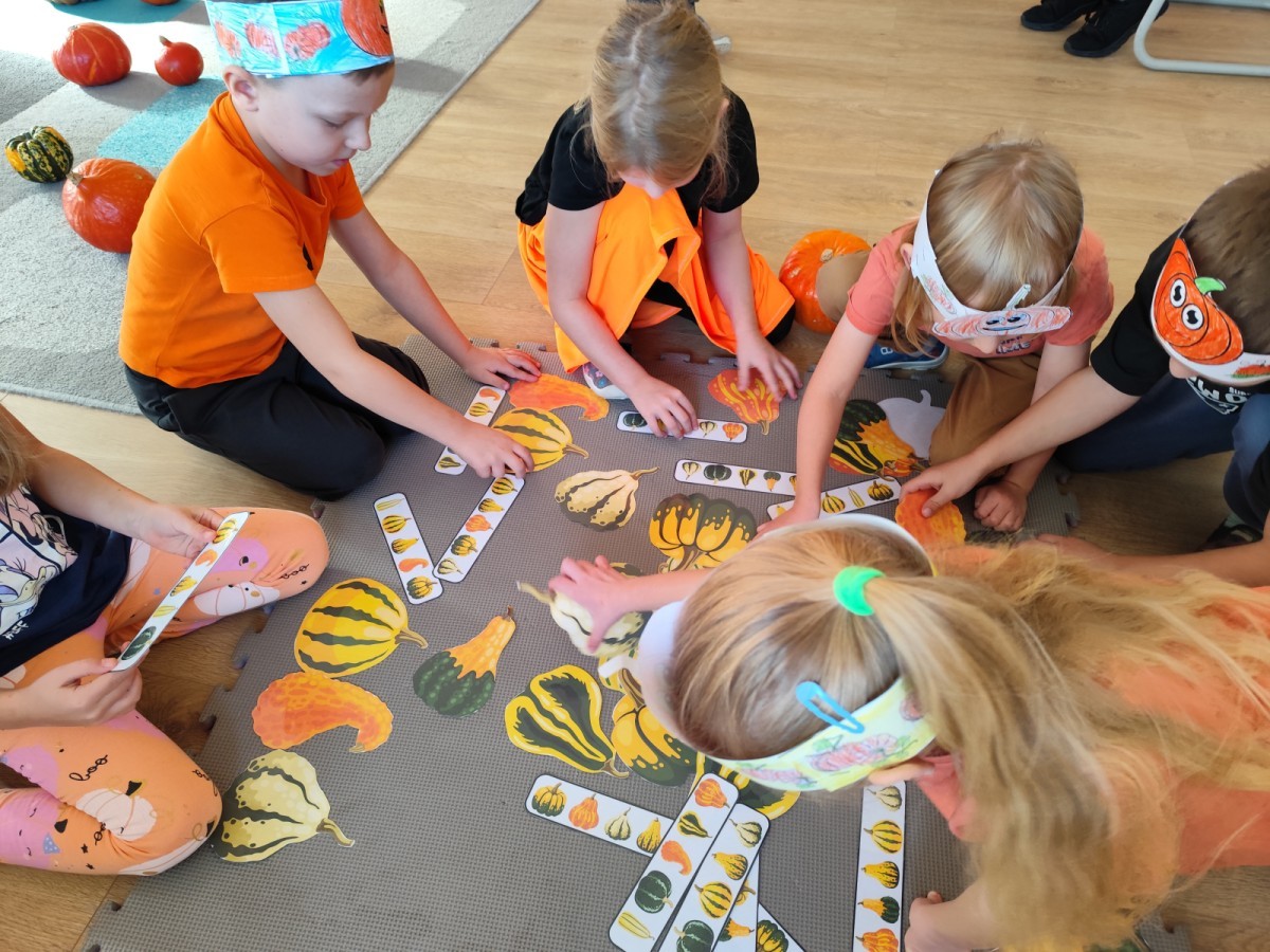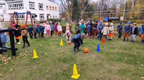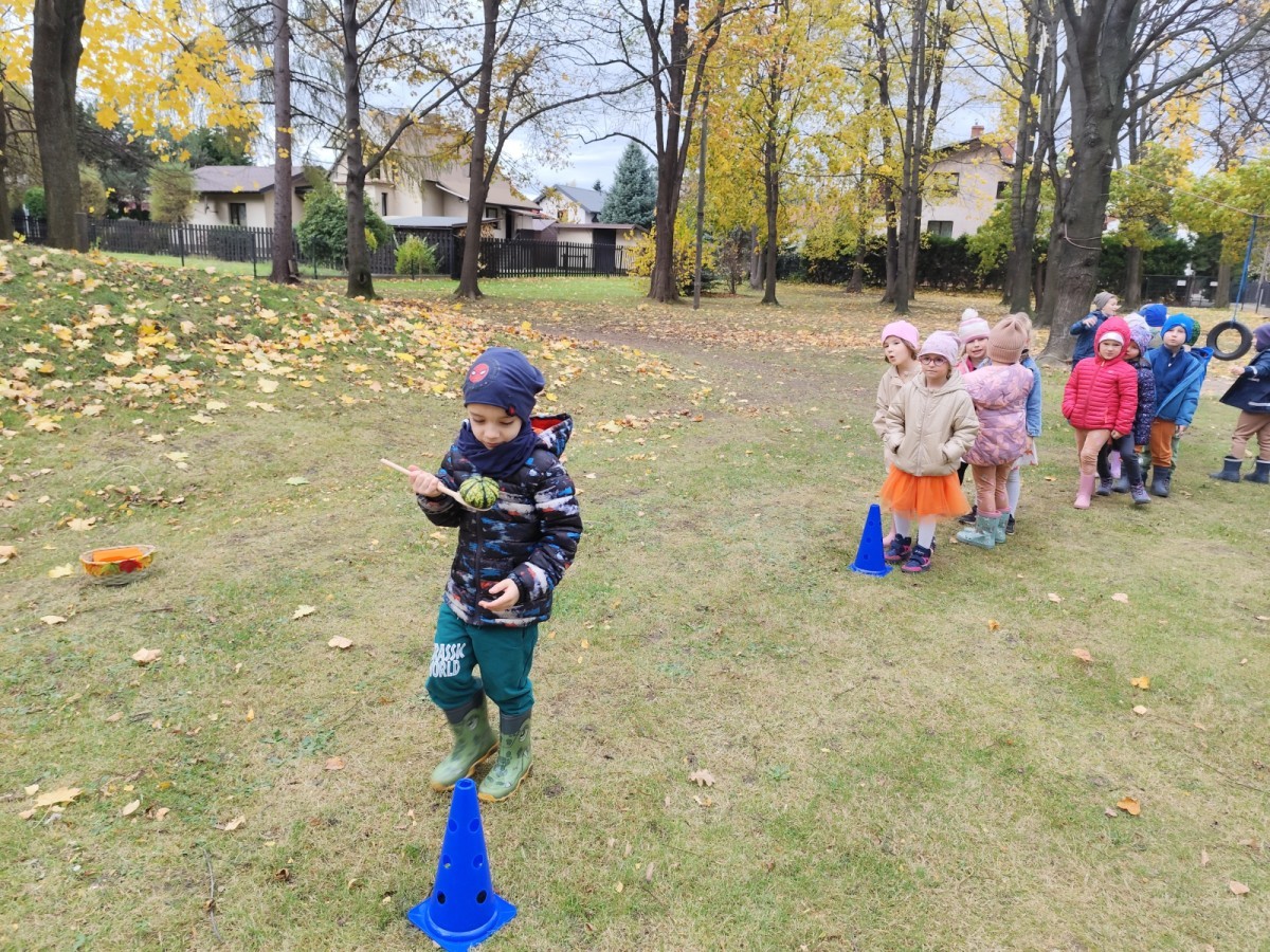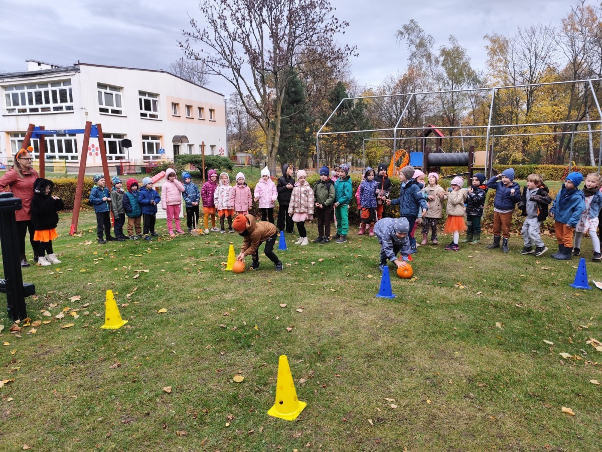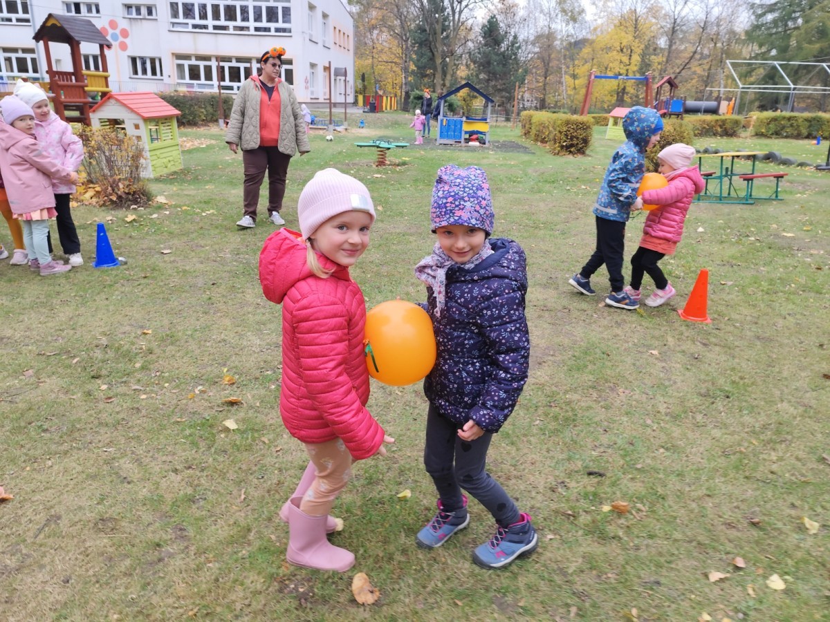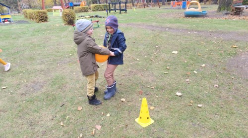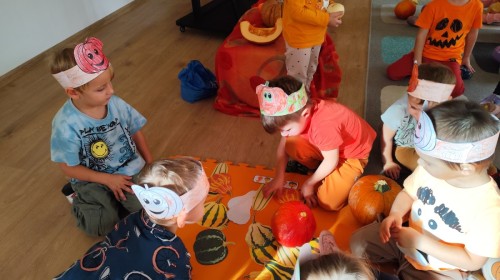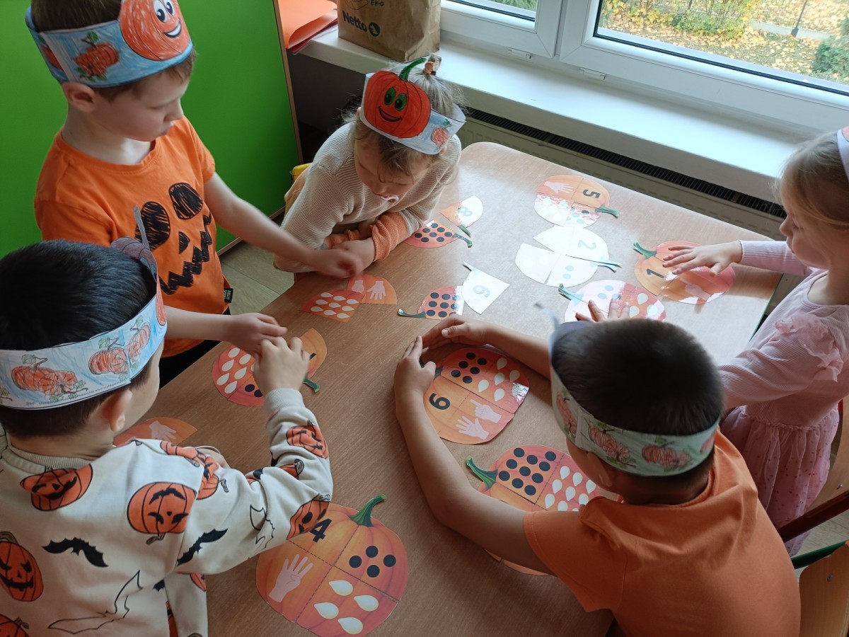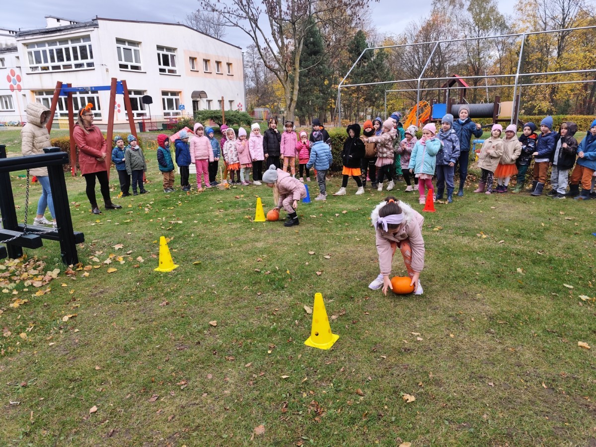Dzieci z wszystkich grup poznały ciekawostki o dyniach, poznały budowę dyni, dowiedziały się jakie są rodzaje i odmiany dyni. Nie zabrakło zabaw muzyczno-ruchowych po polsku i po angielsku, tańców i zabaw matematycznych. Dzieci odszukiwały cienie, układały rytmy z dyń, wyszukiwały dynie w pudełku sensorycznym a także odkrywały ukryte przetwory z dyni przy pomocy latarek. Na koniec była gra terenowa oraz zabawy z dyniami i pomarańczowymi balonami w ogrodzie przedszkolnym zakończone tańcem na liściach do piosenki po angielsku "Fall freeze". Zabawa trwała dopóki z ogrodu nie przegonił nas jesienny deszcz. Wtedy przyszedł czas na obiad i pyszną zupkę dyniową!:)