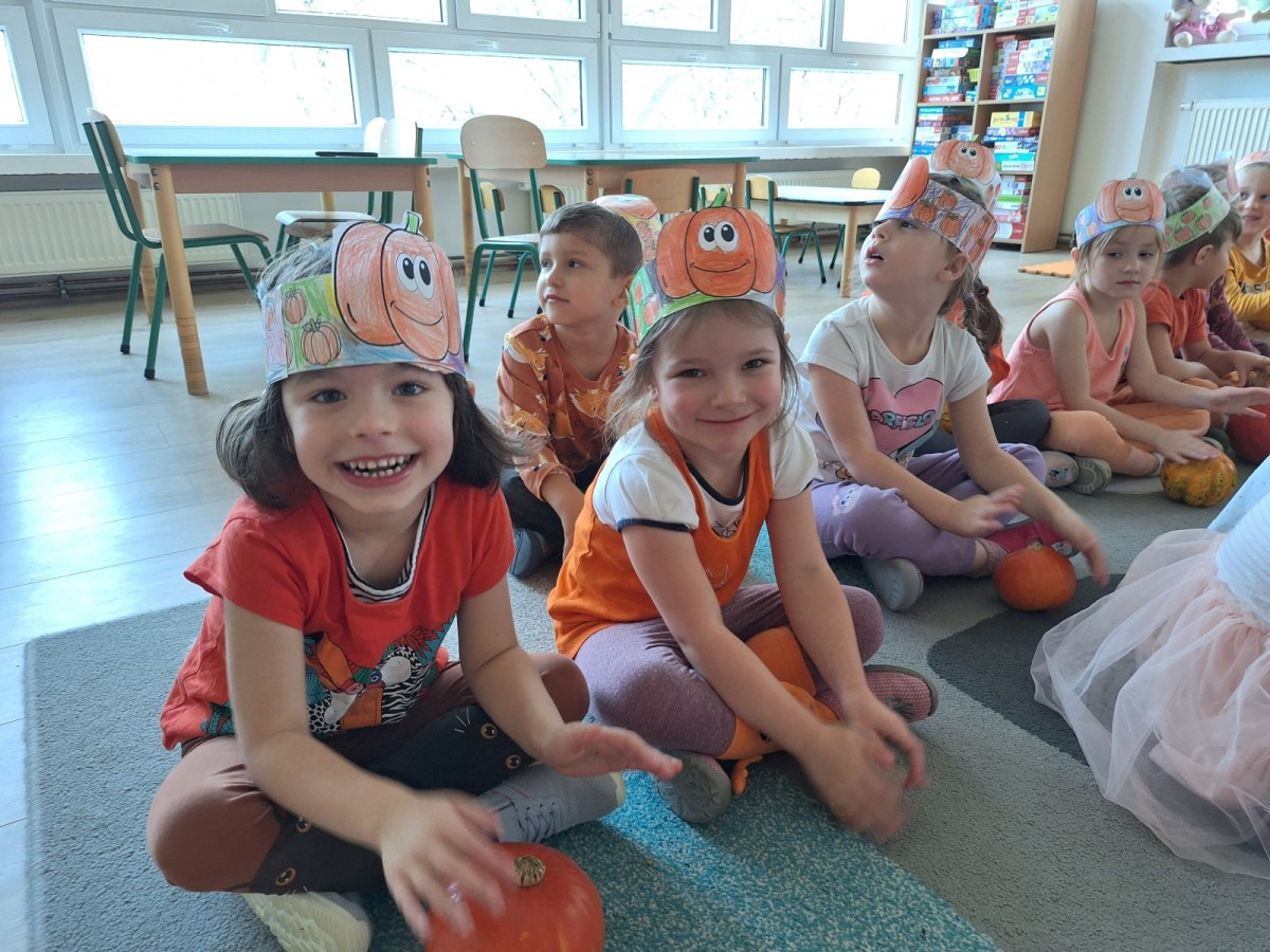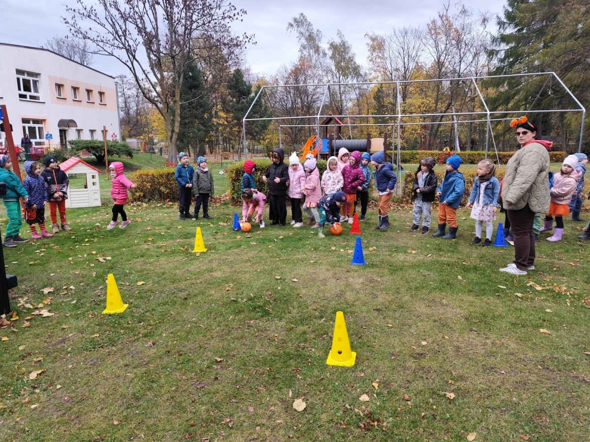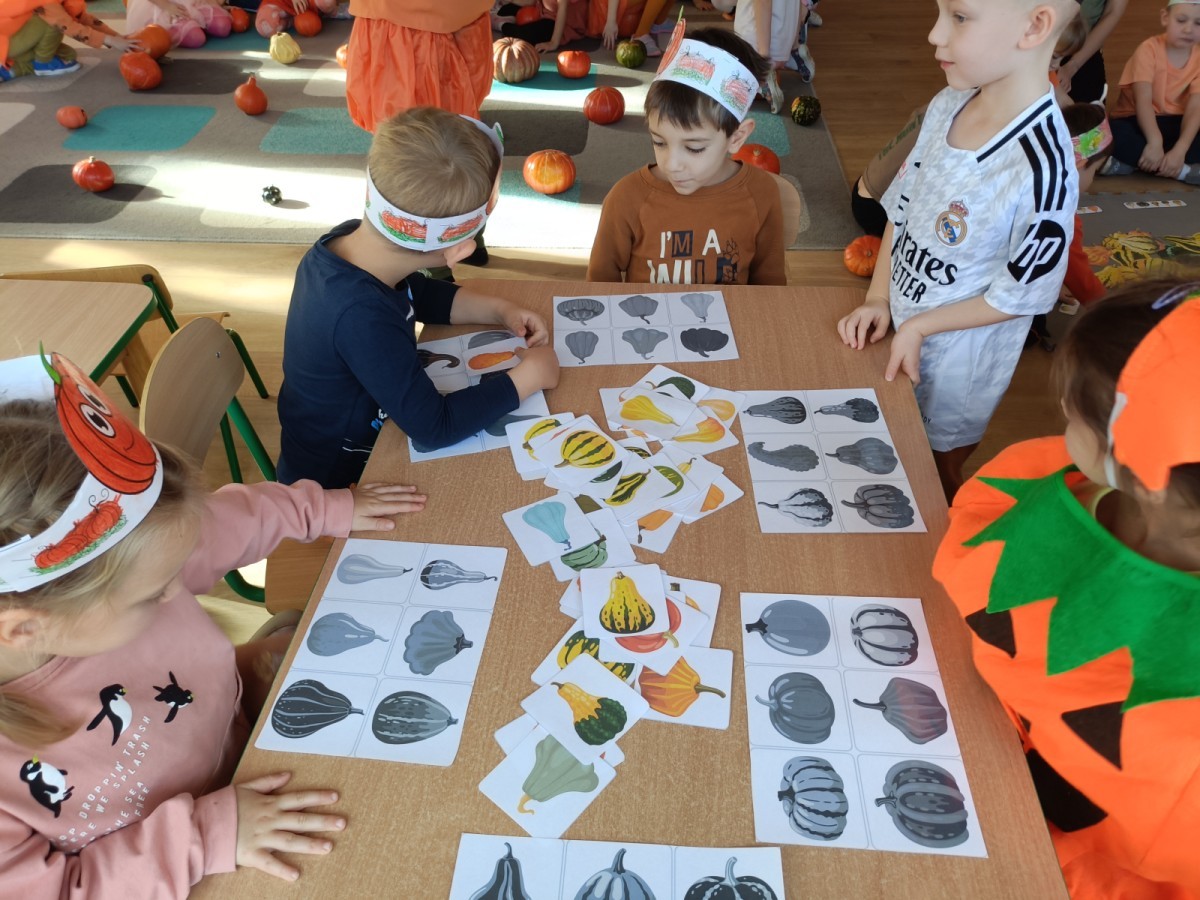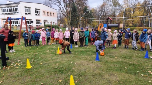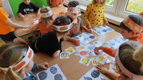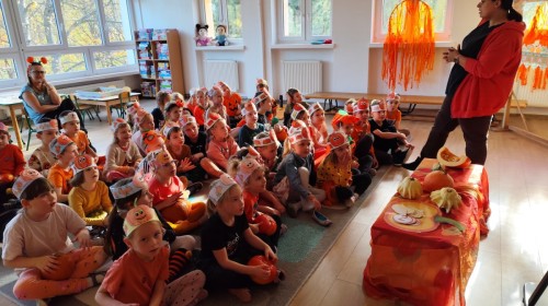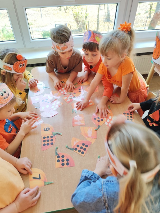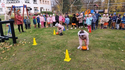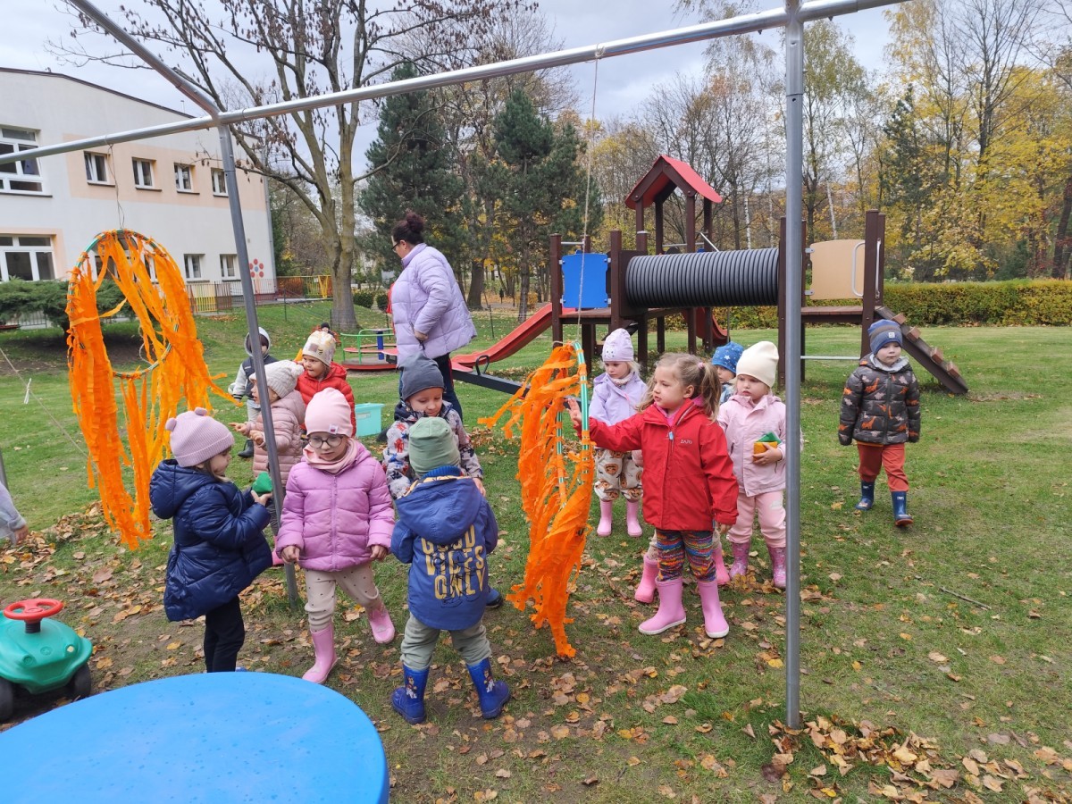 Dzieci z wszystkich grup poznały ciekawostki o dyniach, poznały budowę dyni, dowiedziały się jakie są rodzaje i odmiany dyni. Nie zabrakło zabaw muzyczno-ruchowych po polsku i po angielsku, tańców i zabaw matematycznych. Dzieci odszukiwały cienie, układały rytmy z dyń, wyszukiwały dynie w pudełku sensorycznym a także odkrywały ukryte przetwory z dyni przy pomocy latarek. Na koniec była gra terenowa oraz zabawy z dyniami i pomarańczowymi balonami w ogrodzie przedszkolnym zakończone tańcem na liściach do piosenki po angielsku "Fall freeze". Zabawa trwała dopóki z ogrodu nie przegonił nas jesienny deszcz. Wtedy przyszedł czas na obiad i pyszną zupkę dyniową!:)