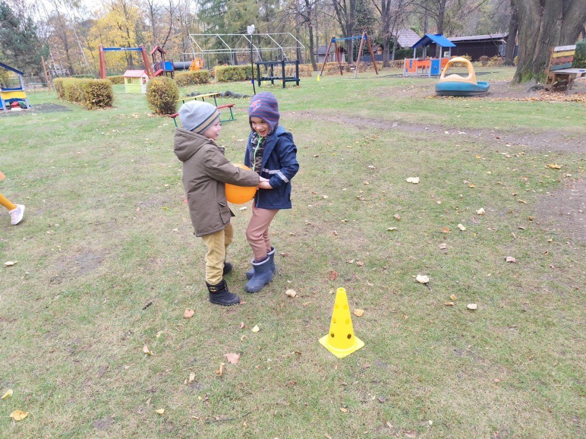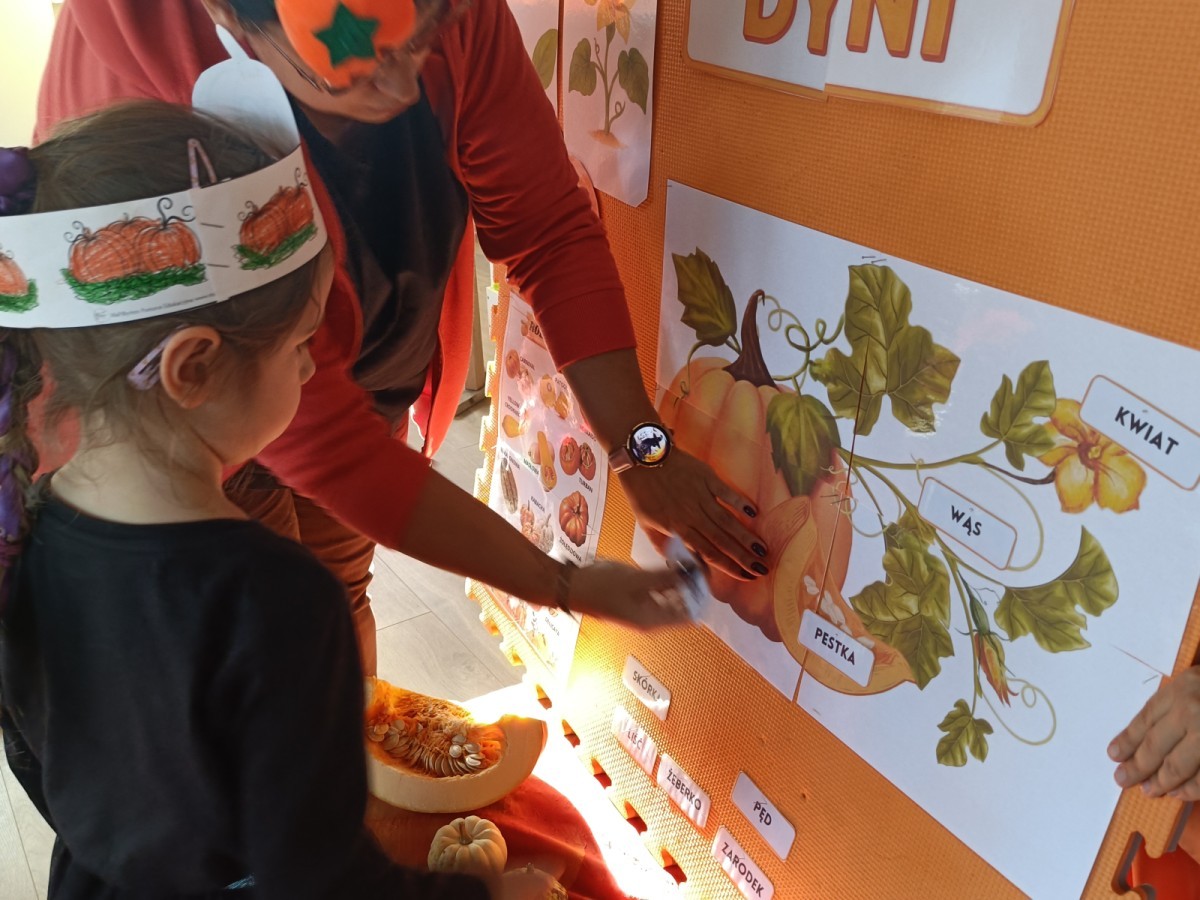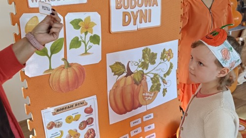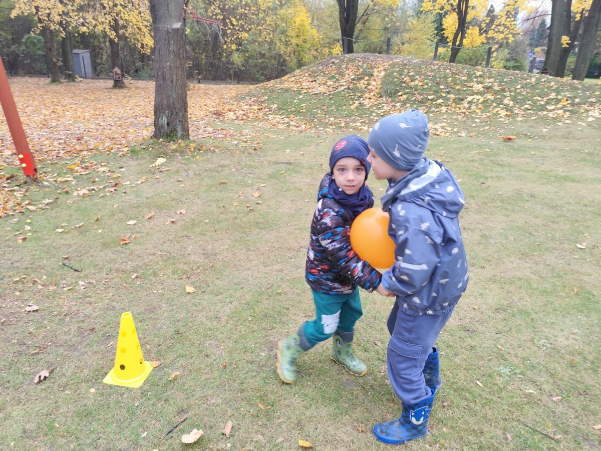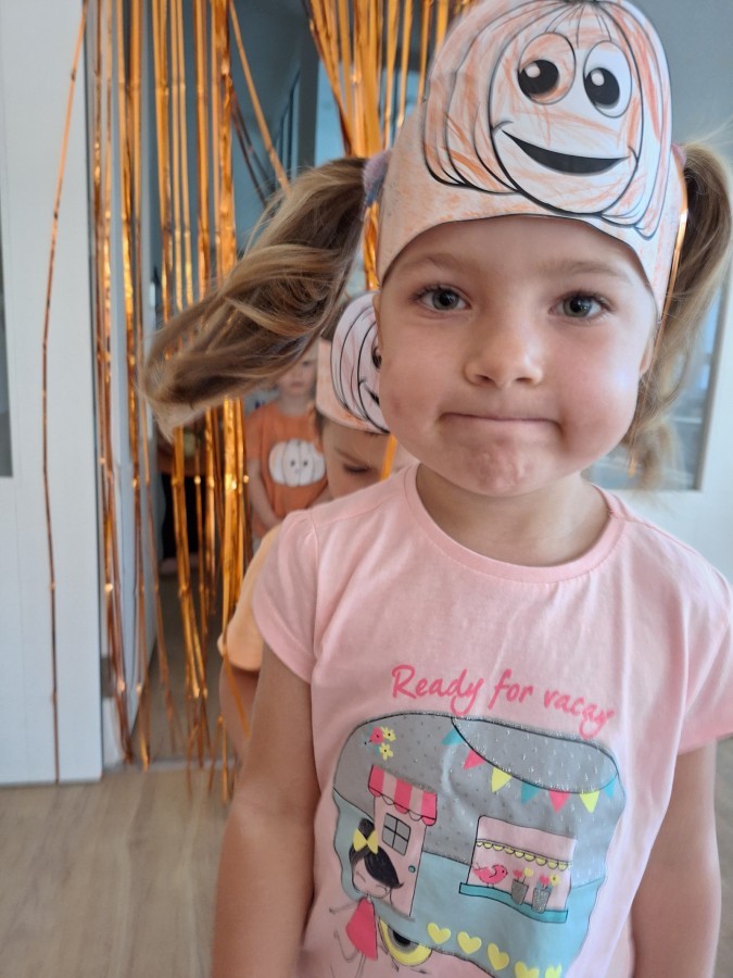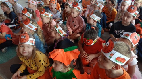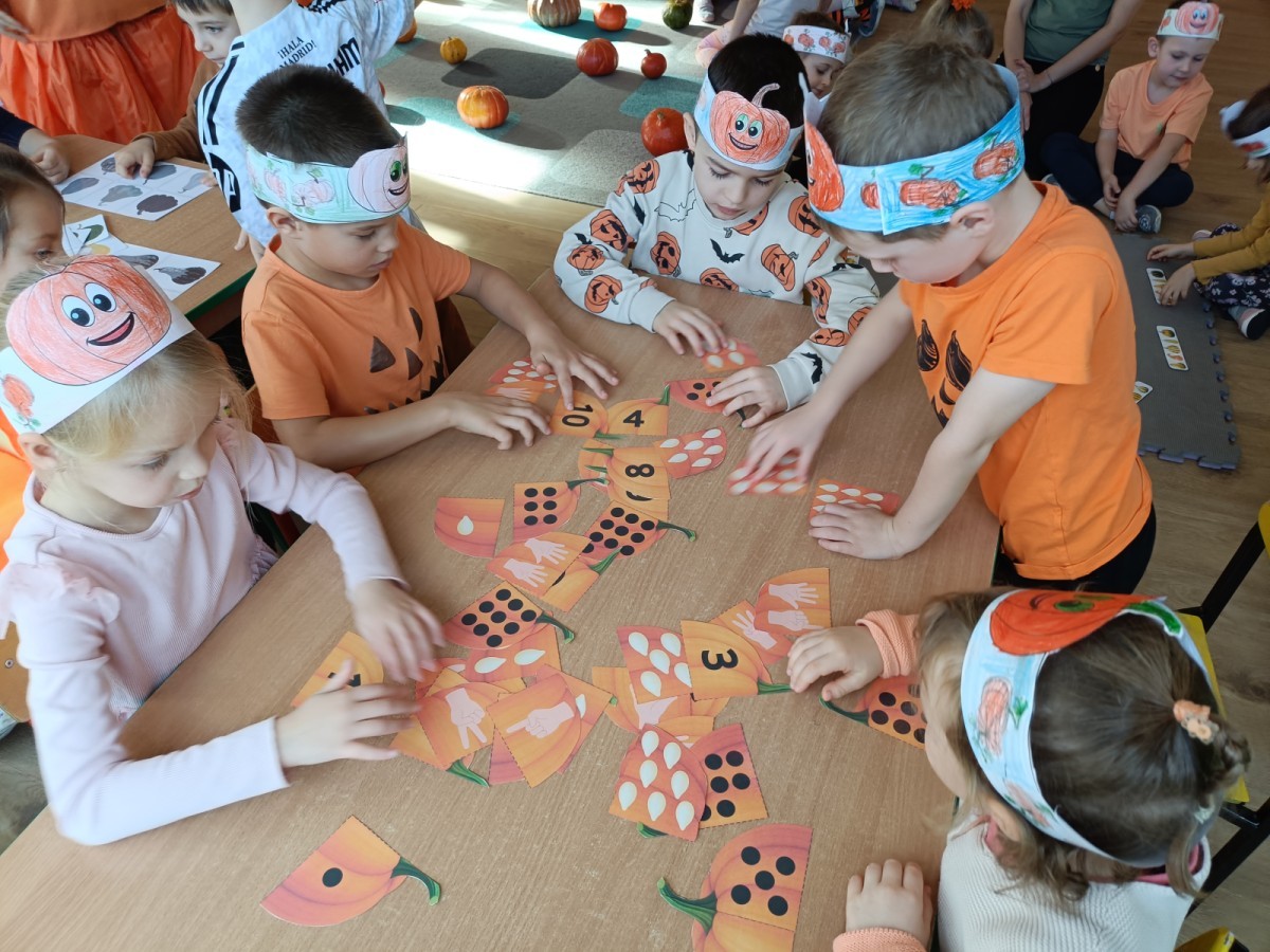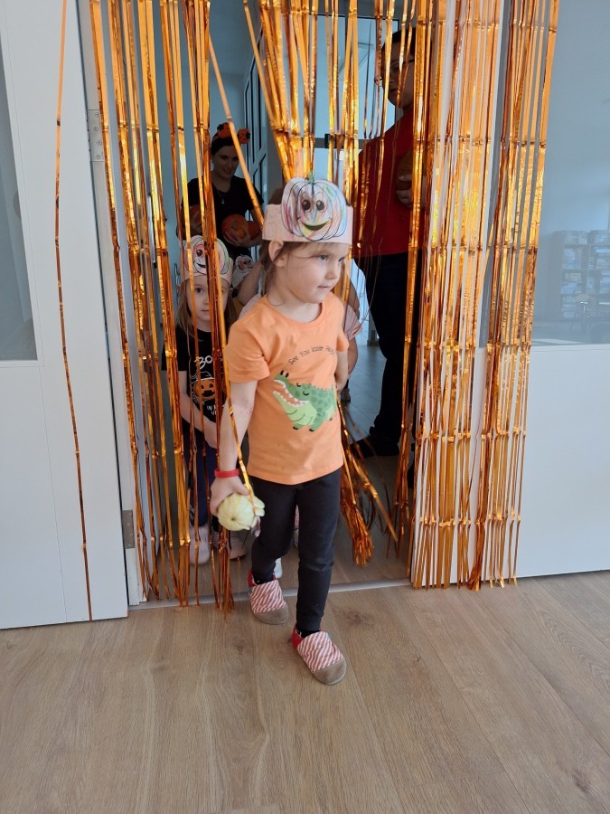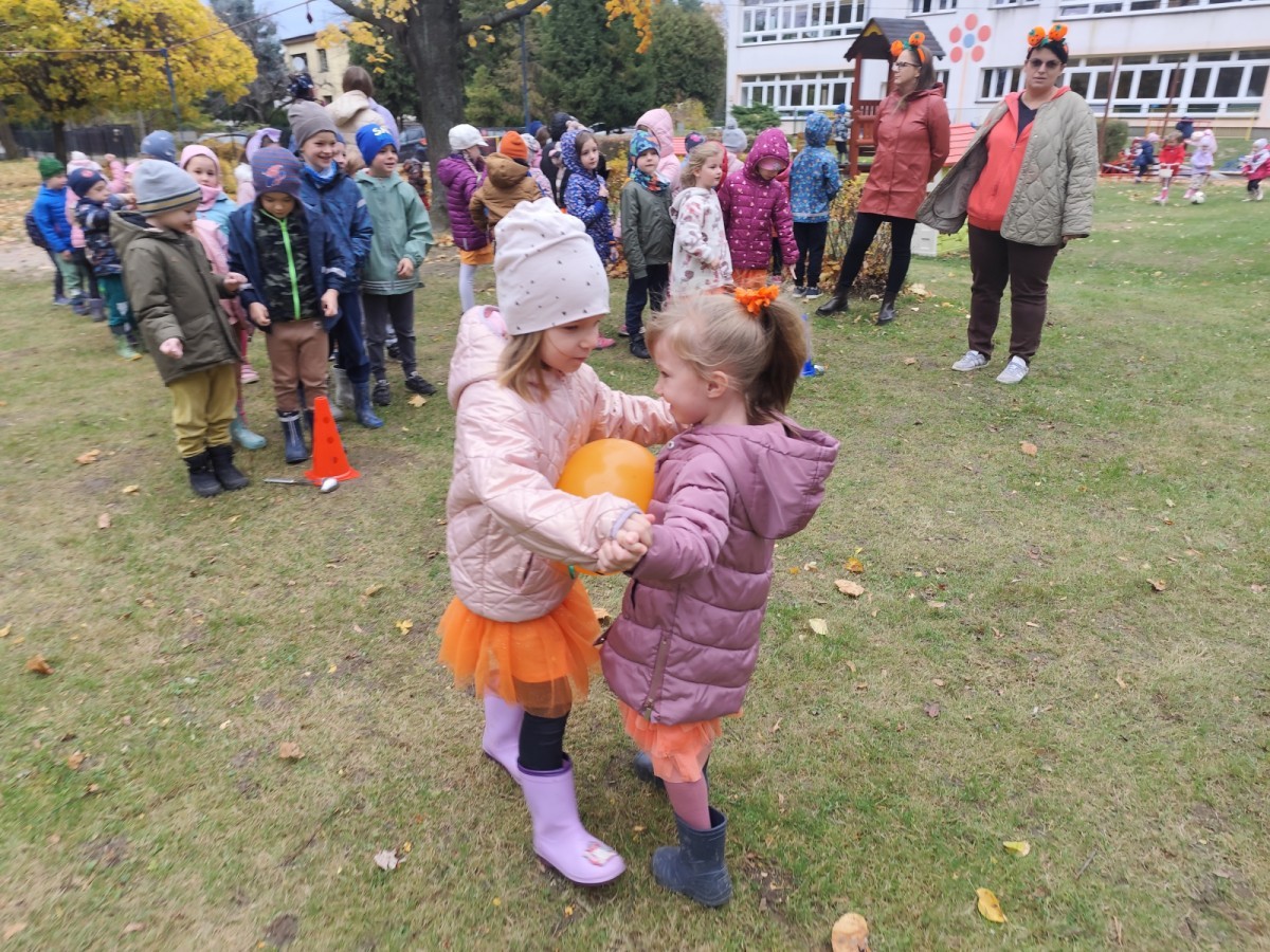 Dzieci z wszystkich grup poznały ciekawostki o dyniach, poznały budowę dyni, dowiedziały się jakie są rodzaje i odmiany dyni. Nie zabrakło zabaw muzyczno-ruchowych po polsku i po angielsku, tańców i zabaw matematycznych. Dzieci odszukiwały cienie, układały rytmy z dyń, wyszukiwały dynie w pudełku sensorycznym a także odkrywały ukryte przetwory z dyni przy pomocy latarek. Na koniec była gra terenowa oraz zabawy z dyniami i pomarańczowymi balonami w ogrodzie przedszkolnym zakończone tańcem na liściach do piosenki po angielsku "Fall freeze". Zabawa trwała dopóki z ogrodu nie przegonił nas jesienny deszcz. Wtedy przyszedł czas na obiad i pyszną zupkę dyniową!:)