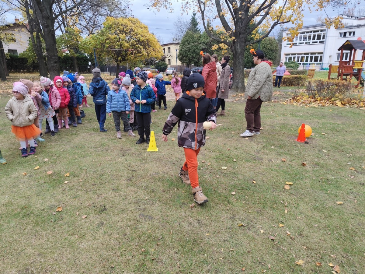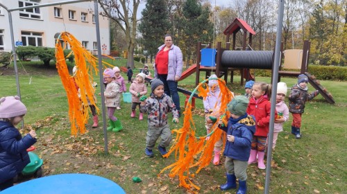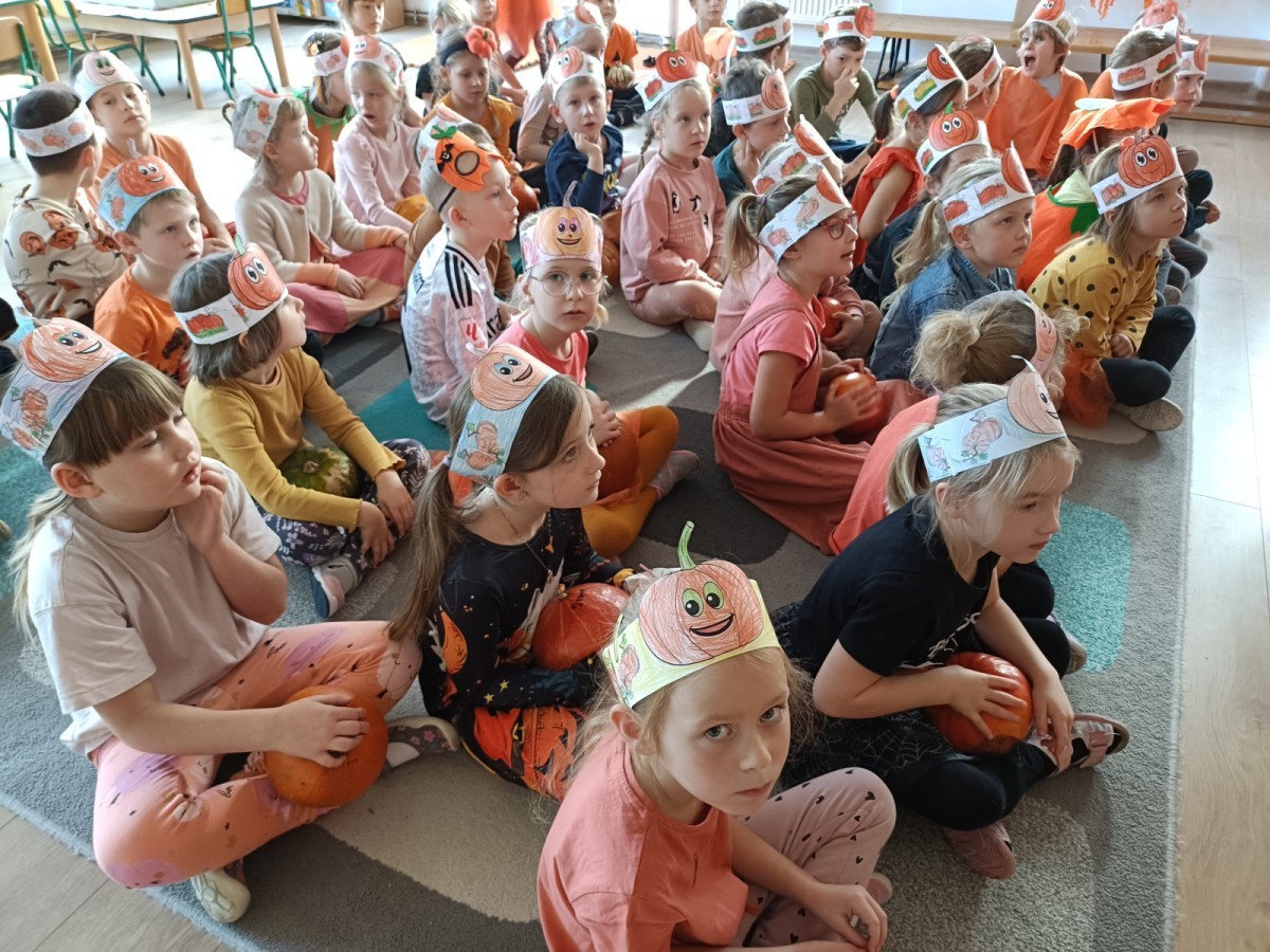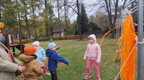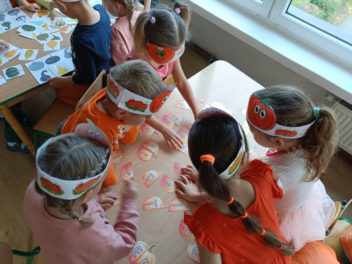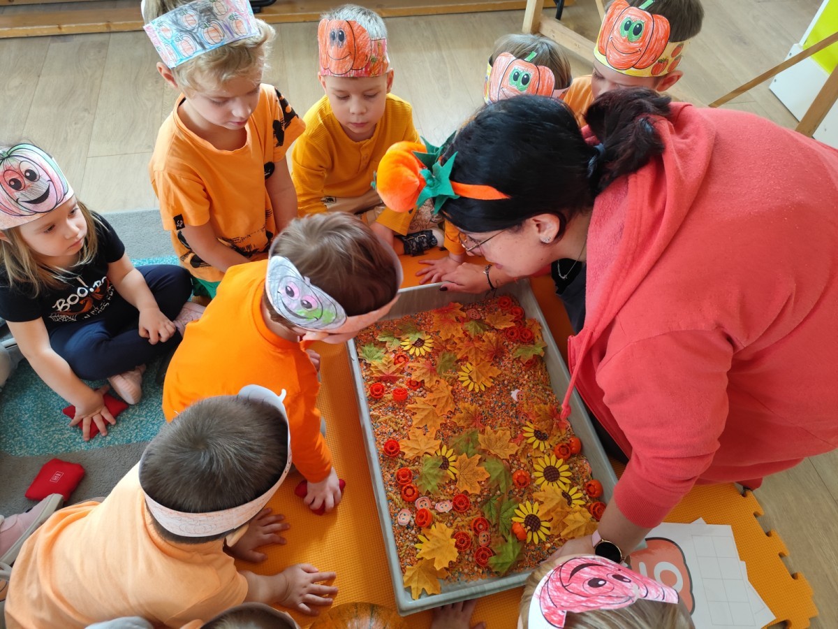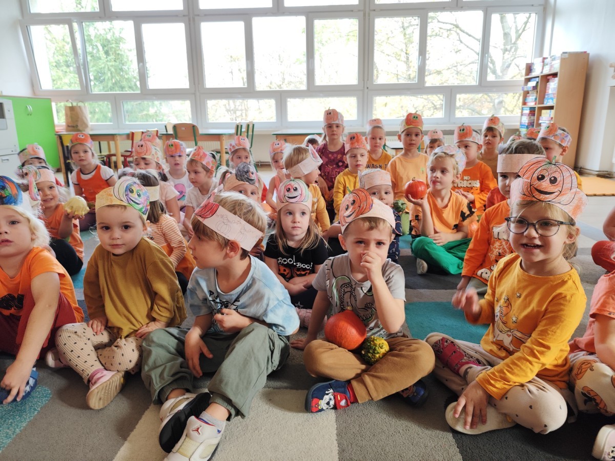 Dzieci z wszystkich grup poznały ciekawostki o dyniach, poznały budowę dyni, dowiedziały się jakie są rodzaje i odmiany dyni. Nie zabrakło zabaw muzyczno-ruchowych po polsku i po angielsku, tańców i zabaw matematycznych. Dzieci odszukiwały cienie, układały rytmy z dyń, wyszukiwały dynie w pudełku sensorycznym a także odkrywały ukryte przetwory z dyni przy pomocy latarek. Na koniec była gra terenowa oraz zabawy z dyniami i pomarańczowymi balonami w ogrodzie przedszkolnym zakończone tańcem na liściach do piosenki po angielsku "Fall freeze". Zabawa trwała dopóki z ogrodu nie przegonił nas jesienny deszcz. Wtedy przyszedł czas na obiad i pyszną zupkę dyniową!:)