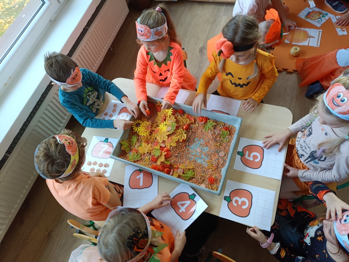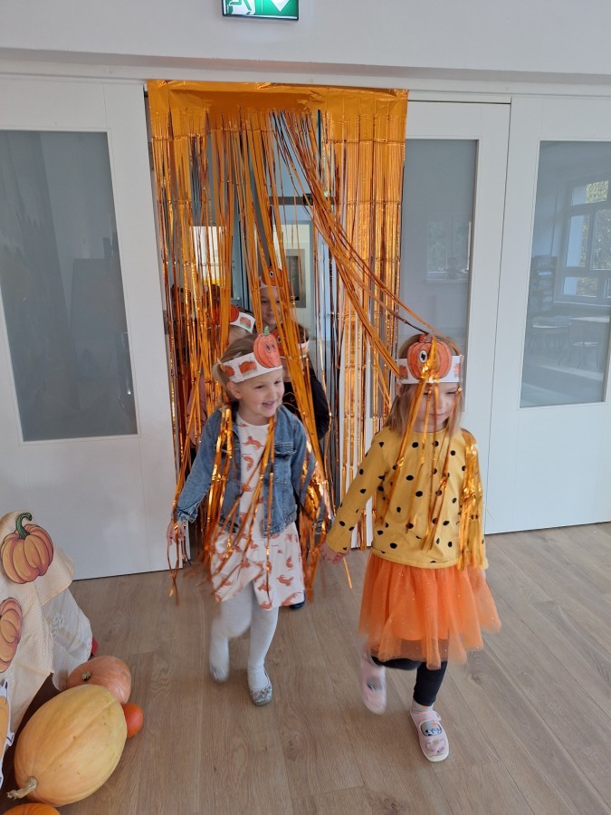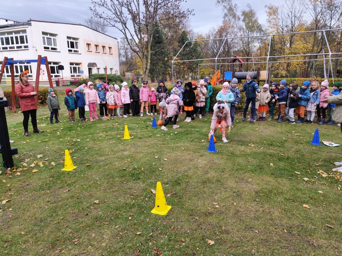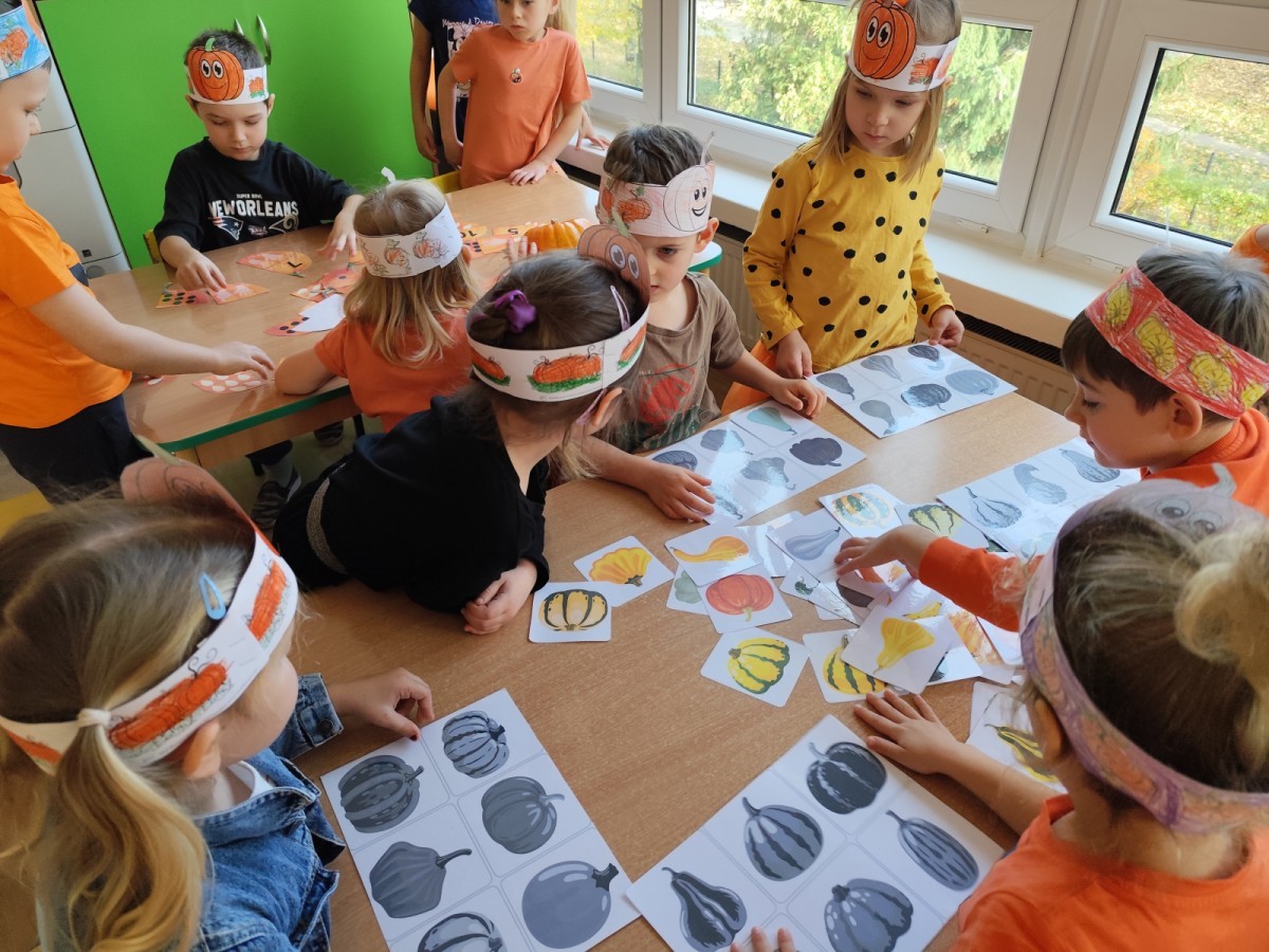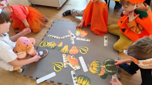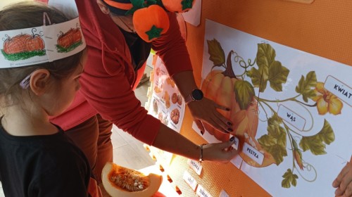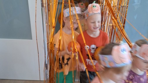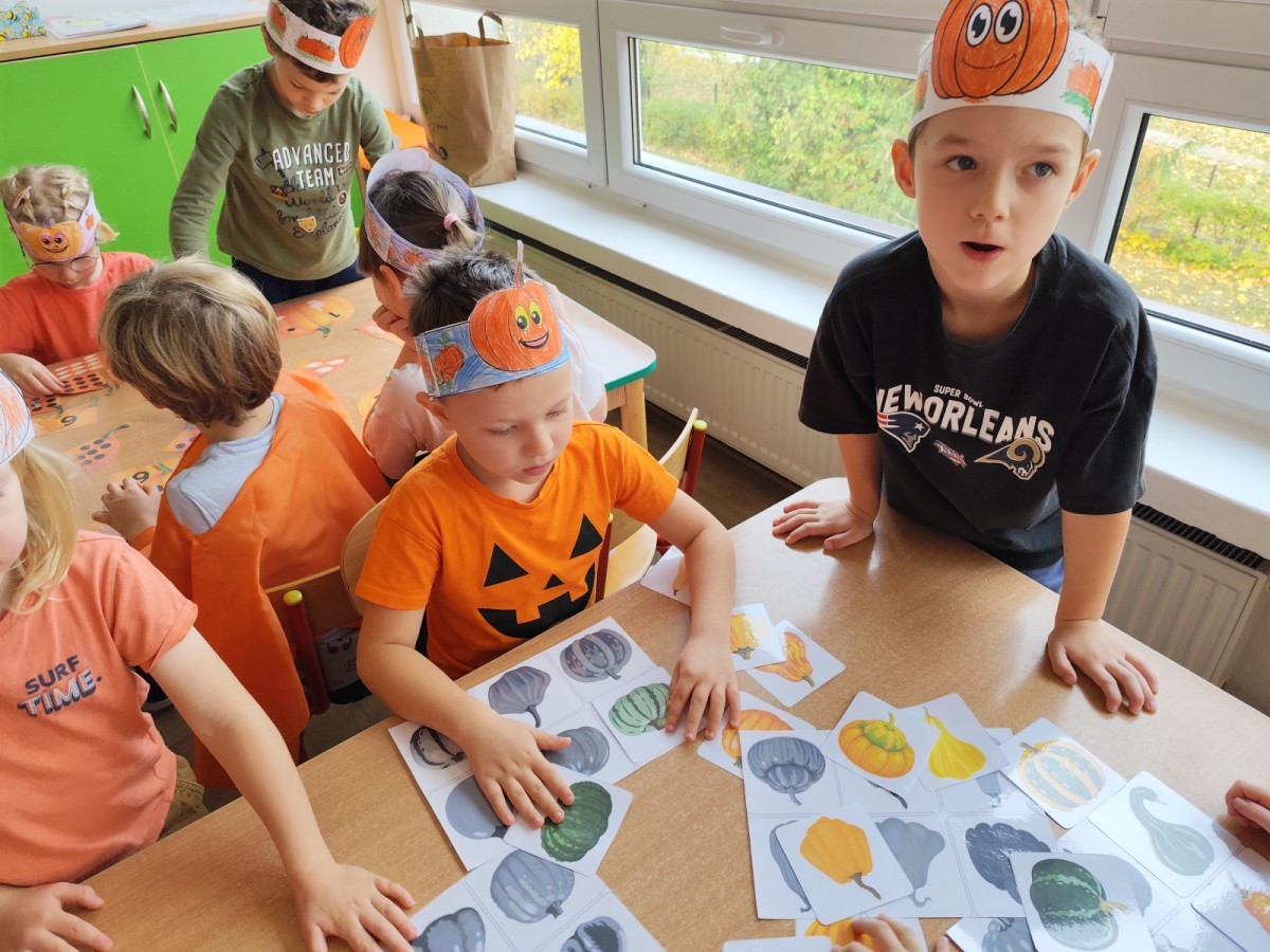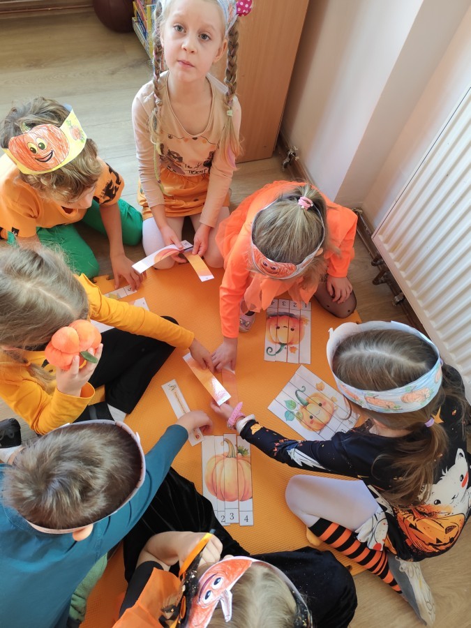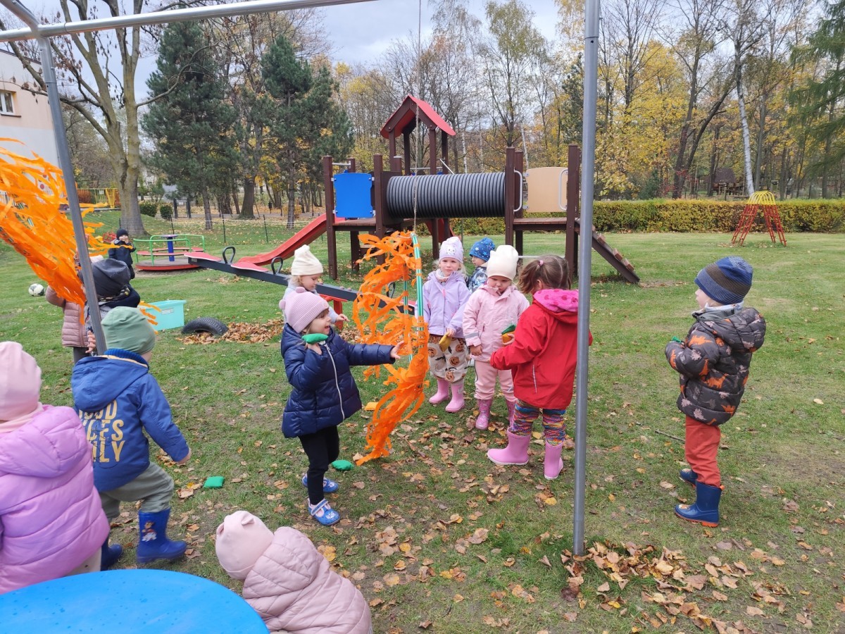 Dzieci z wszystkich grup poznały ciekawostki o dyniach, poznały budowę dyni, dowiedziały się jakie są rodzaje i odmiany dyni. Nie zabrakło zabaw muzyczno-ruchowych po polsku i po angielsku, tańców i zabaw matematycznych. Dzieci odszukiwały cienie, układały rytmy z dyń, wyszukiwały dynie w pudełku sensorycznym a także odkrywały ukryte przetwory z dyni przy pomocy latarek. Na koniec była gra terenowa oraz zabawy z dyniami i pomarańczowymi balonami w ogrodzie przedszkolnym zakończone tańcem na liściach do piosenki po angielsku "Fall freeze". Zabawa trwała dopóki z ogrodu nie przegonił nas jesienny deszcz. Wtedy przyszedł czas na obiad i pyszną zupkę dyniową!:)