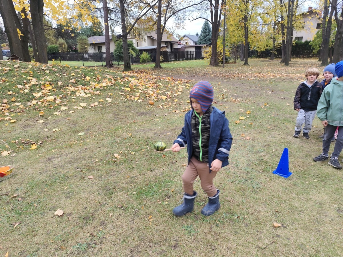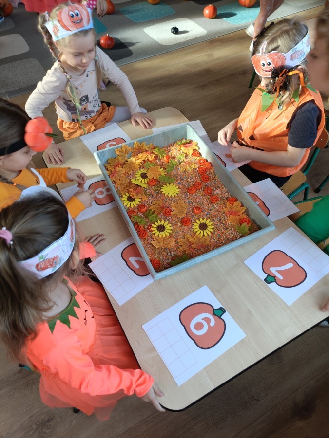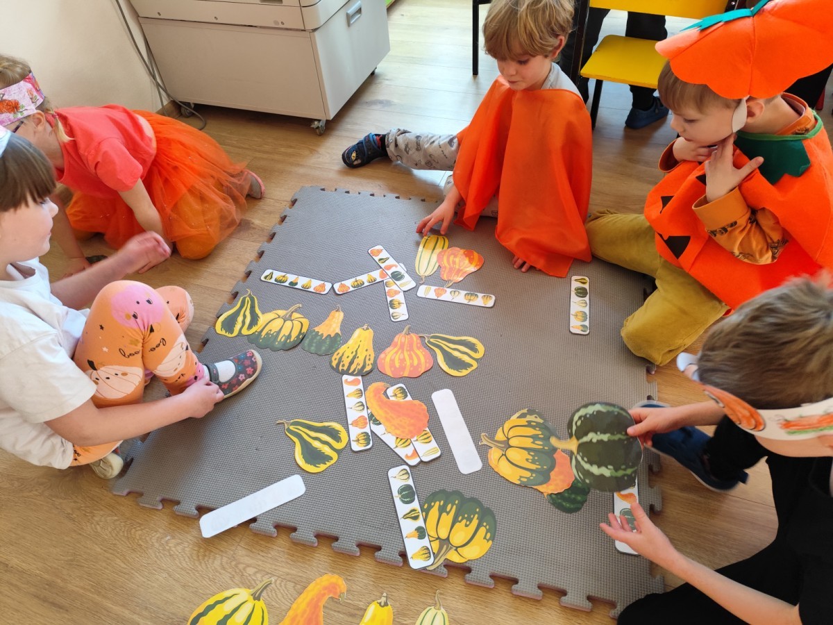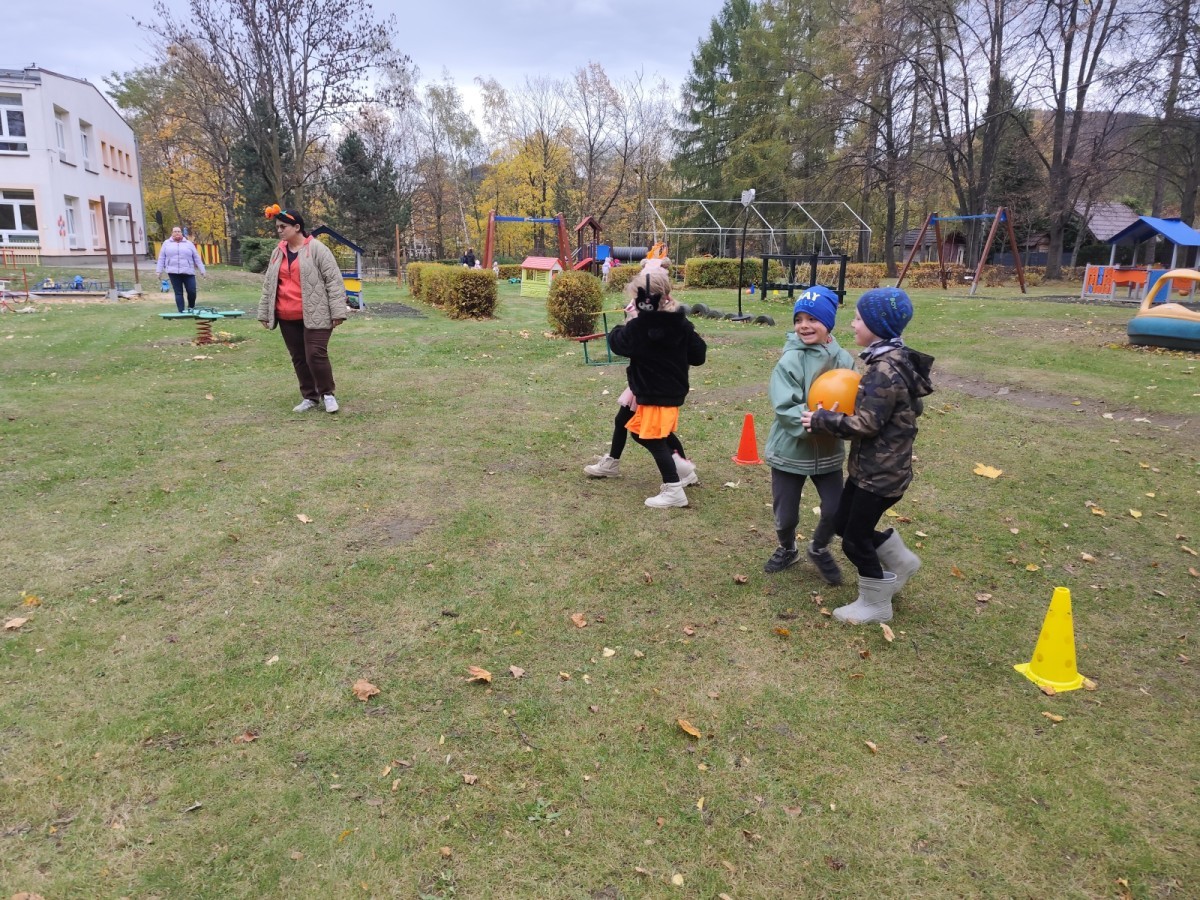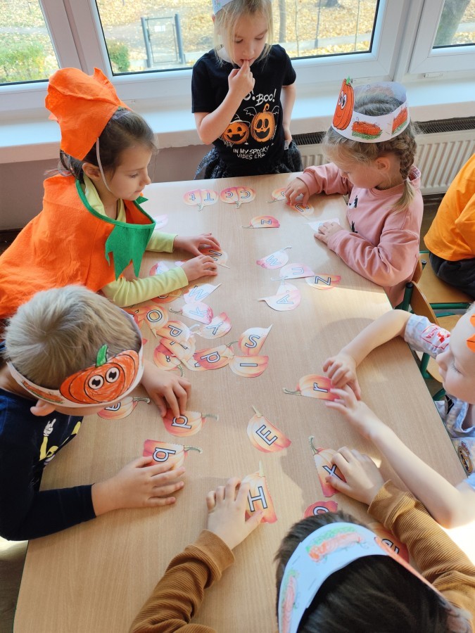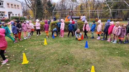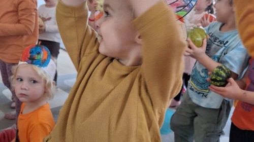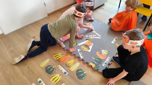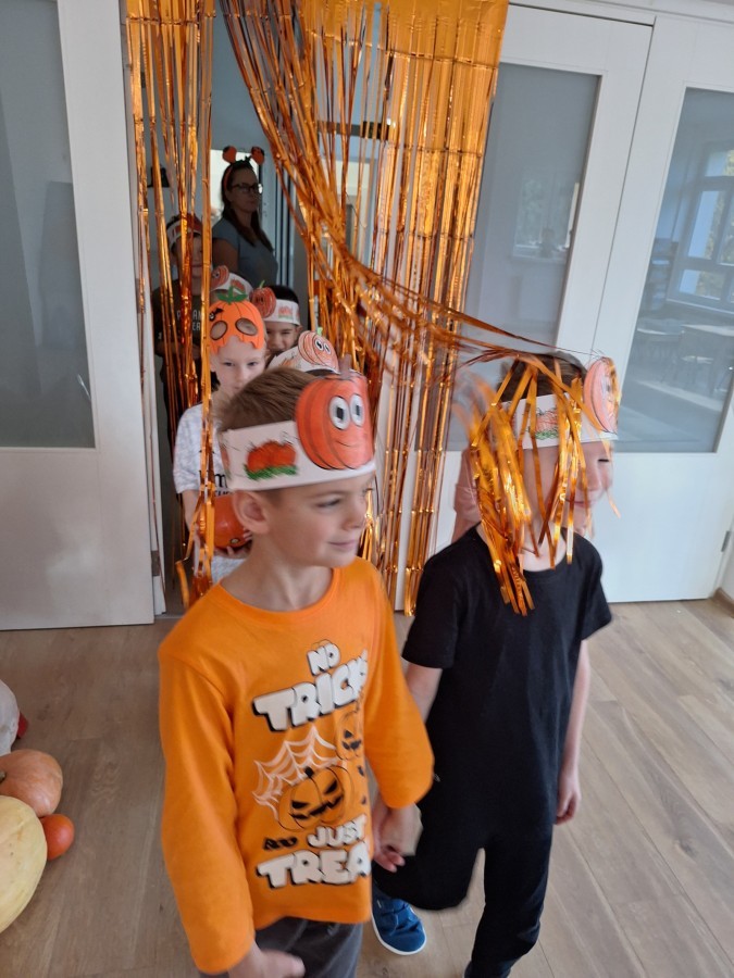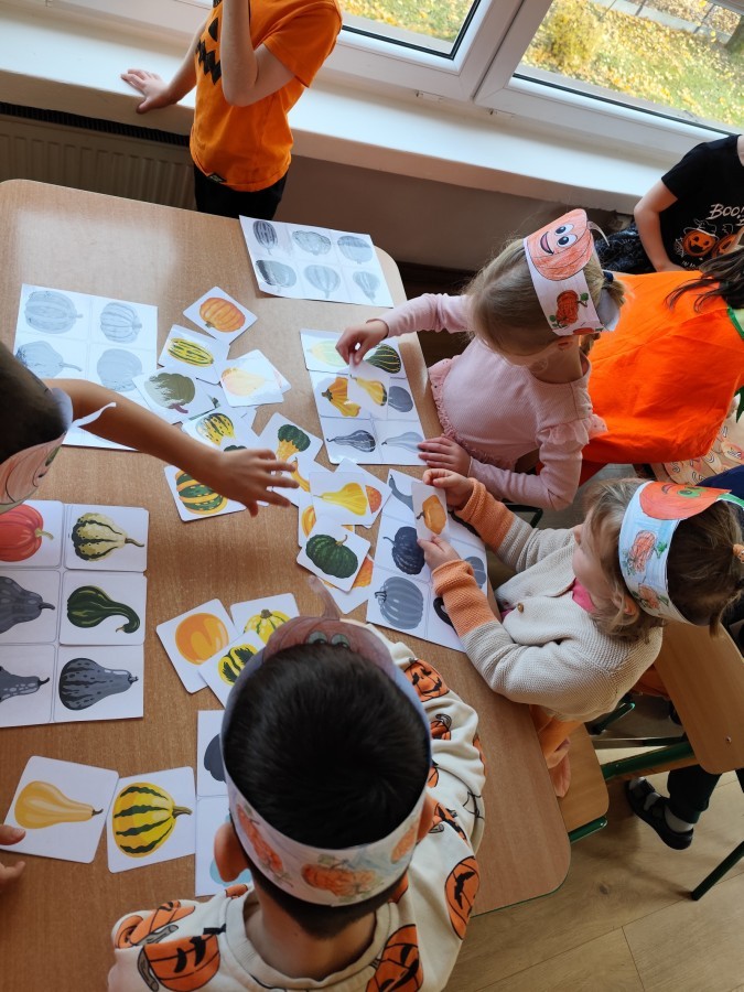 Dzieci z wszystkich grup poznały ciekawostki o dyniach, poznały budowę dyni, dowiedziały się jakie są rodzaje i odmiany dyni. Nie zabrakło zabaw muzyczno-ruchowych po polsku i po angielsku, tańców i zabaw matematycznych. Dzieci odszukiwały cienie, układały rytmy z dyń, wyszukiwały dynie w pudełku sensorycznym a także odkrywały ukryte przetwory z dyni przy pomocy latarek. Na koniec była gra terenowa oraz zabawy z dyniami i pomarańczowymi balonami w ogrodzie przedszkolnym zakończone tańcem na liściach do piosenki po angielsku "Fall freeze". Zabawa trwała dopóki z ogrodu nie przegonił nas jesienny deszcz. Wtedy przyszedł czas na obiad i pyszną zupkę dyniową!:)