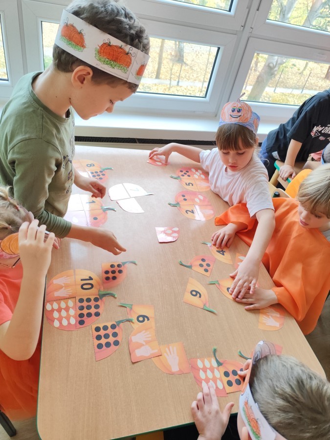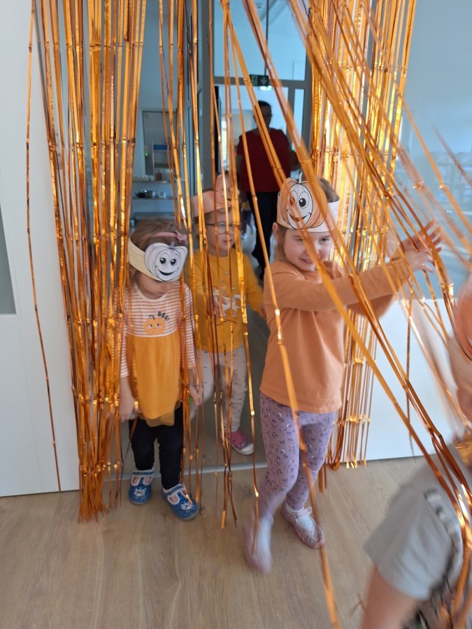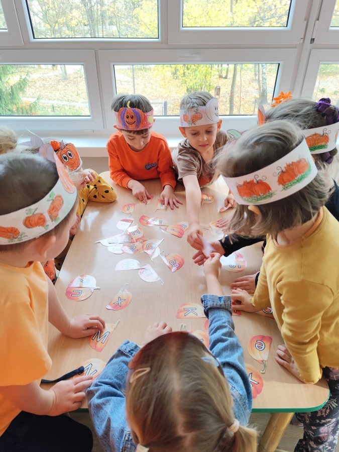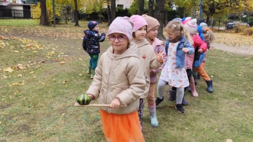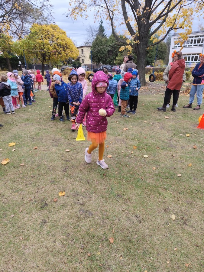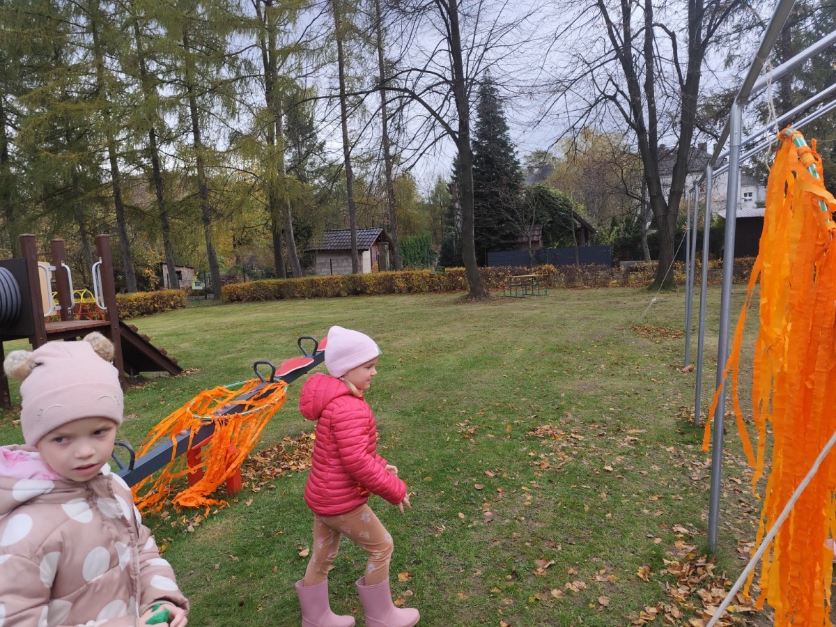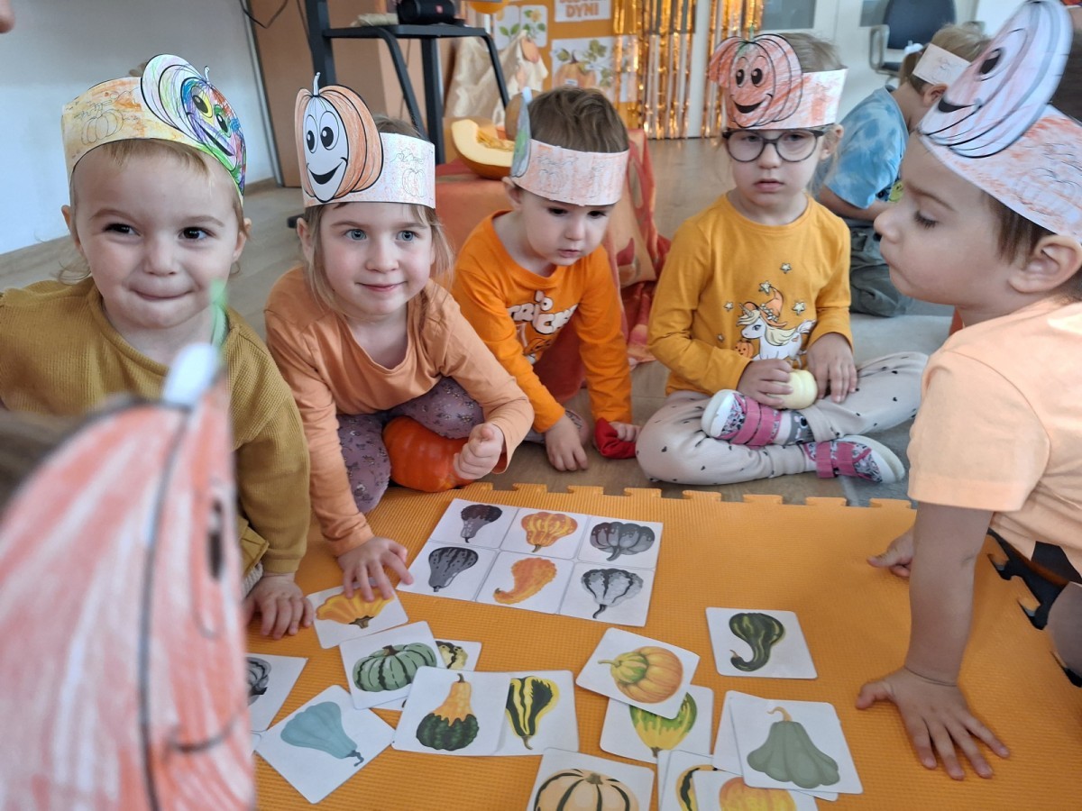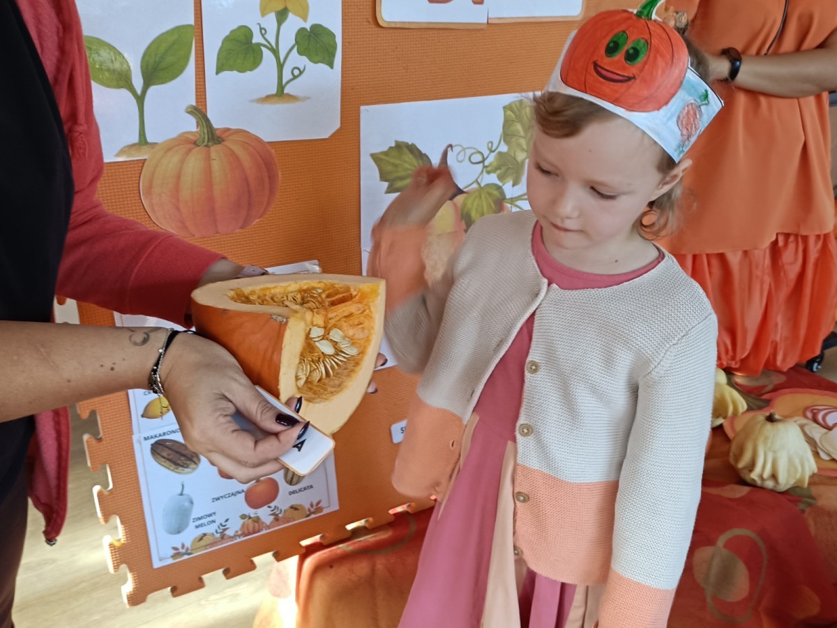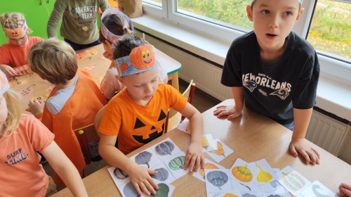 Dzieci z wszystkich grup poznały ciekawostki o dyniach, poznały budowę dyni, dowiedziały się jakie są rodzaje i odmiany dyni. Nie zabrakło zabaw muzyczno-ruchowych po polsku i po angielsku, tańców i zabaw matematycznych. Dzieci odszukiwały cienie, układały rytmy z dyń, wyszukiwały dynie w pudełku sensorycznym a także odkrywały ukryte przetwory z dyni przy pomocy latarek. Na koniec była gra terenowa oraz zabawy z dyniami i pomarańczowymi balonami w ogrodzie przedszkolnym zakończone tańcem na liściach do piosenki po angielsku "Fall freeze". Zabawa trwała dopóki z ogrodu nie przegonił nas jesienny deszcz. Wtedy przyszedł czas na obiad i pyszną zupkę dyniową!:)