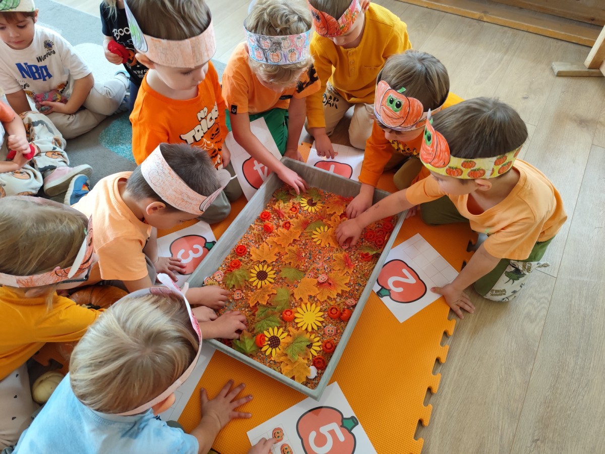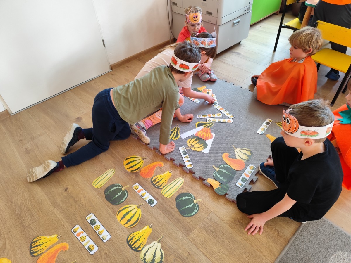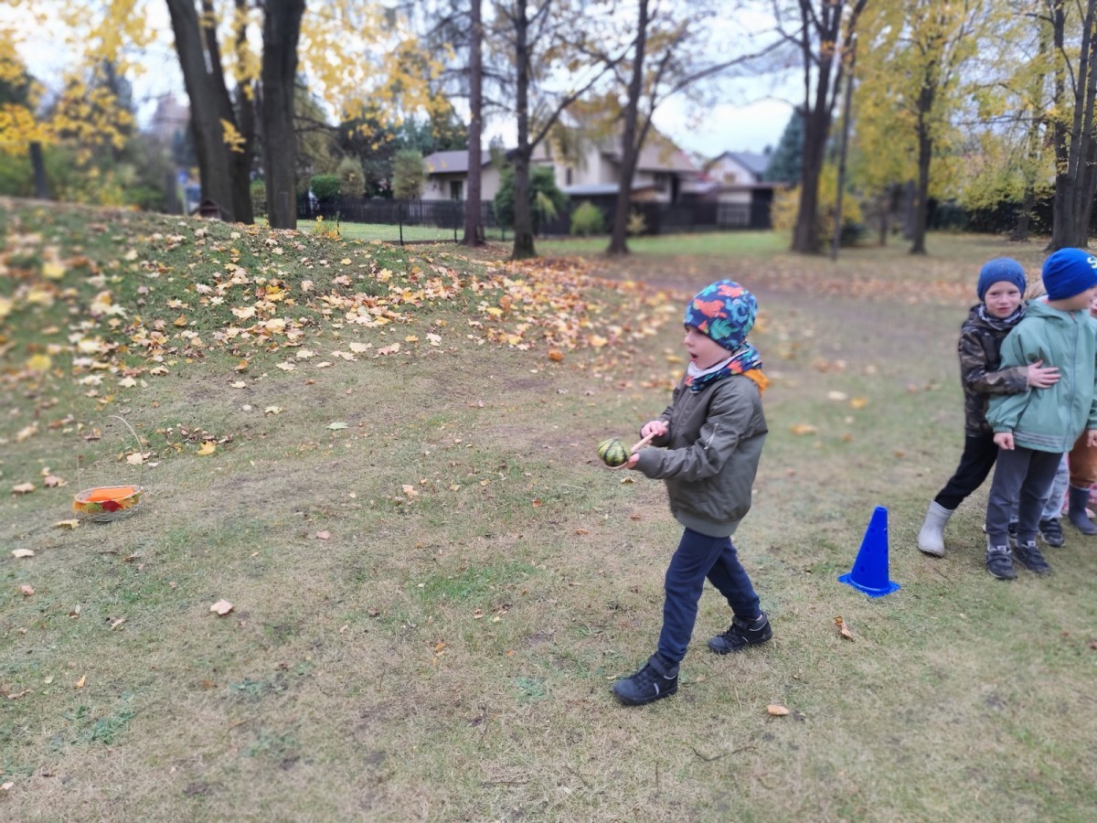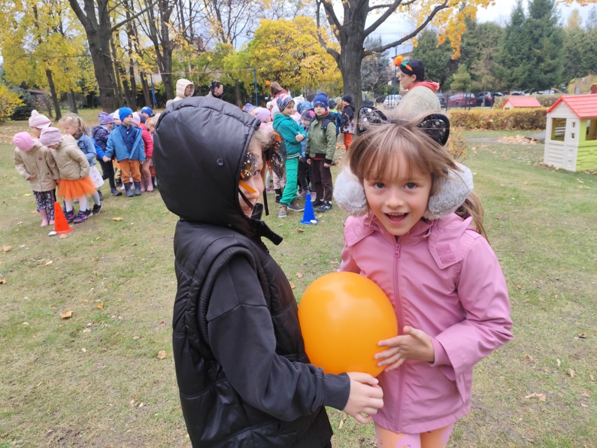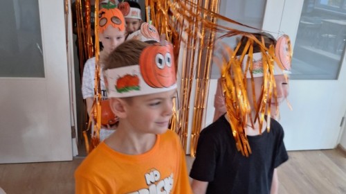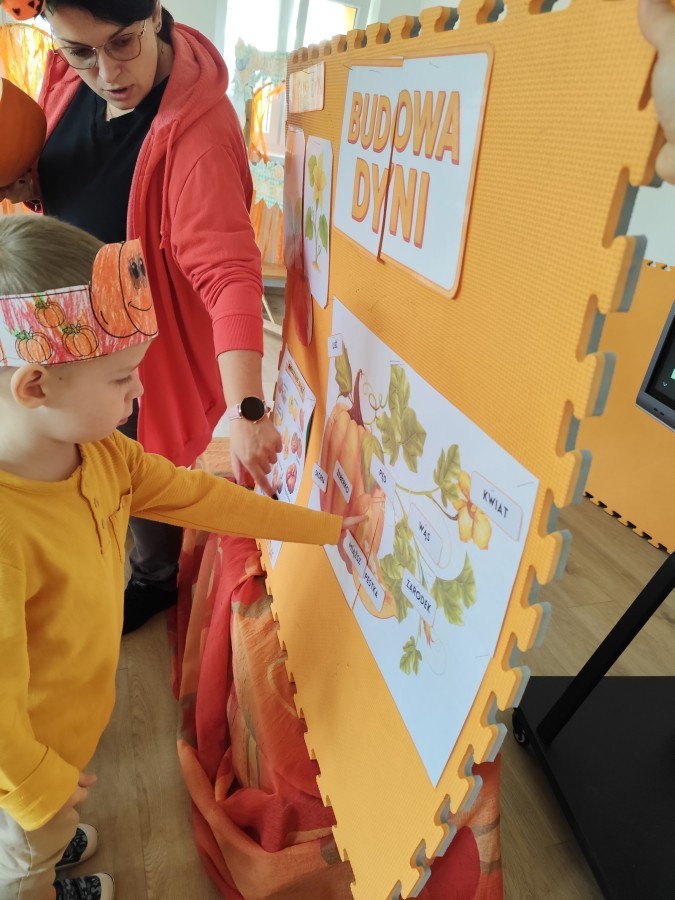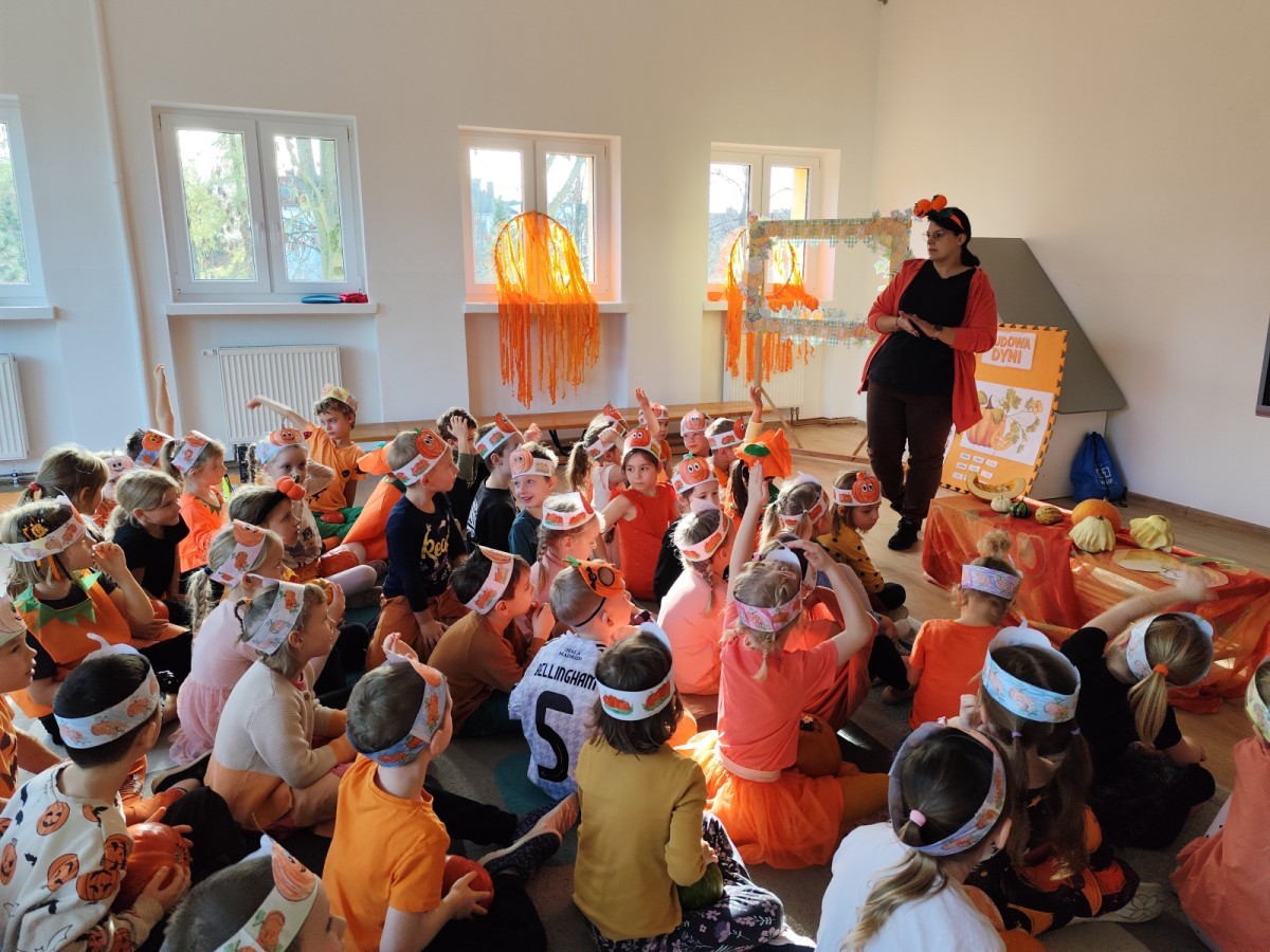 Dzieci z wszystkich grup poznały ciekawostki o dyniach, poznały budowę dyni, dowiedziały się jakie są rodzaje i odmiany dyni. Nie zabrakło zabaw muzyczno-ruchowych po polsku i po angielsku, tańców i zabaw matematycznych. Dzieci odszukiwały cienie, układały rytmy z dyń, wyszukiwały dynie w pudełku sensorycznym a także odkrywały ukryte przetwory z dyni przy pomocy latarek. Na koniec była gra terenowa oraz zabawy z dyniami i pomarańczowymi balonami w ogrodzie przedszkolnym zakończone tańcem na liściach do piosenki po angielsku "Fall freeze". Zabawa trwała dopóki z ogrodu nie przegonił nas jesienny deszcz. Wtedy przyszedł czas na obiad i pyszną zupkę dyniową!:)