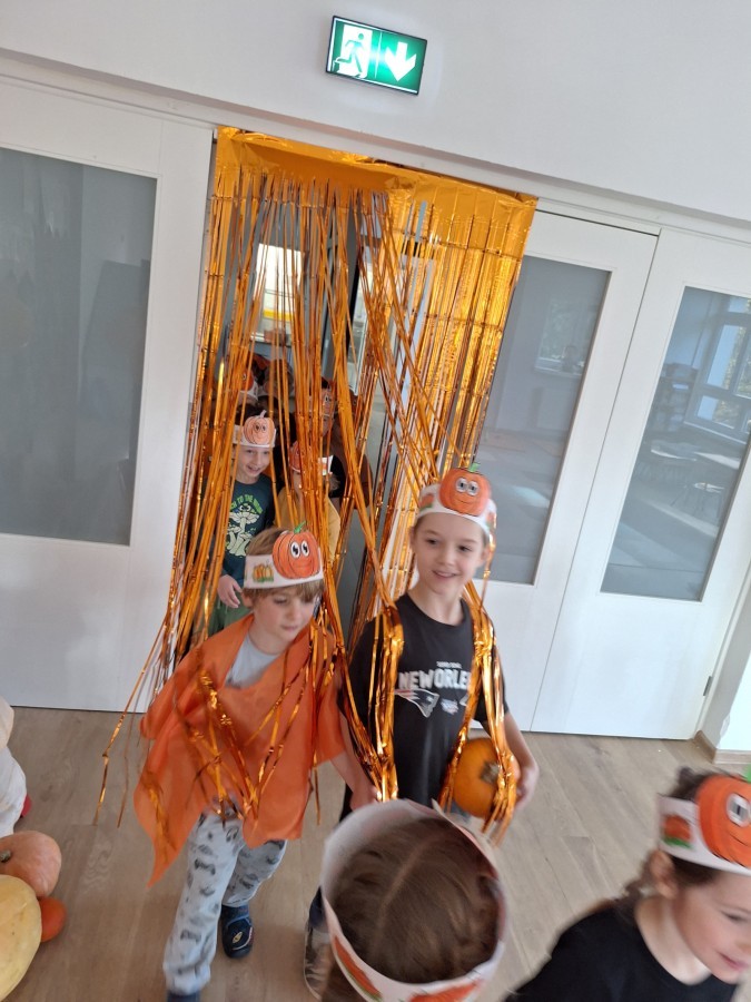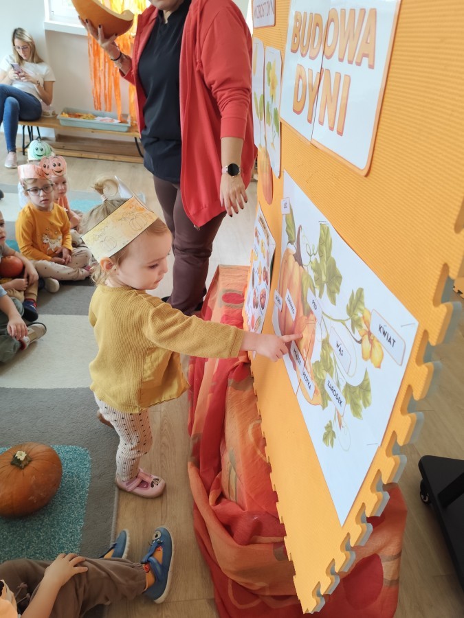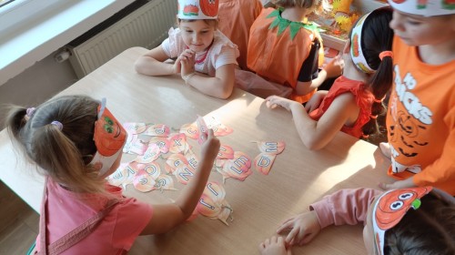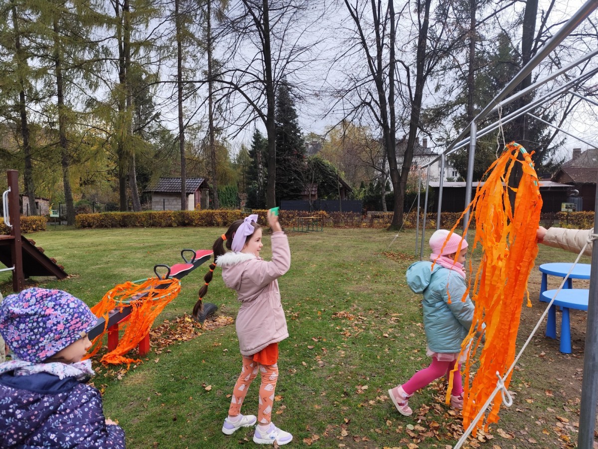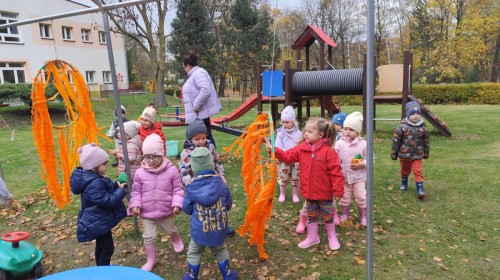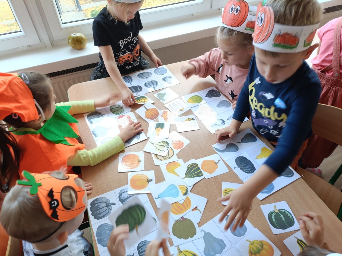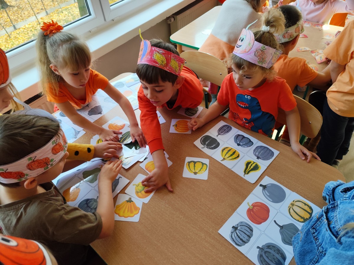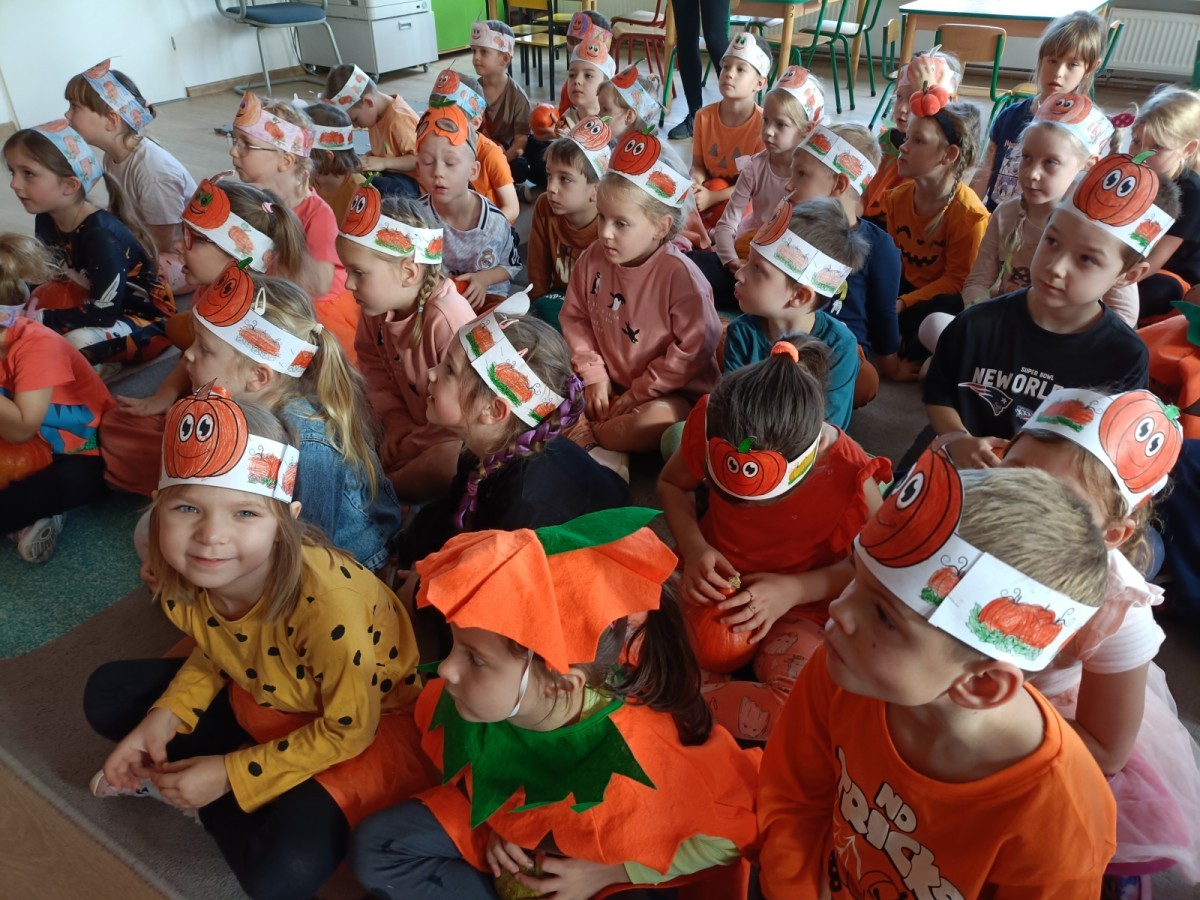 Dzieci z wszystkich grup poznały ciekawostki o dyniach, poznały budowę dyni, dowiedziały się jakie są rodzaje i odmiany dyni. Nie zabrakło zabaw muzyczno-ruchowych po polsku i po angielsku, tańców i zabaw matematycznych. Dzieci odszukiwały cienie, układały rytmy z dyń, wyszukiwały dynie w pudełku sensorycznym a także odkrywały ukryte przetwory z dyni przy pomocy latarek. Na koniec była gra terenowa oraz zabawy z dyniami i pomarańczowymi balonami w ogrodzie przedszkolnym zakończone tańcem na liściach do piosenki po angielsku "Fall freeze". Zabawa trwała dopóki z ogrodu nie przegonił nas jesienny deszcz. Wtedy przyszedł czas na obiad i pyszną zupkę dyniową!:)