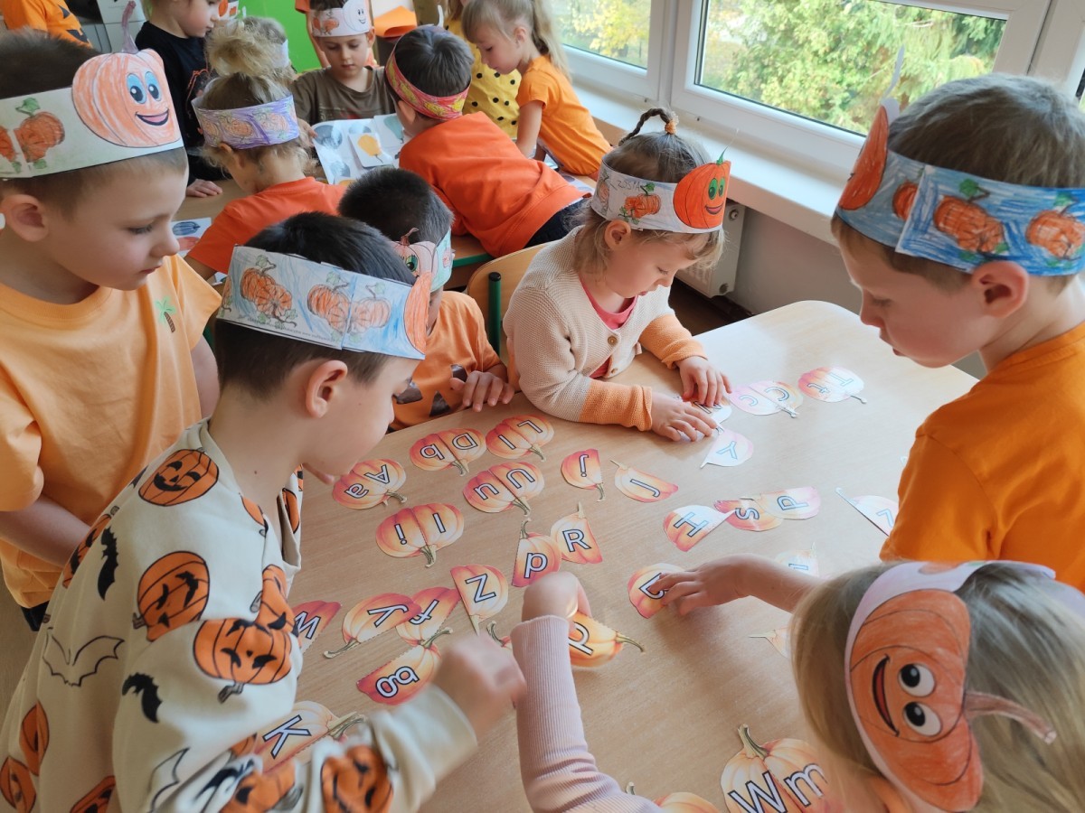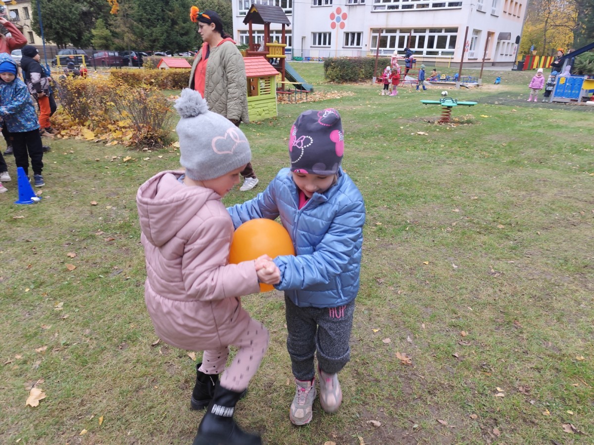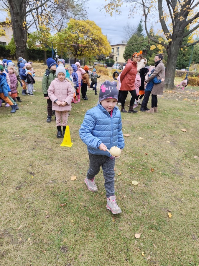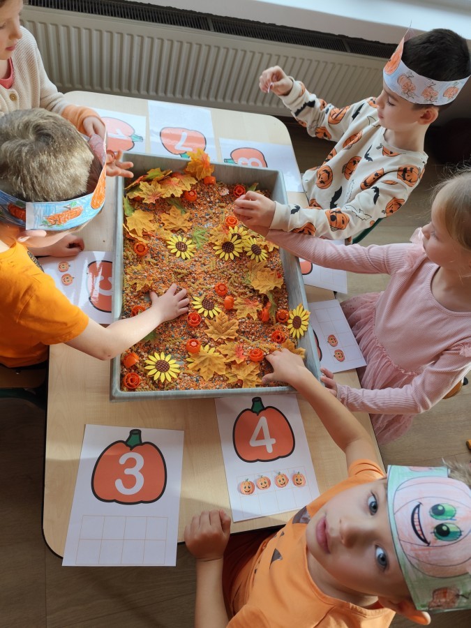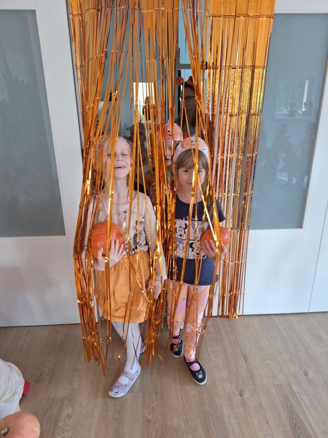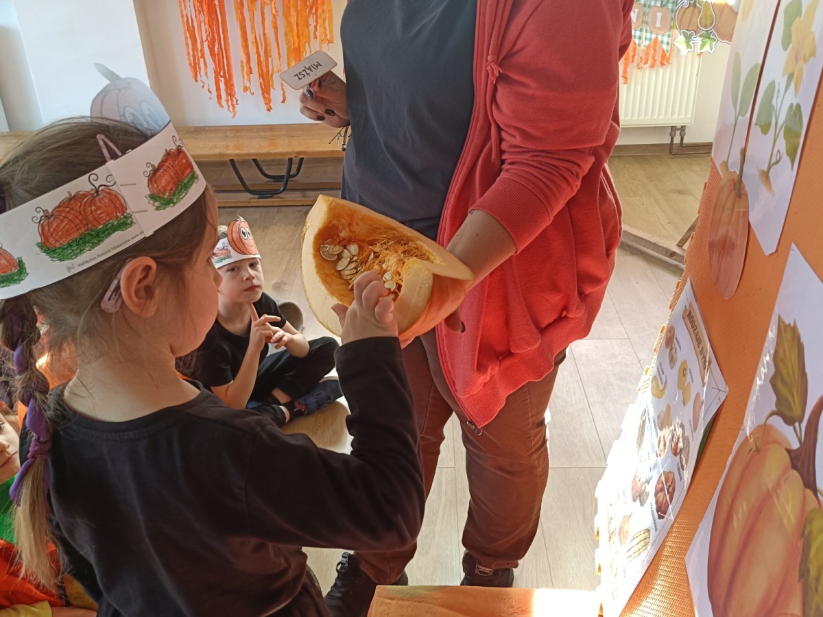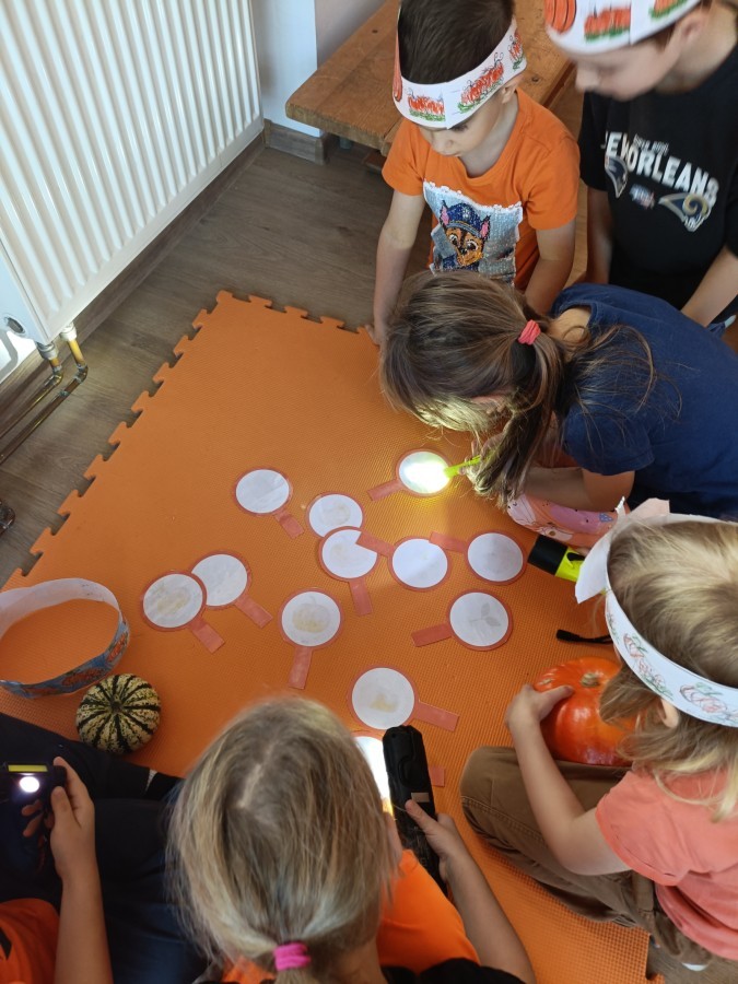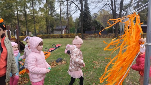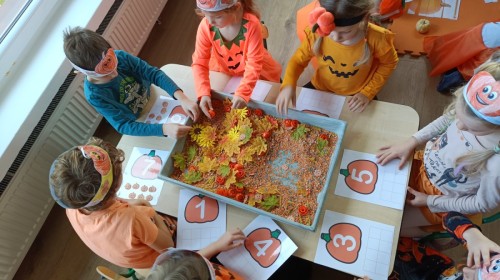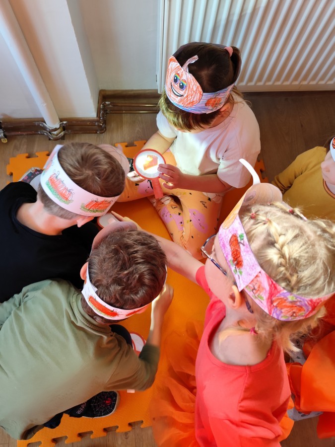 Dzieci z wszystkich grup poznały ciekawostki o dyniach, poznały budowę dyni, dowiedziały się jakie są rodzaje i odmiany dyni. Nie zabrakło zabaw muzyczno-ruchowych po polsku i po angielsku, tańców i zabaw matematycznych. Dzieci odszukiwały cienie, układały rytmy z dyń, wyszukiwały dynie w pudełku sensorycznym a także odkrywały ukryte przetwory z dyni przy pomocy latarek. Na koniec była gra terenowa oraz zabawy z dyniami i pomarańczowymi balonami w ogrodzie przedszkolnym zakończone tańcem na liściach do piosenki po angielsku "Fall freeze". Zabawa trwała dopóki z ogrodu nie przegonił nas jesienny deszcz. Wtedy przyszedł czas na obiad i pyszną zupkę dyniową!:)