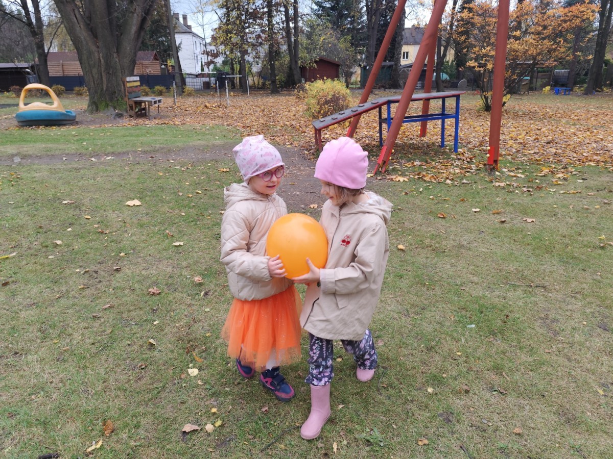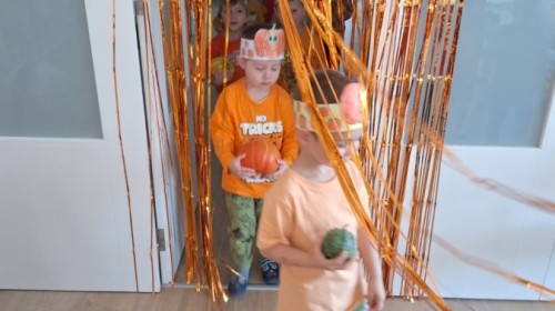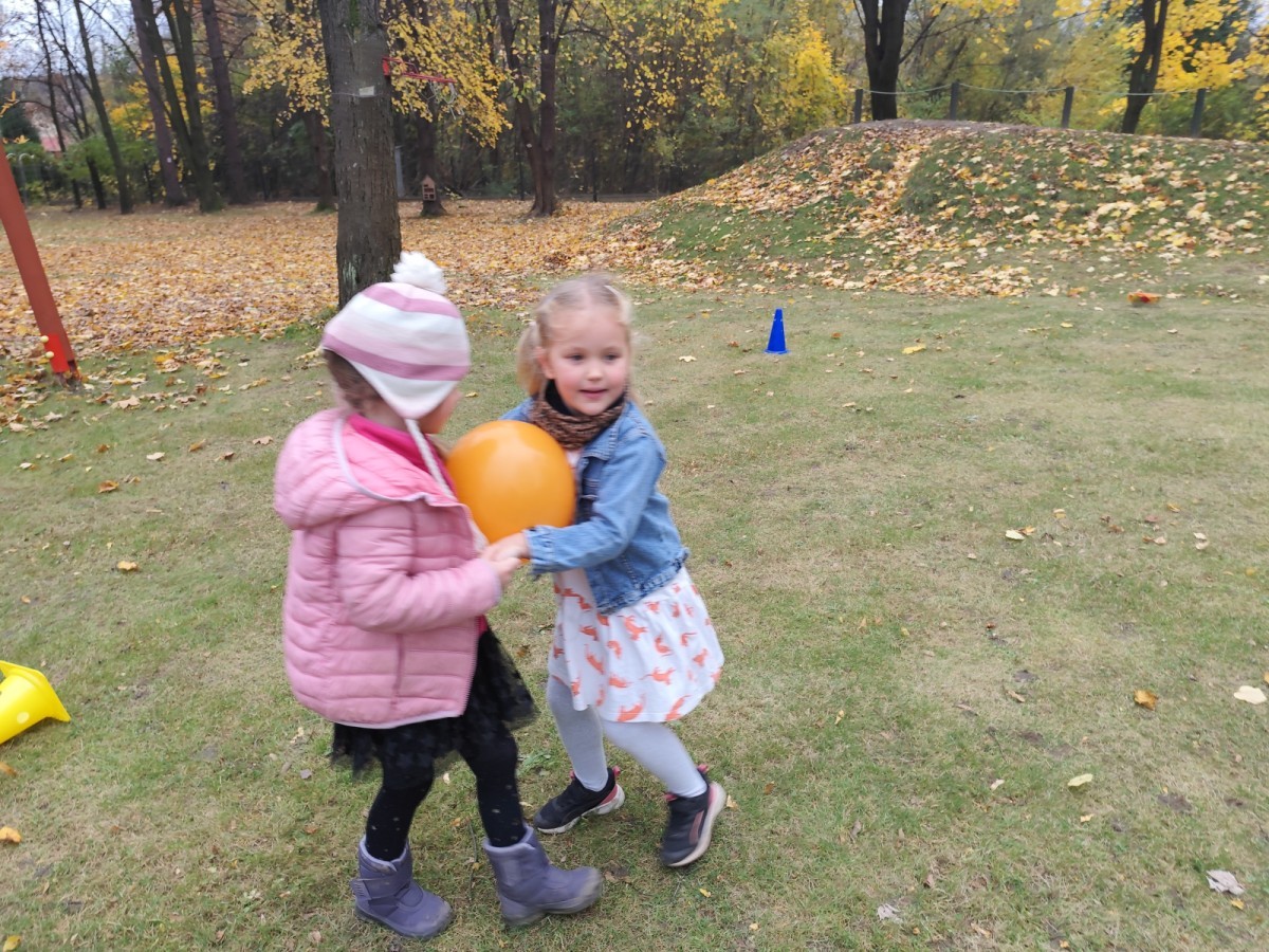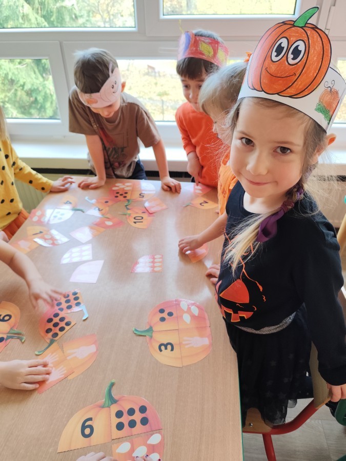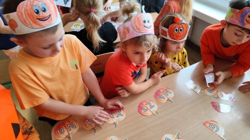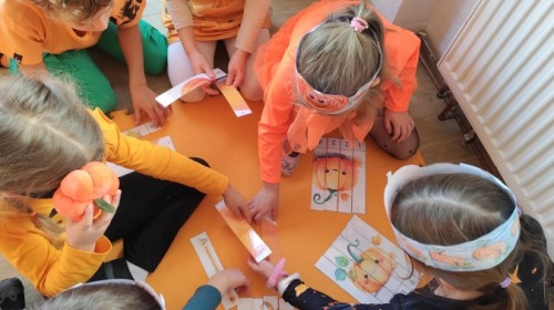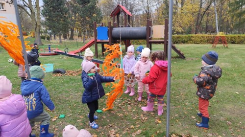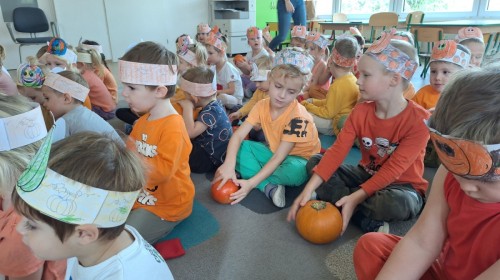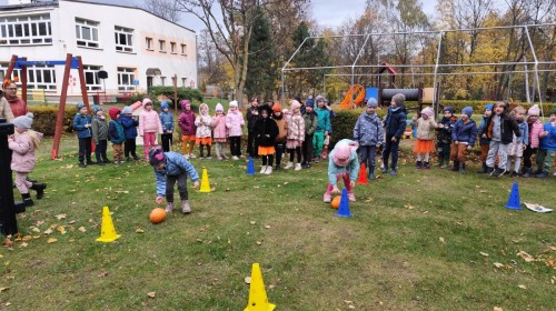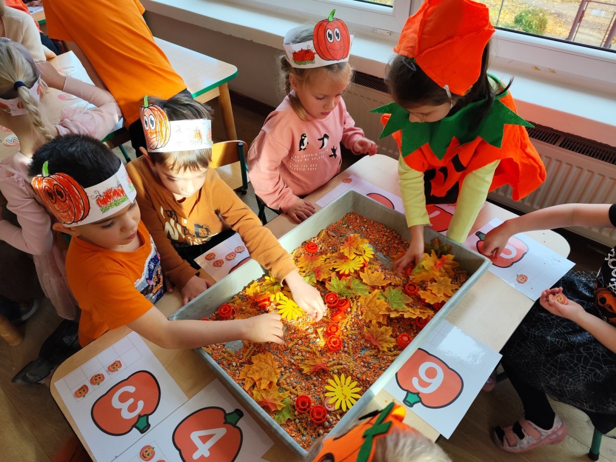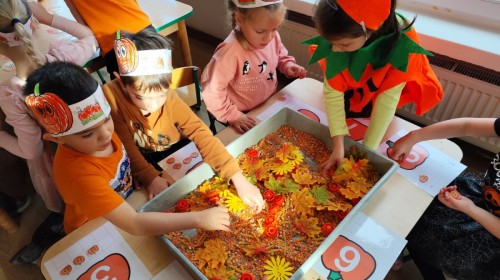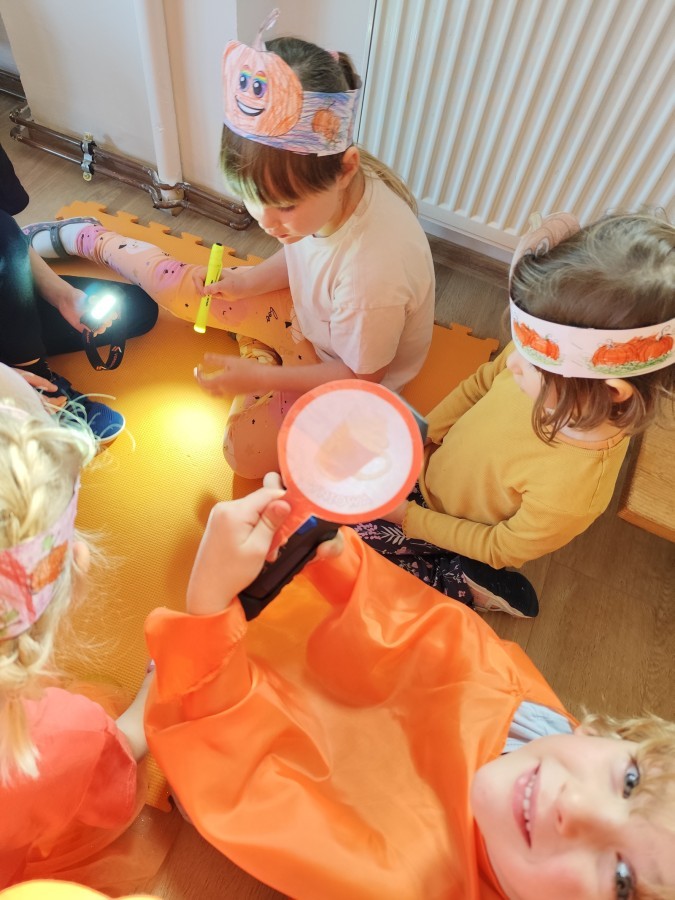 Dzieci z wszystkich grup poznały ciekawostki o dyniach, poznały budowę dyni, dowiedziały się jakie są rodzaje i odmiany dyni. Nie zabrakło zabaw muzyczno-ruchowych po polsku i po angielsku, tańców i zabaw matematycznych. Dzieci odszukiwały cienie, układały rytmy z dyń, wyszukiwały dynie w pudełku sensorycznym a także odkrywały ukryte przetwory z dyni przy pomocy latarek. Na koniec była gra terenowa oraz zabawy z dyniami i pomarańczowymi balonami w ogrodzie przedszkolnym zakończone tańcem na liściach do piosenki po angielsku "Fall freeze". Zabawa trwała dopóki z ogrodu nie przegonił nas jesienny deszcz. Wtedy przyszedł czas na obiad i pyszną zupkę dyniową!:)