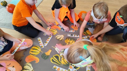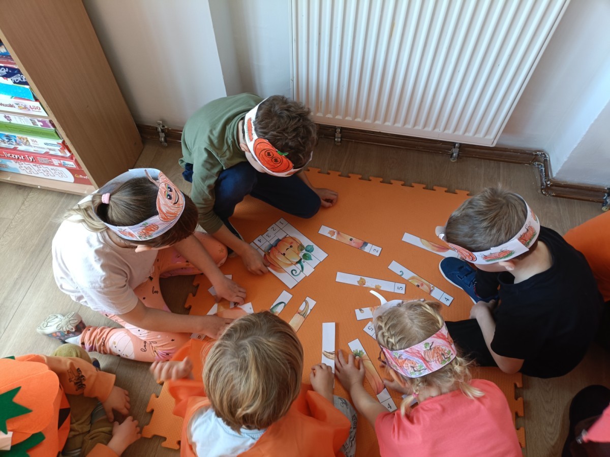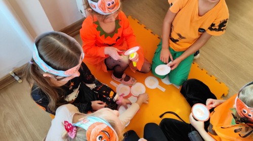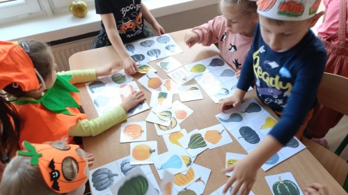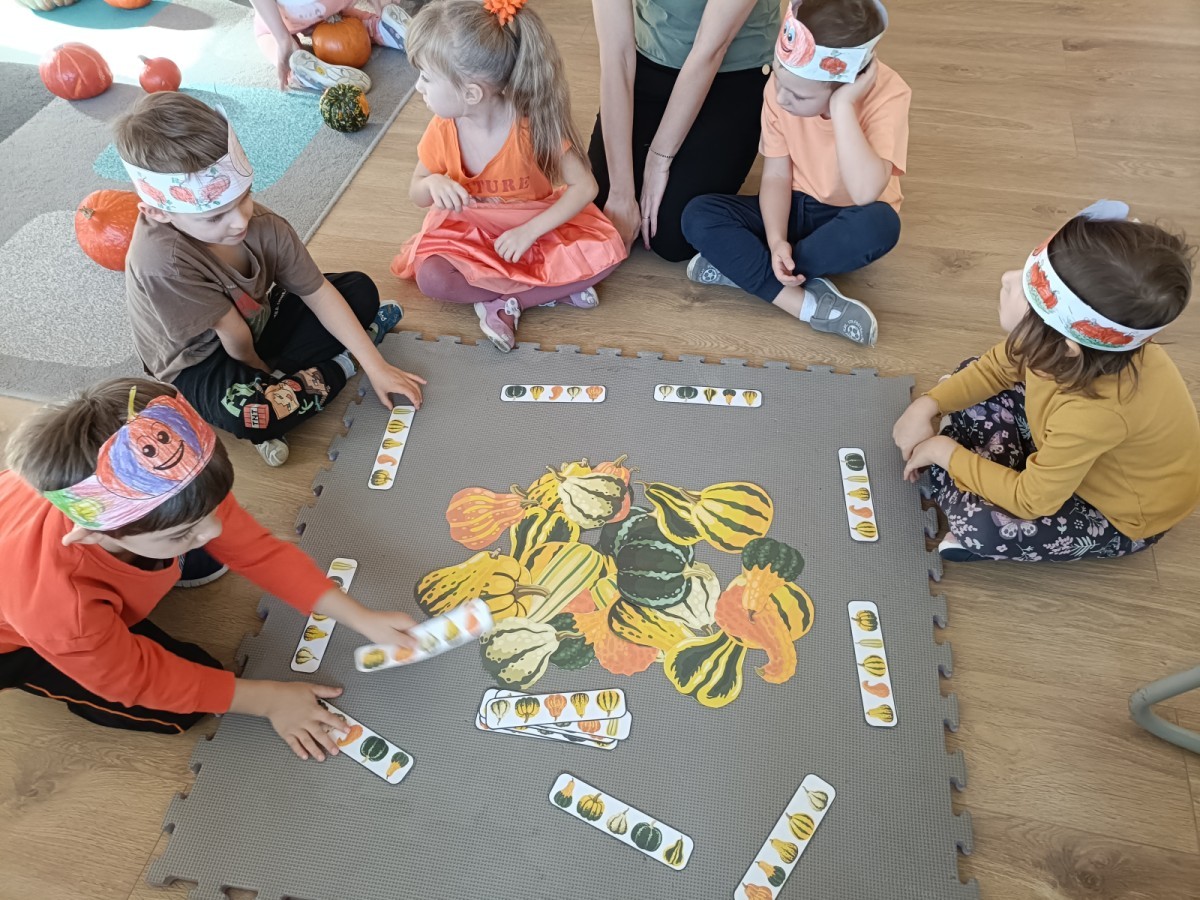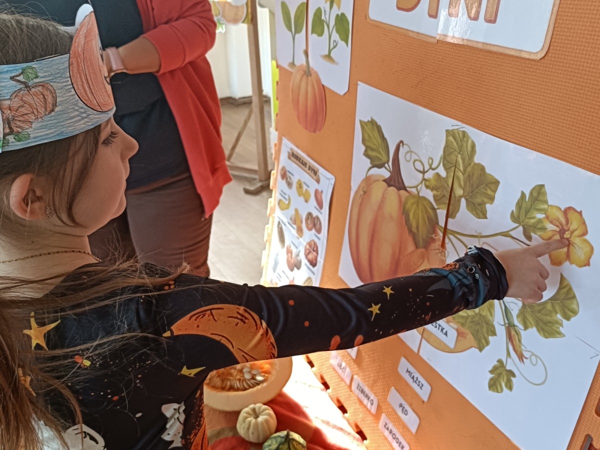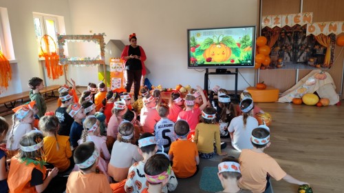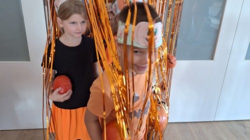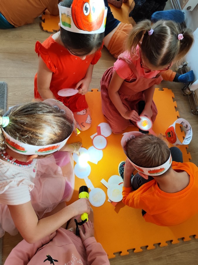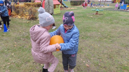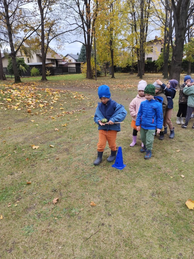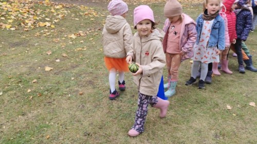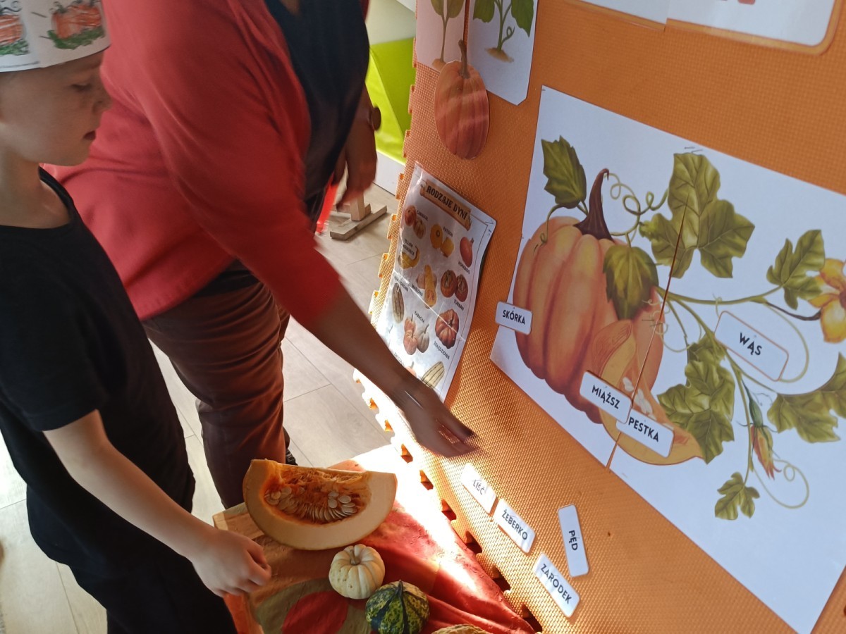 Dzieci z wszystkich grup poznały ciekawostki o dyniach, poznały budowę dyni, dowiedziały się jakie są rodzaje i odmiany dyni. Nie zabrakło zabaw muzyczno-ruchowych po polsku i po angielsku, tańców i zabaw matematycznych. Dzieci odszukiwały cienie, układały rytmy z dyń, wyszukiwały dynie w pudełku sensorycznym a także odkrywały ukryte przetwory z dyni przy pomocy latarek. Na koniec była gra terenowa oraz zabawy z dyniami i pomarańczowymi balonami w ogrodzie przedszkolnym zakończone tańcem na liściach do piosenki po angielsku "Fall freeze". Zabawa trwała dopóki z ogrodu nie przegonił nas jesienny deszcz. Wtedy przyszedł czas na obiad i pyszną zupkę dyniową!:)