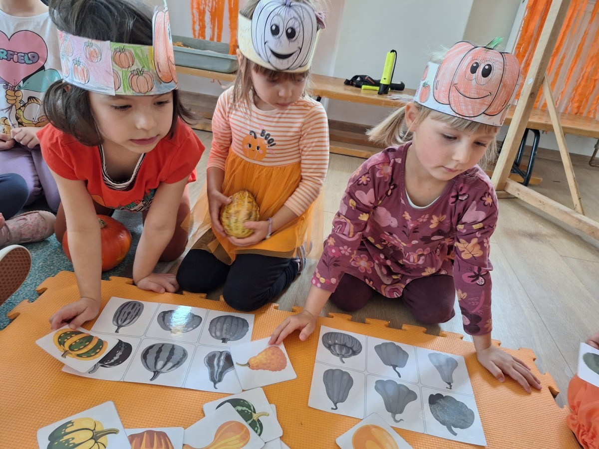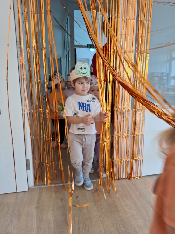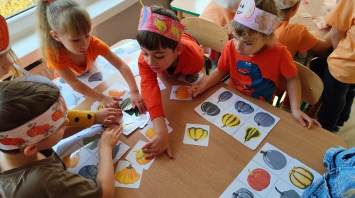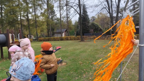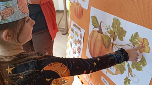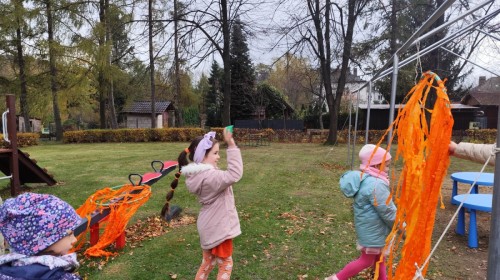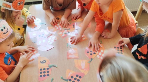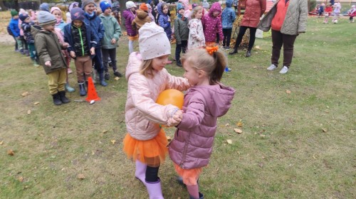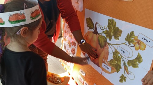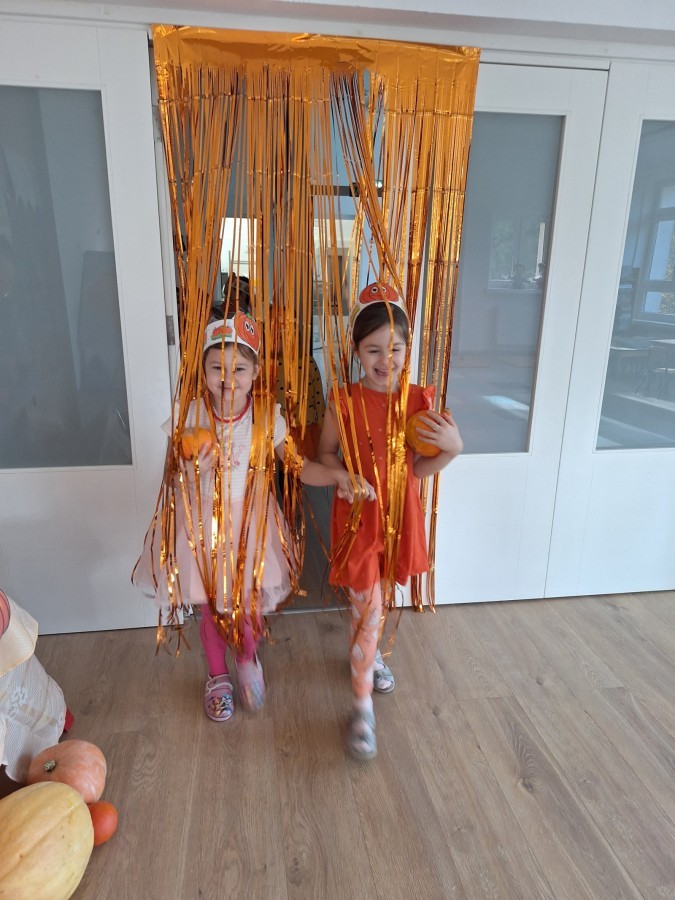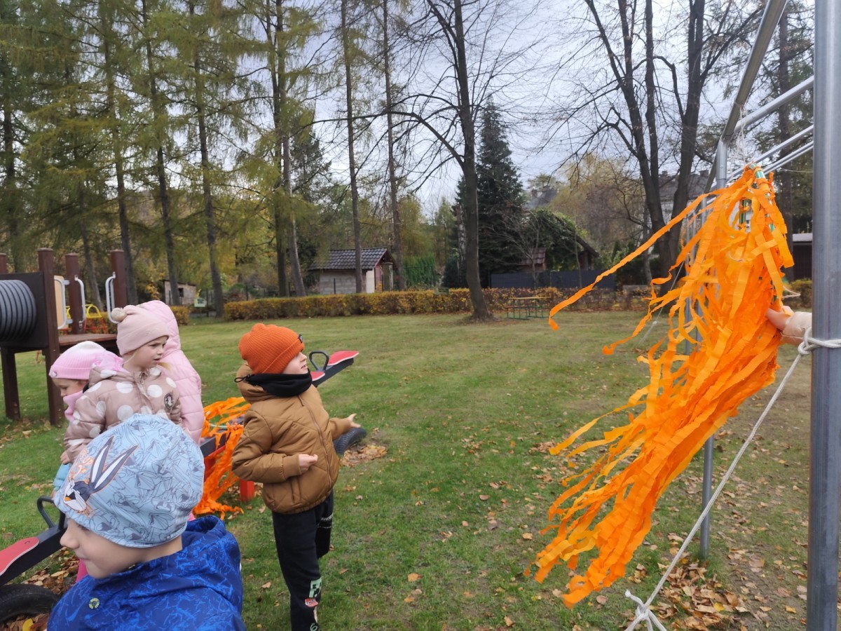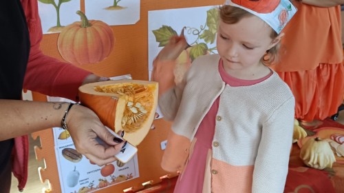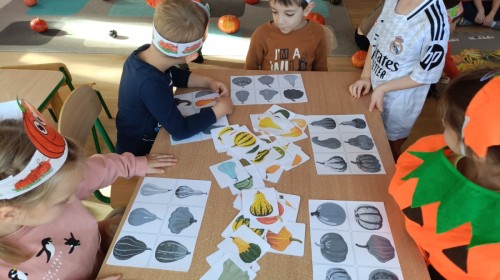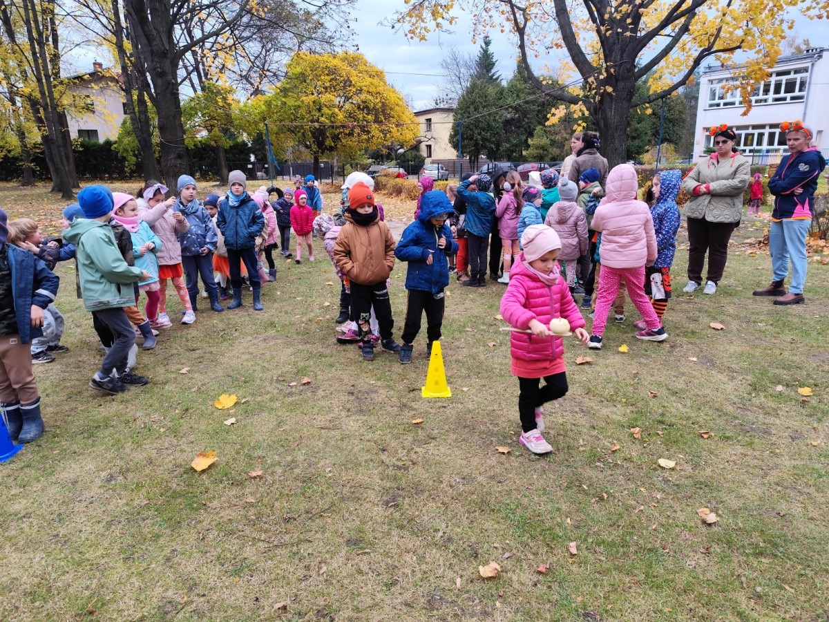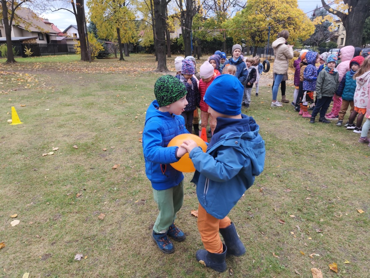 Dzieci z wszystkich grup poznały ciekawostki o dyniach, poznały budowę dyni, dowiedziały się jakie są rodzaje i odmiany dyni. Nie zabrakło zabaw muzyczno-ruchowych po polsku i po angielsku, tańców i zabaw matematycznych. Dzieci odszukiwały cienie, układały rytmy z dyń, wyszukiwały dynie w pudełku sensorycznym a także odkrywały ukryte przetwory z dyni przy pomocy latarek. Na koniec była gra terenowa oraz zabawy z dyniami i pomarańczowymi balonami w ogrodzie przedszkolnym zakończone tańcem na liściach do piosenki po angielsku "Fall freeze". Zabawa trwała dopóki z ogrodu nie przegonił nas jesienny deszcz. Wtedy przyszedł czas na obiad i pyszną zupkę dyniową!:)