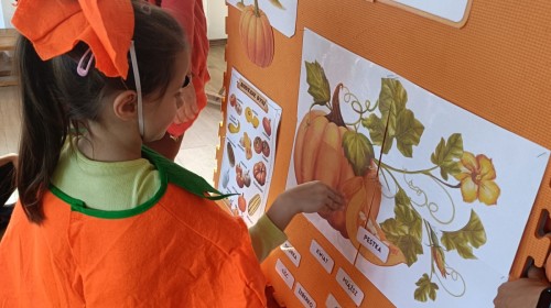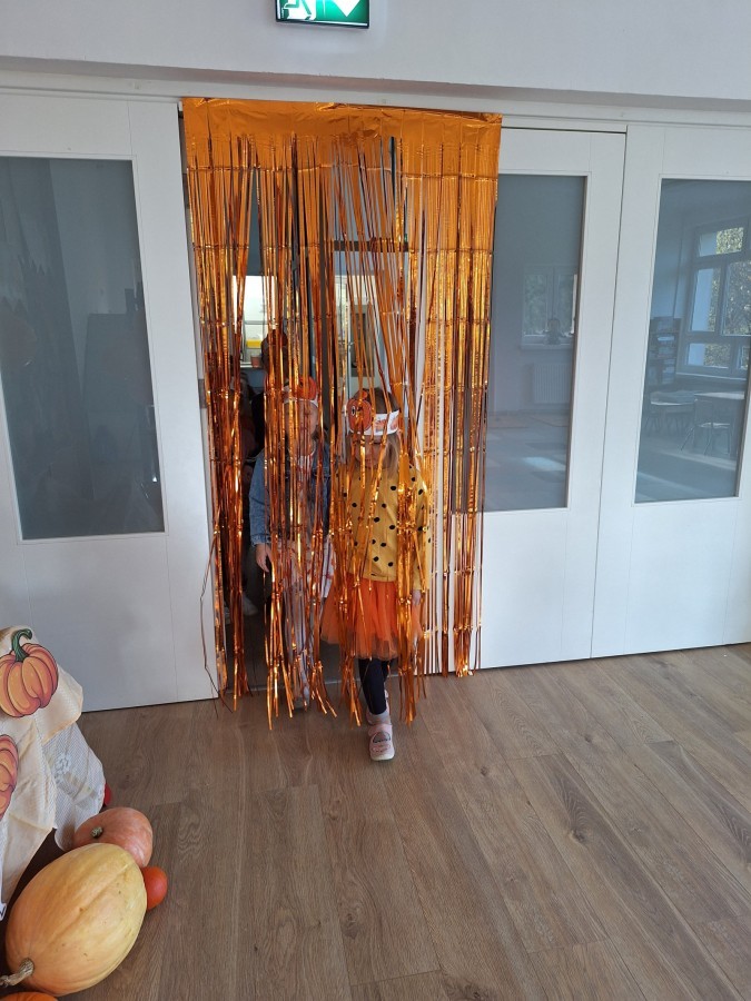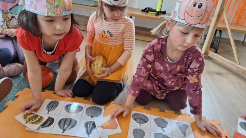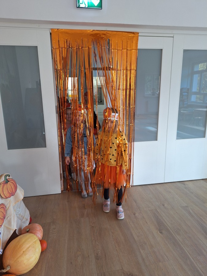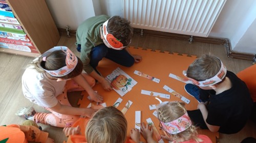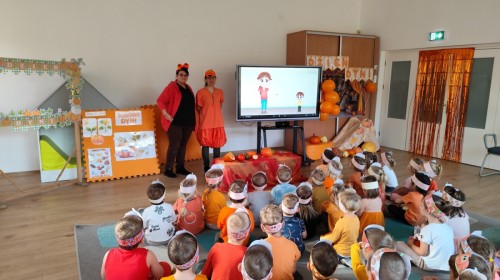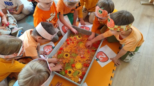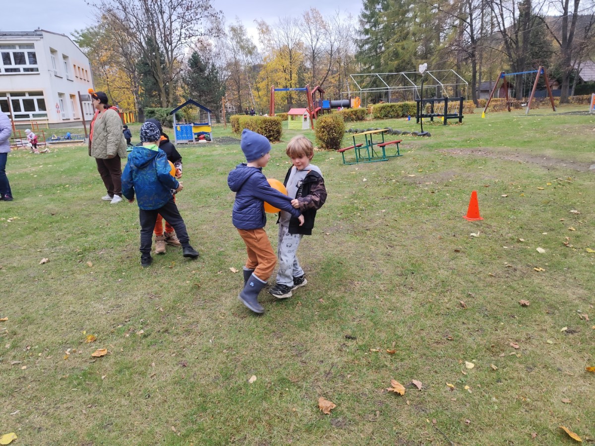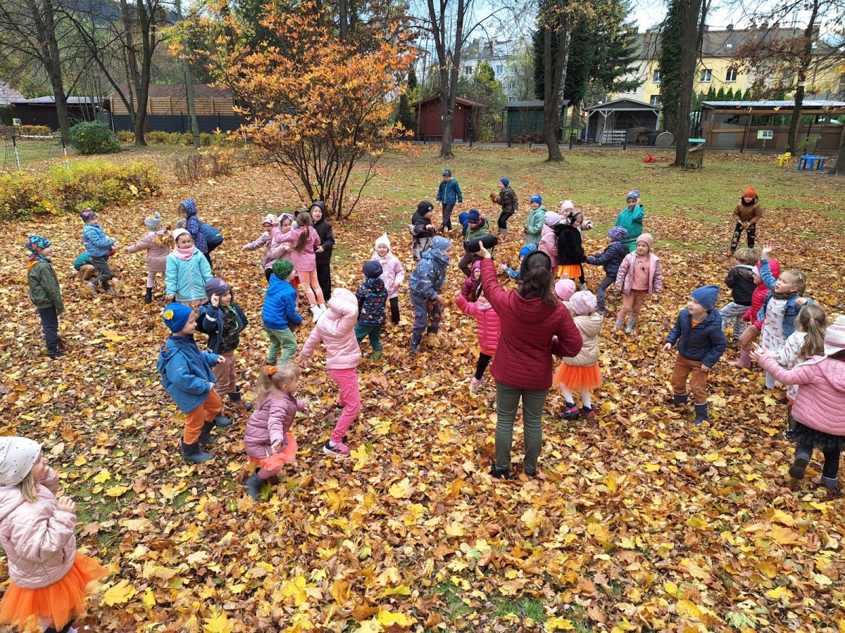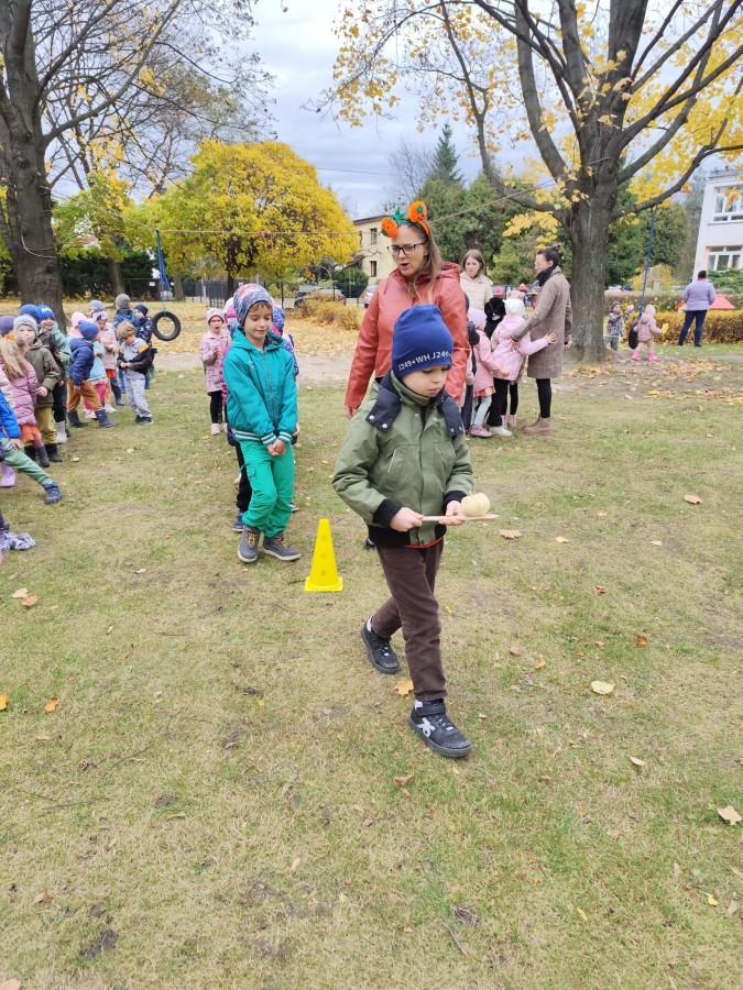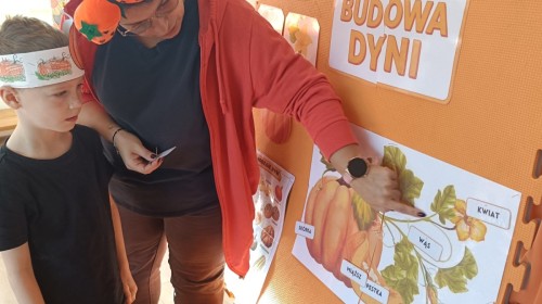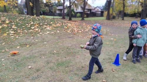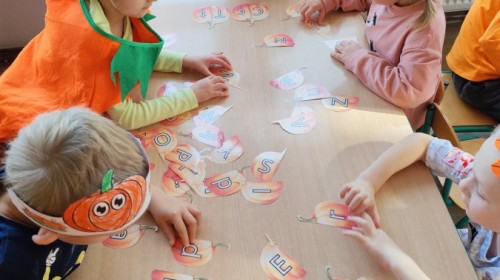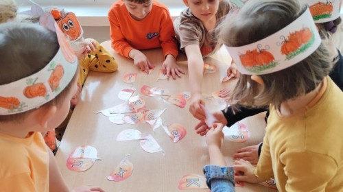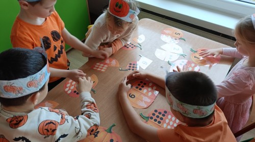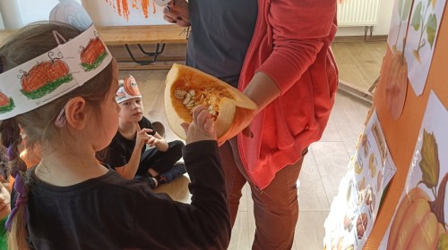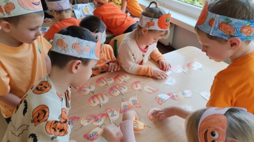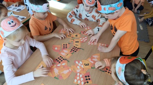 Dzieci z wszystkich grup poznały ciekawostki o dyniach, poznały budowę dyni, dowiedziały się jakie są rodzaje i odmiany dyni. Nie zabrakło zabaw muzyczno-ruchowych po polsku i po angielsku, tańców i zabaw matematycznych. Dzieci odszukiwały cienie, układały rytmy z dyń, wyszukiwały dynie w pudełku sensorycznym a także odkrywały ukryte przetwory z dyni przy pomocy latarek. Na koniec była gra terenowa oraz zabawy z dyniami i pomarańczowymi balonami w ogrodzie przedszkolnym zakończone tańcem na liściach do piosenki po angielsku "Fall freeze". Zabawa trwała dopóki z ogrodu nie przegonił nas jesienny deszcz. Wtedy przyszedł czas na obiad i pyszną zupkę dyniową!:)