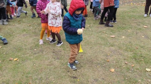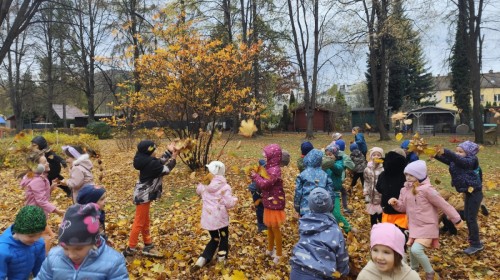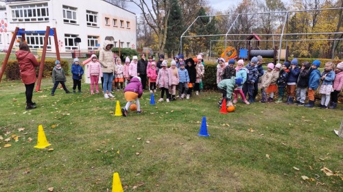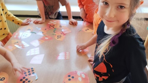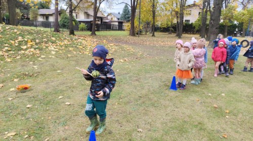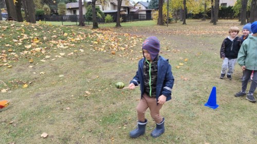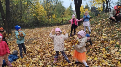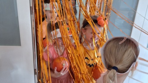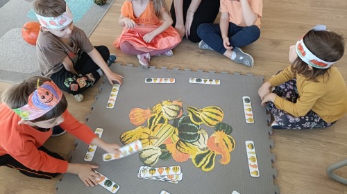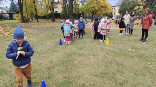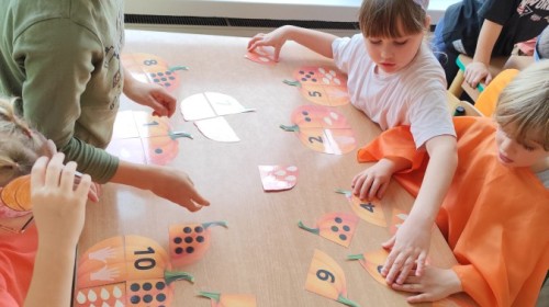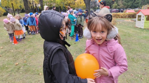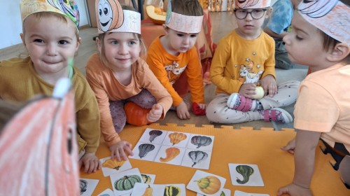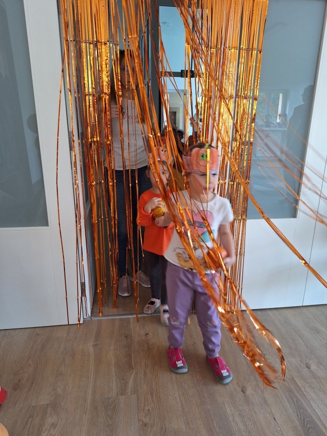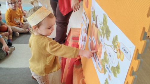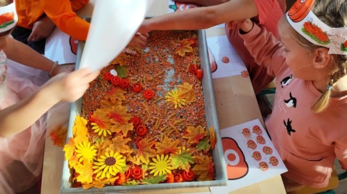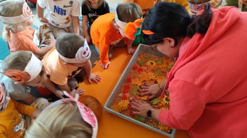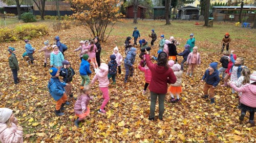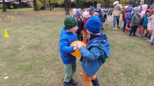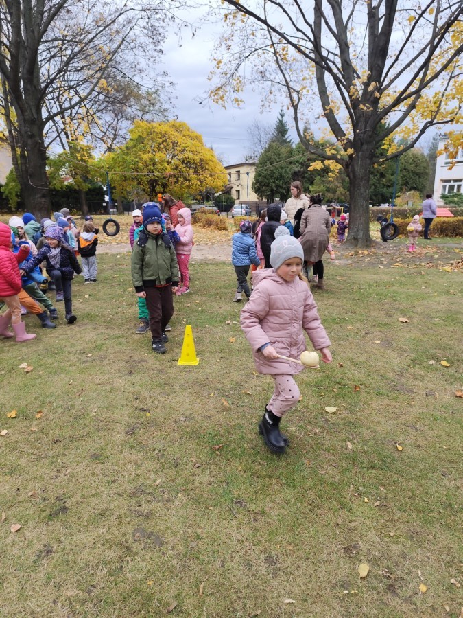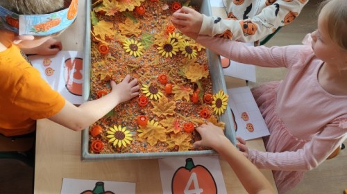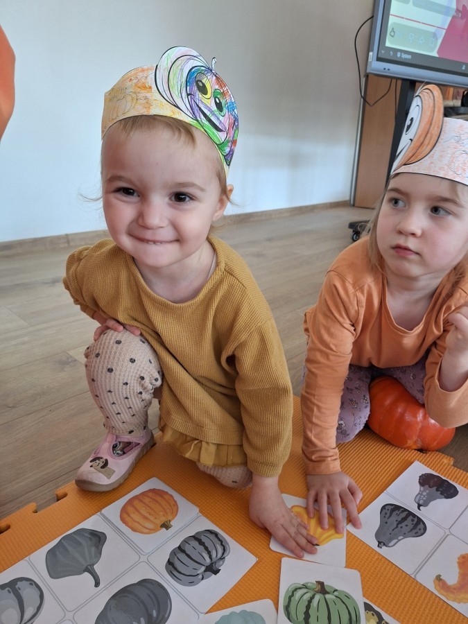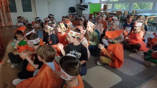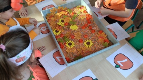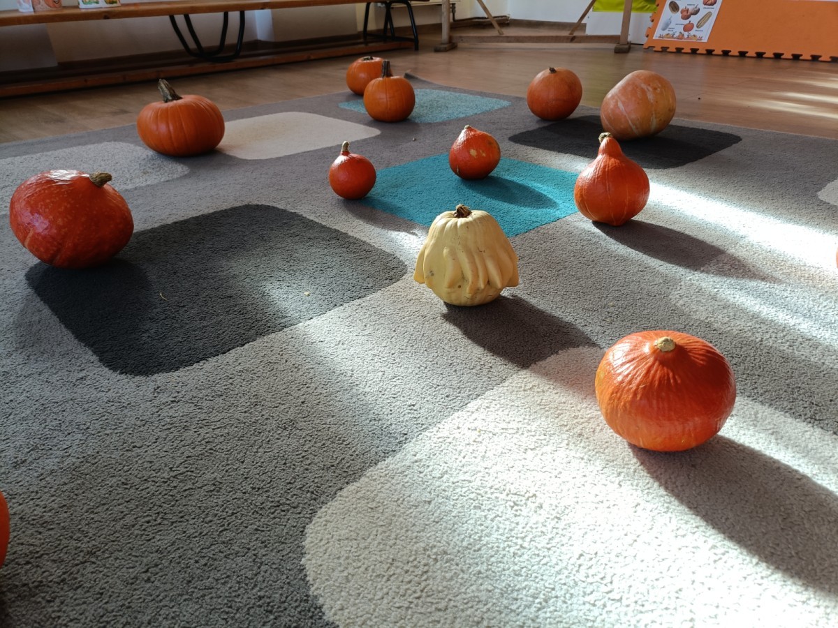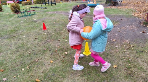 Dzieci z wszystkich grup poznały ciekawostki o dyniach, poznały budowę dyni, dowiedziały się jakie są rodzaje i odmiany dyni. Nie zabrakło zabaw muzyczno-ruchowych po polsku i po angielsku, tańców i zabaw matematycznych. Dzieci odszukiwały cienie, układały rytmy z dyń, wyszukiwały dynie w pudełku sensorycznym a także odkrywały ukryte przetwory z dyni przy pomocy latarek. Na koniec była gra terenowa oraz zabawy z dyniami i pomarańczowymi balonami w ogrodzie przedszkolnym zakończone tańcem na liściach do piosenki po angielsku "Fall freeze". Zabawa trwała dopóki z ogrodu nie przegonił nas jesienny deszcz. Wtedy przyszedł czas na obiad i pyszną zupkę dyniową!:)