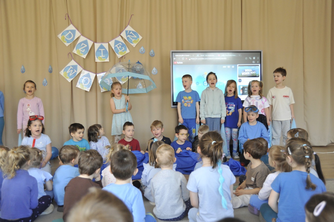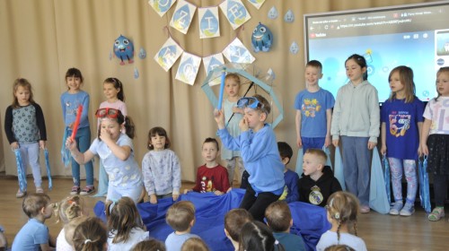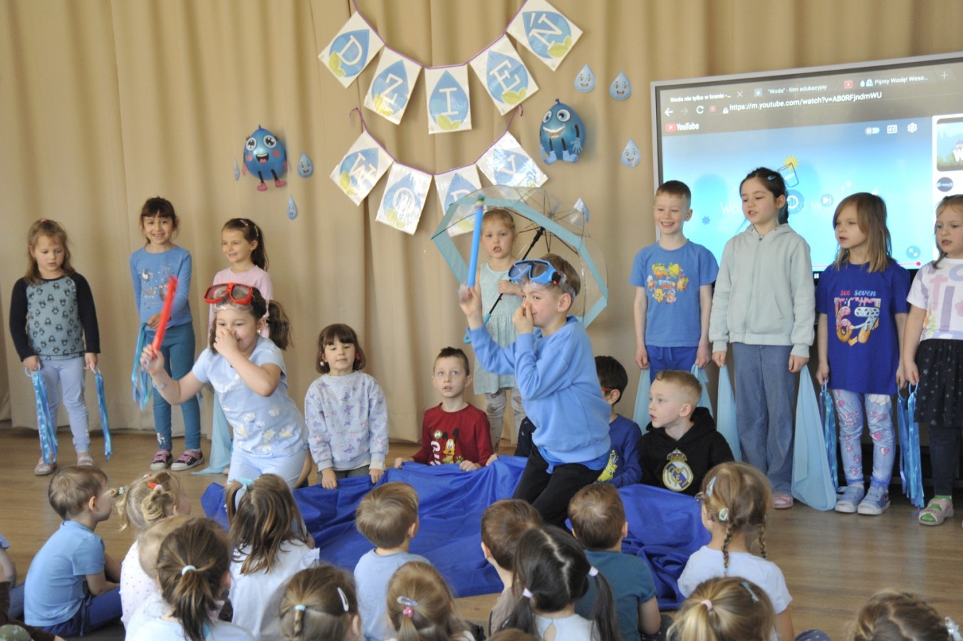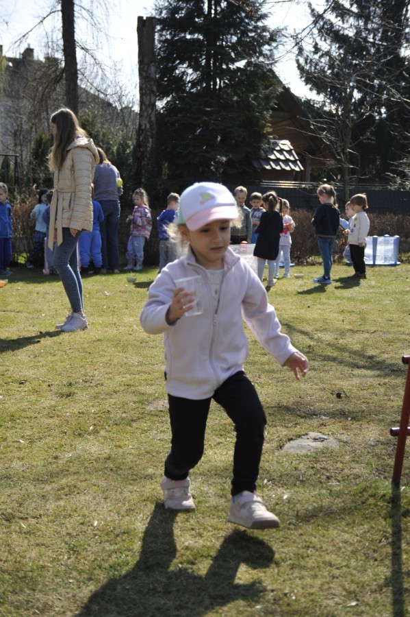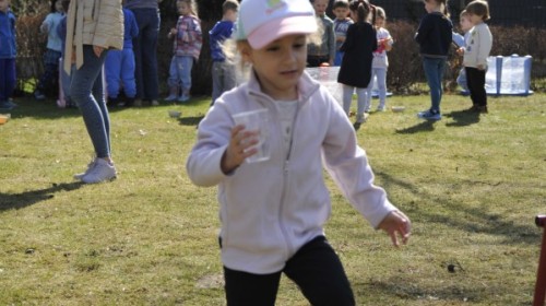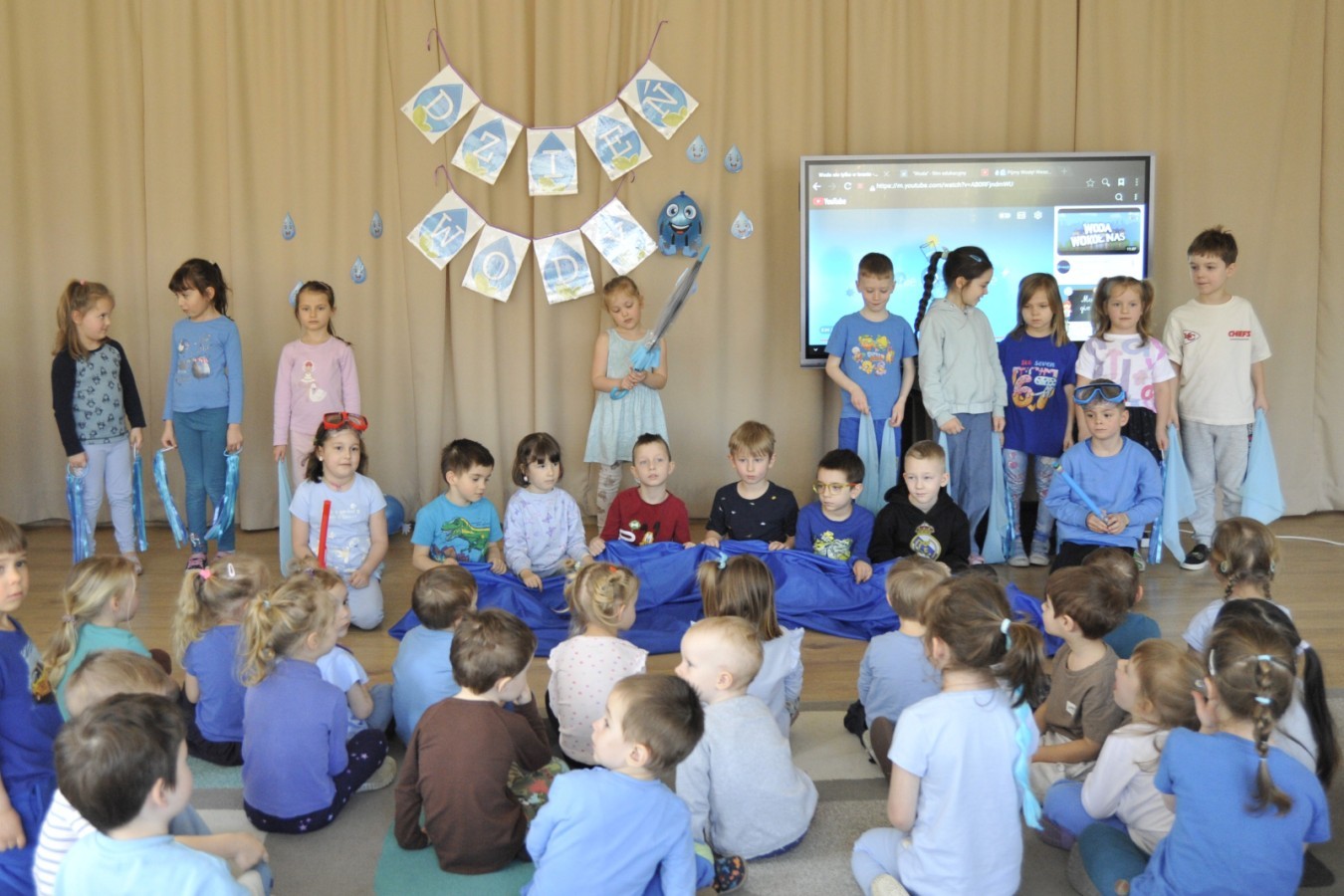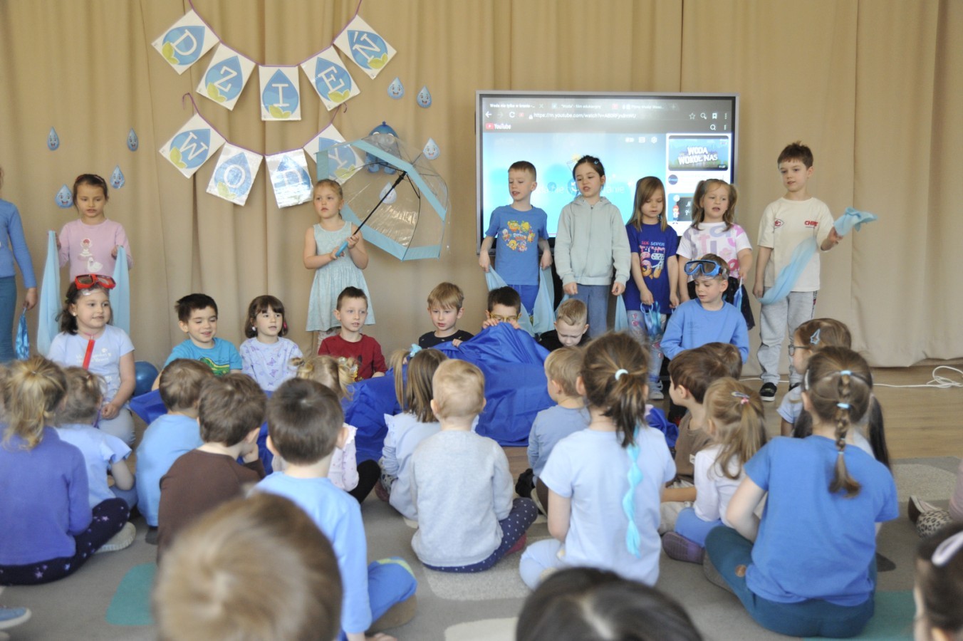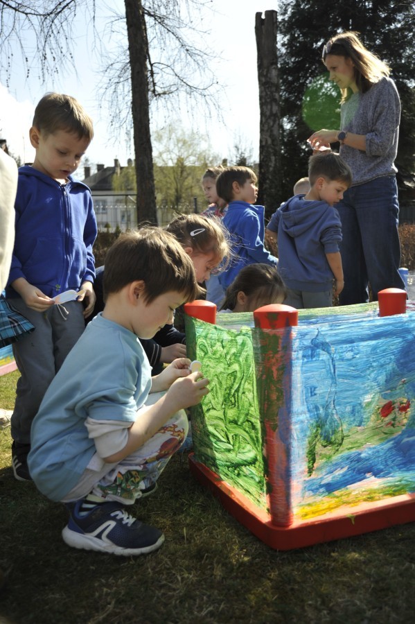 Ważnym punktem wydarzenia był również występ dzieci z grupy 3A, które zaprezentowały piękną piosenkę o wodzie we wspaniałej aranżacji. Nie zabrakło także aktywności na świeżym powietrzu. W ogrodzie przedszkolnym dzieci uczestniczyły w zabawach z wodą oraz bawiły się z chustą animacyjną. Podczas ekologicznego zadania przedszkolaki miały również za zadanie posegregować śmieci do odpowiednich pudeł, ucząc się w praktyce, jak prawidłowo dbać o środowisko. Dzieci rozwijały także swoją kreatywność podczas malowania na stretchowej folii.