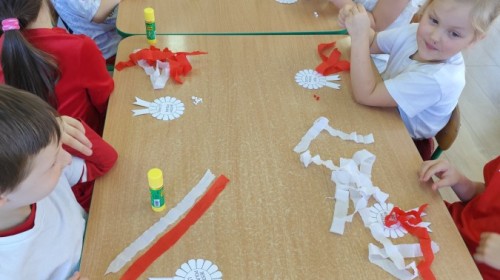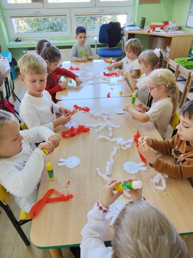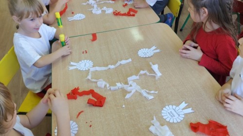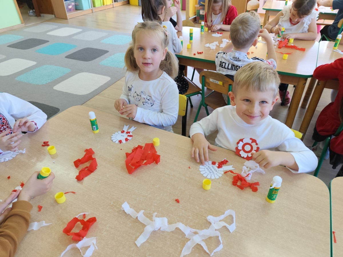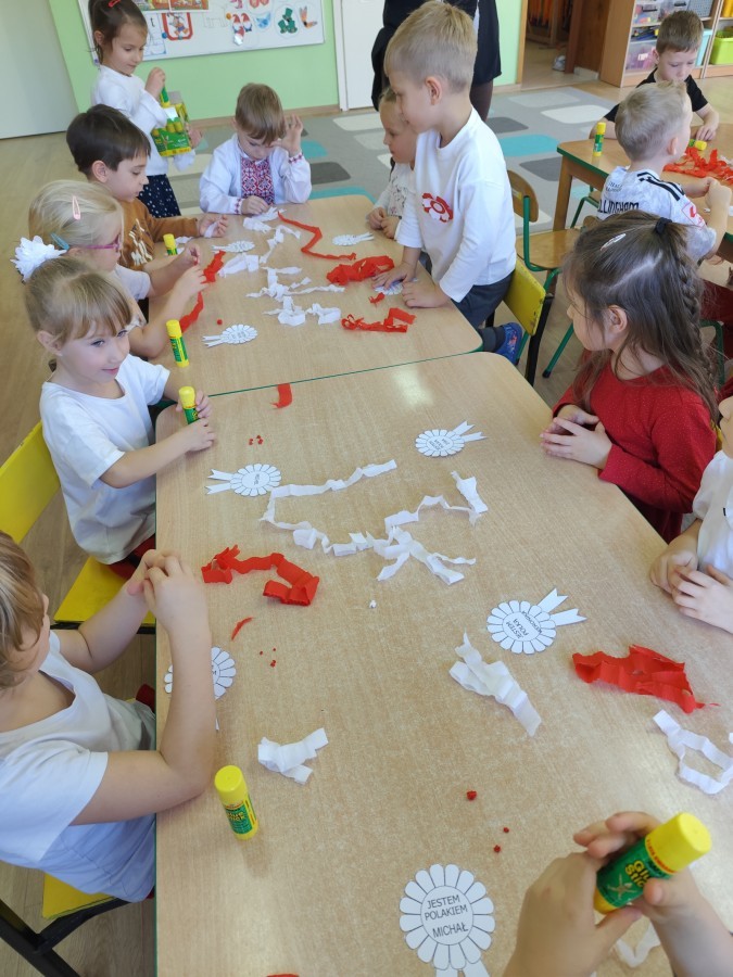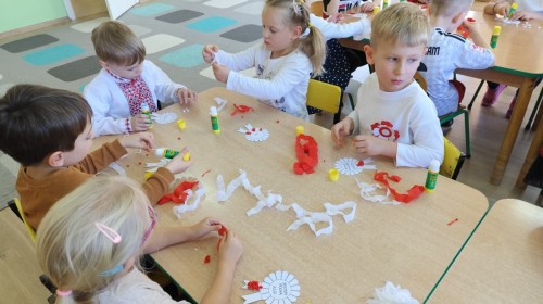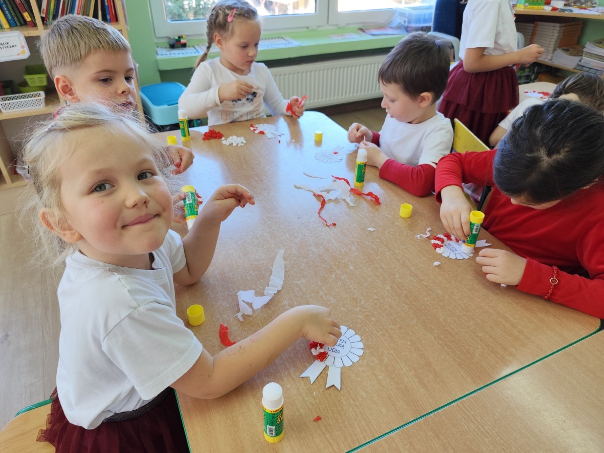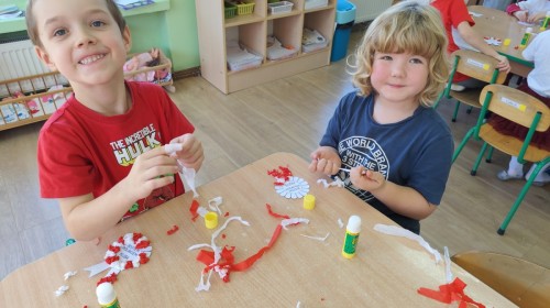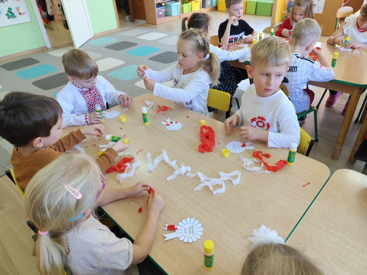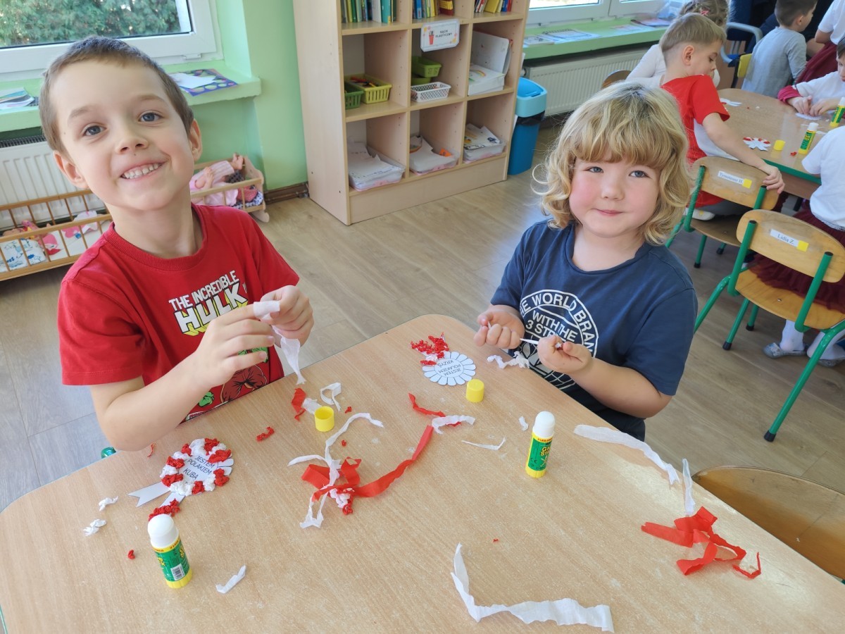 W piątek, 7 listopada, przygotowaliśmy kotyliony, które wykorzystaliśmy do przedszkolnych obchodów Święta Niepodległości.