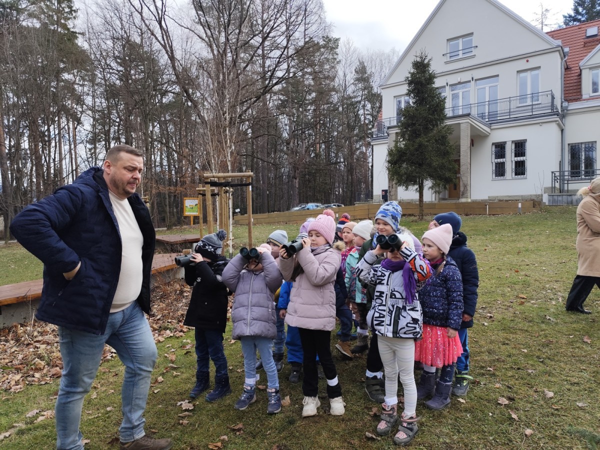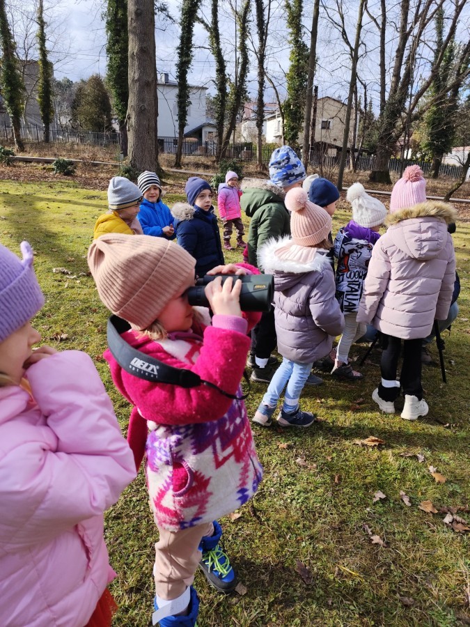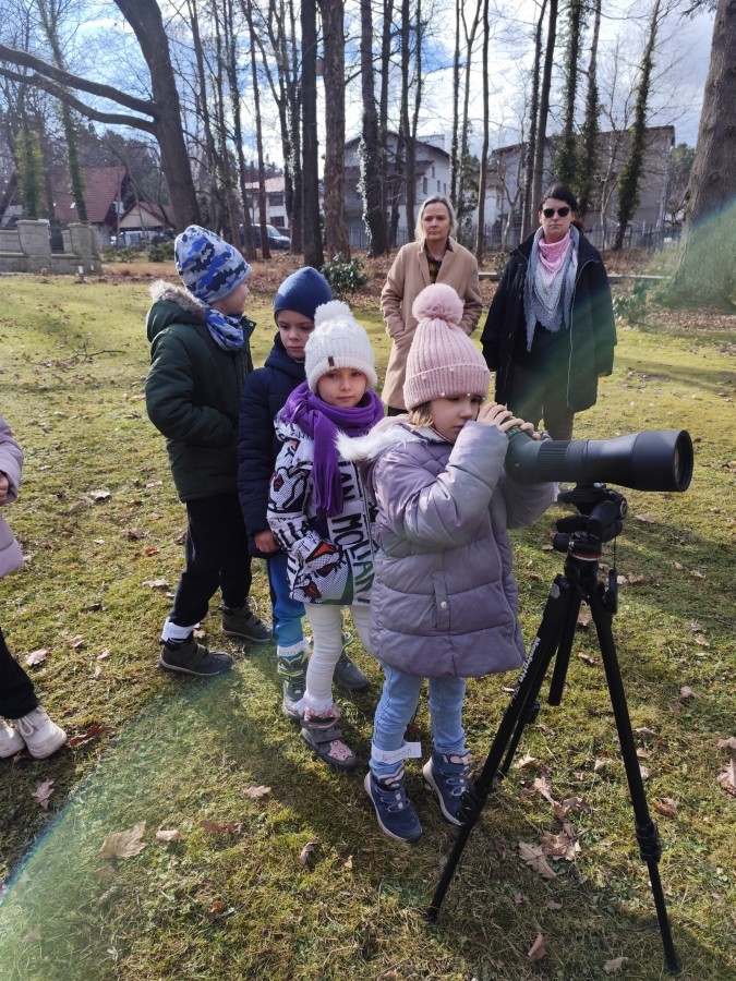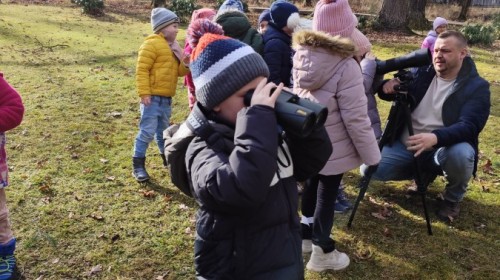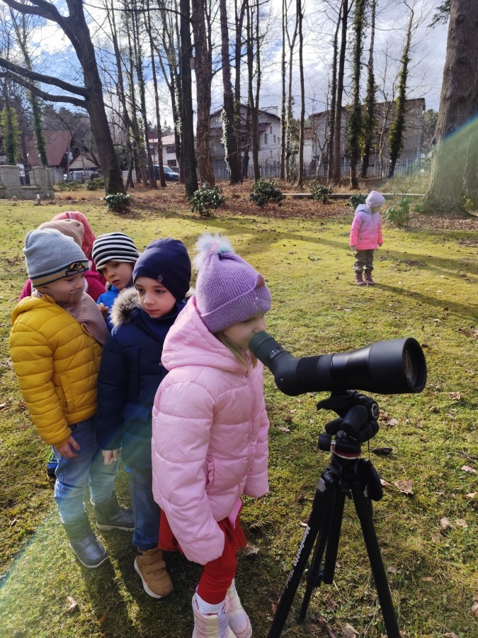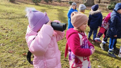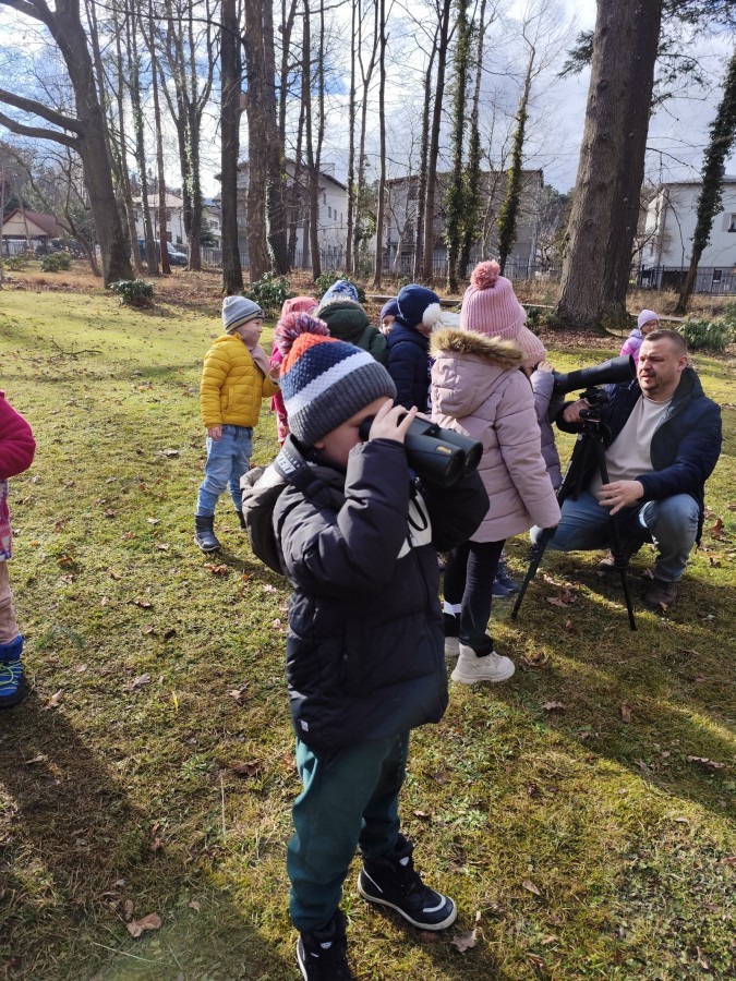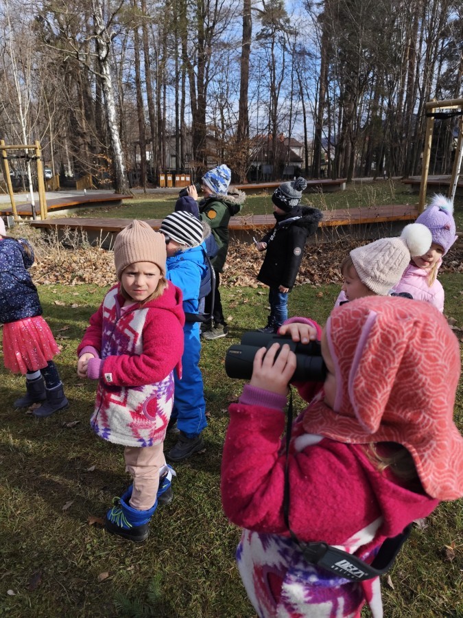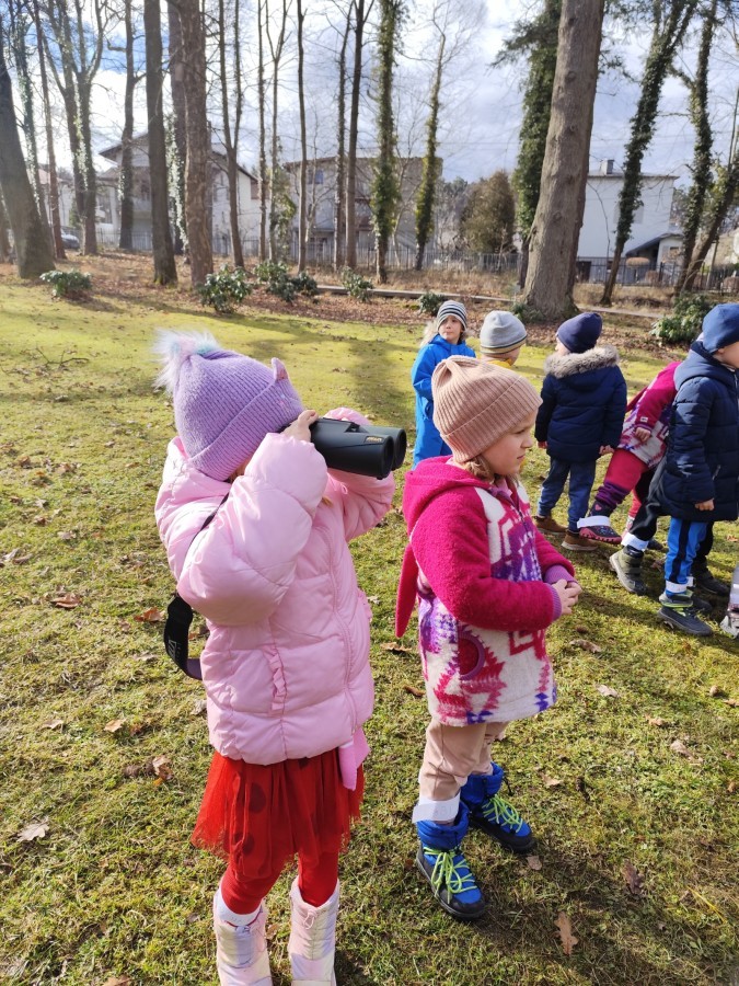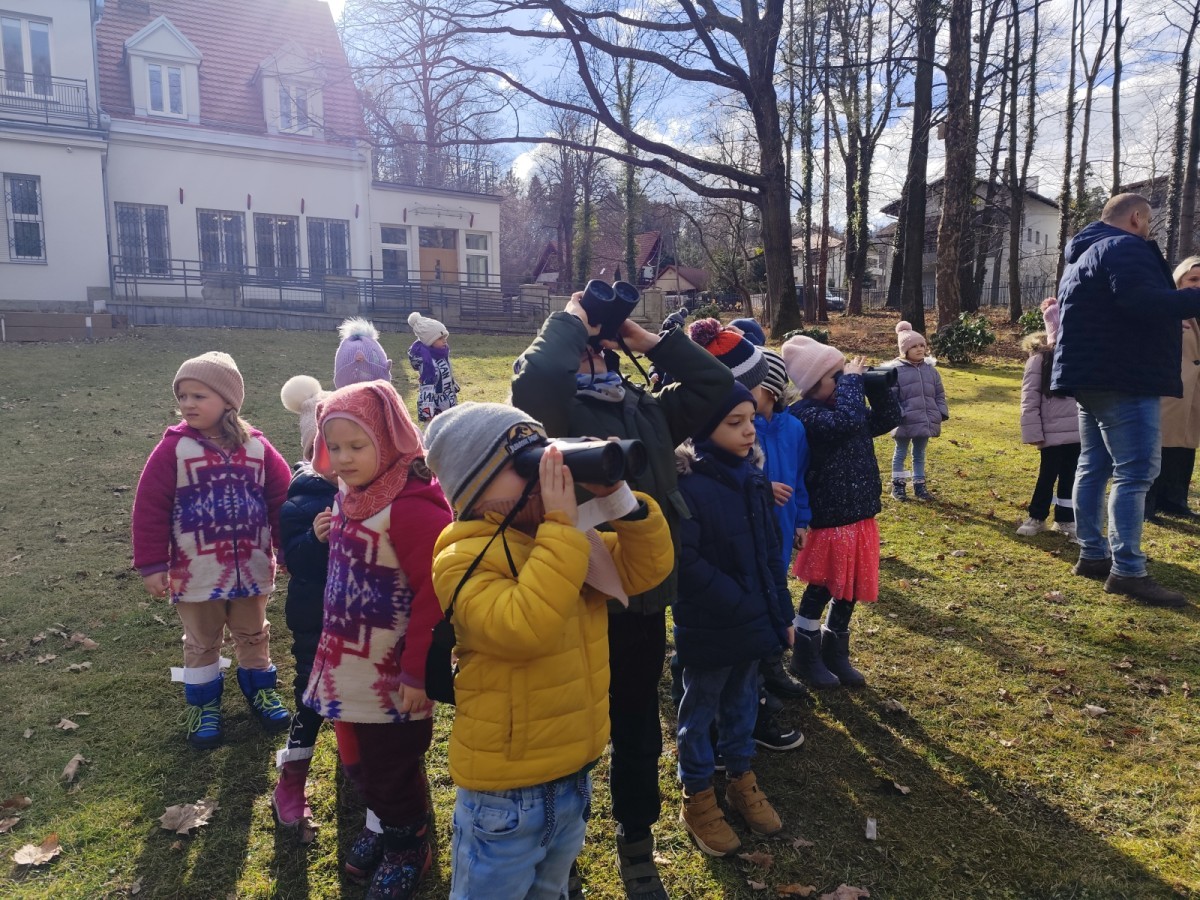 Podczas wizyty wyszliśmy również do ogrodu znajdującego się obok Centrum, gdzie dzieci — przy pomocy lornetek — mogły obserwować ptaki przelatujące między drzewami. Przedszkolaki wykonały papierowe ptaszki, dowiedziały się, na czym polega obrączkowanie ptaków, a także stworzyły własne „obrączki” na rękę lub nogę.