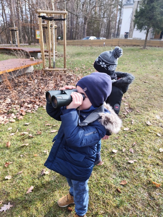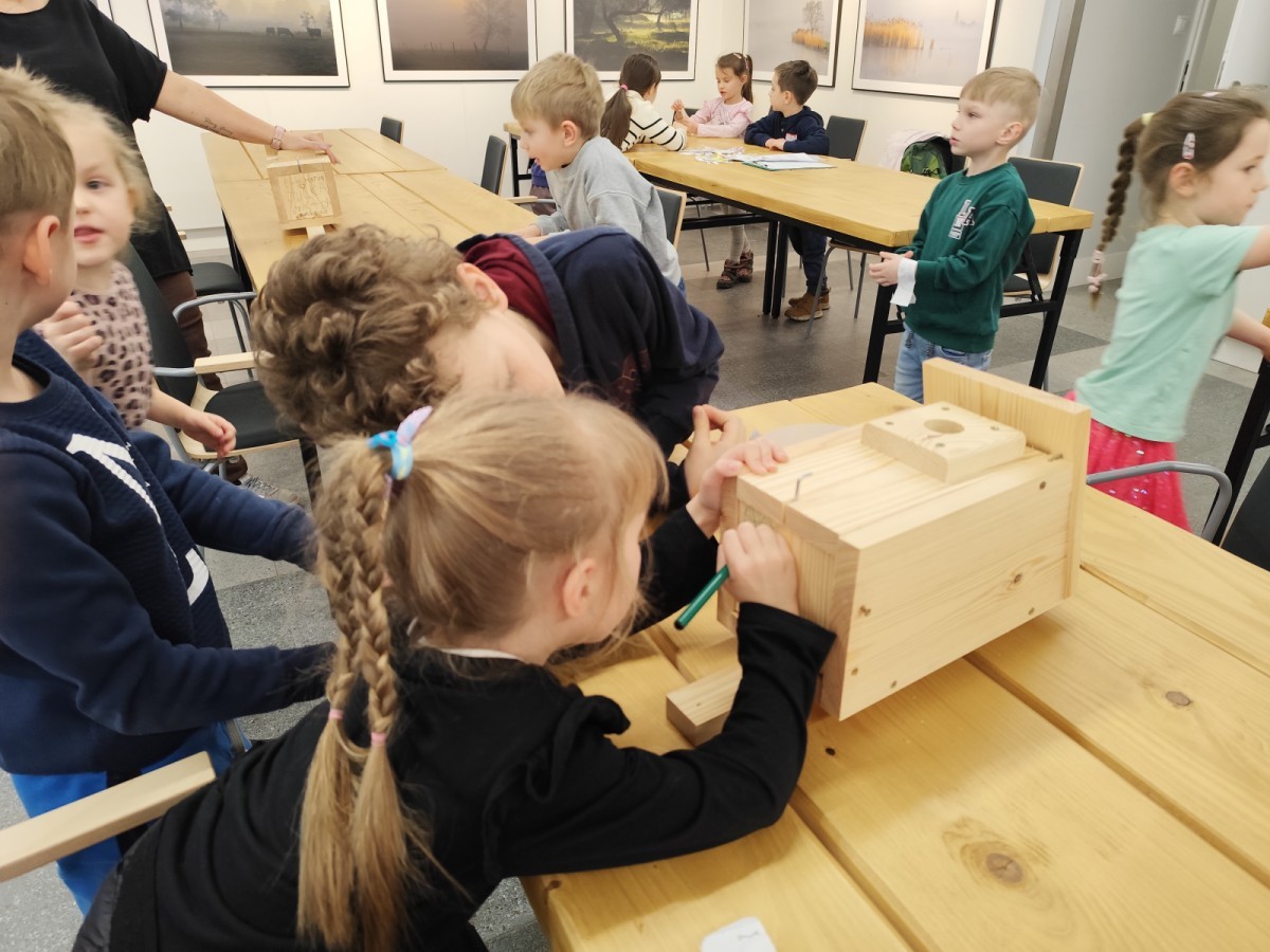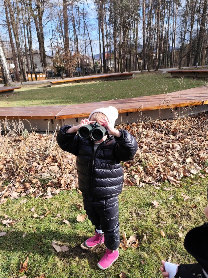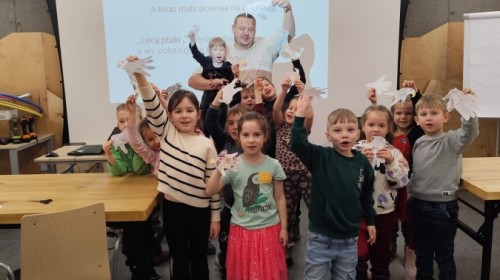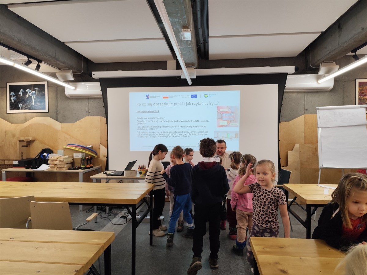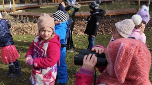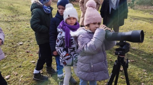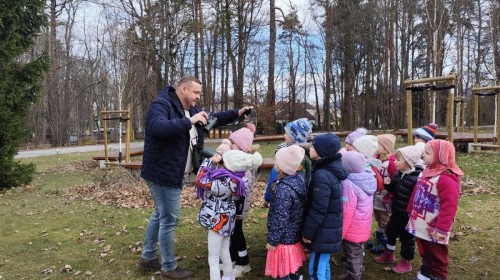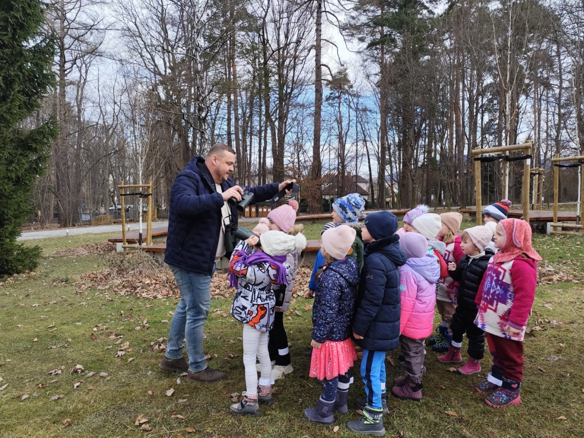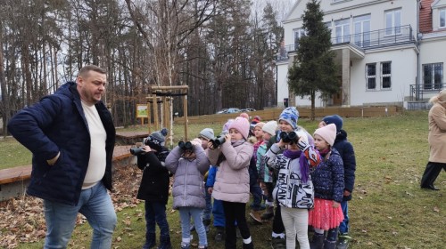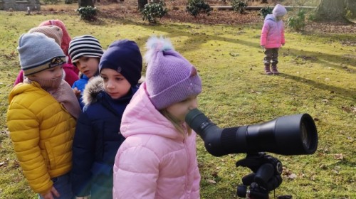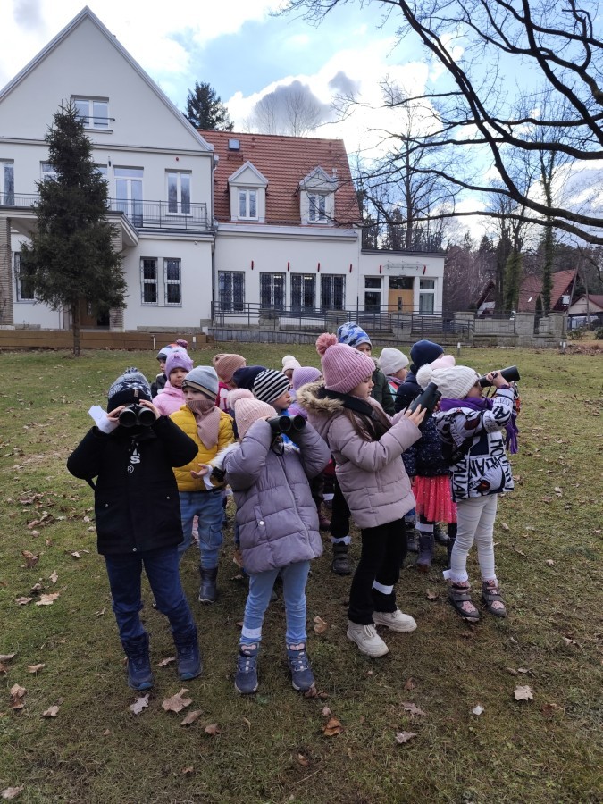 Podczas wizyty wyszliśmy również do ogrodu znajdującego się obok Centrum, gdzie dzieci — przy pomocy lornetek — mogły obserwować ptaki przelatujące między drzewami. Przedszkolaki wykonały papierowe ptaszki, dowiedziały się, na czym polega obrączkowanie ptaków, a także stworzyły własne „obrączki” na rękę lub nogę.