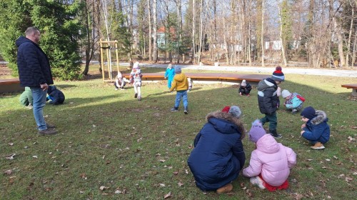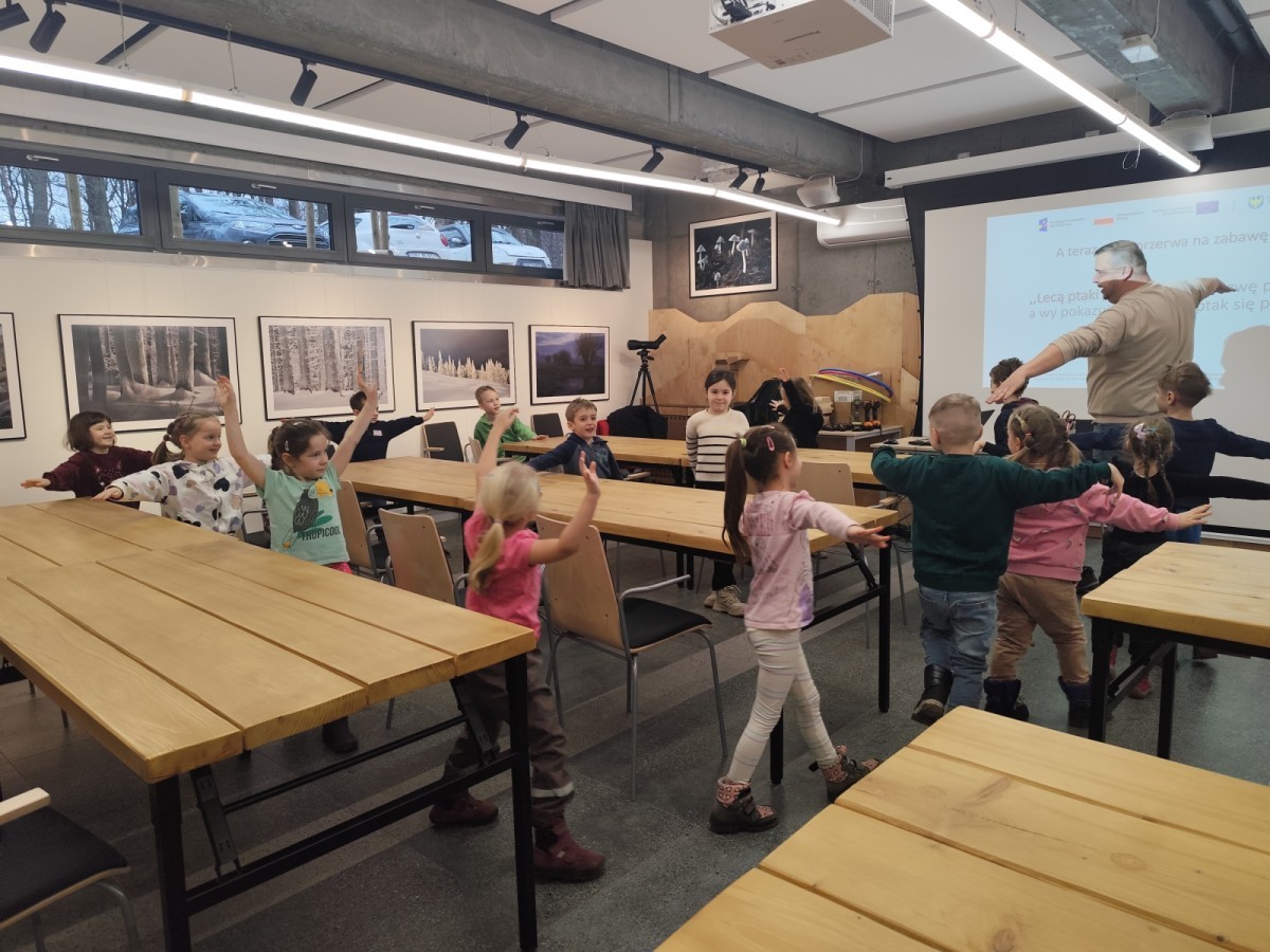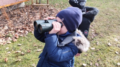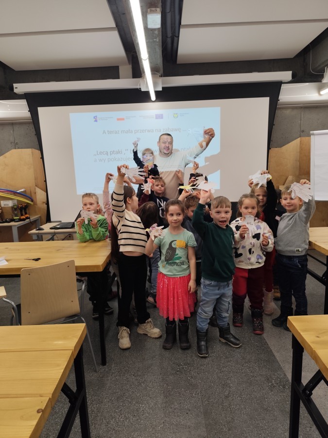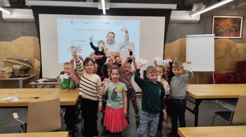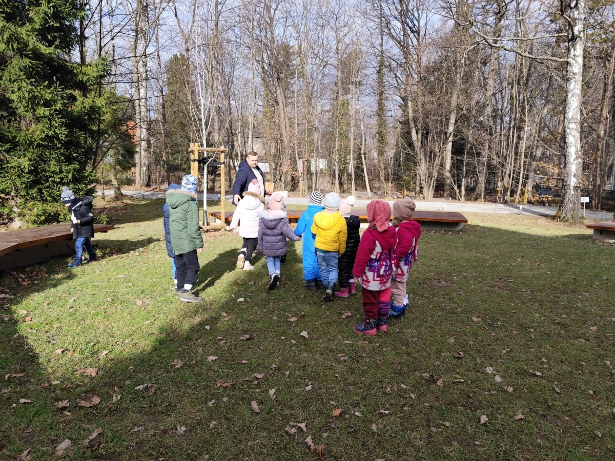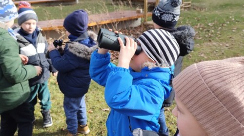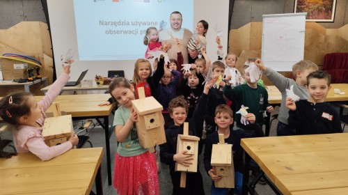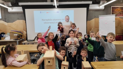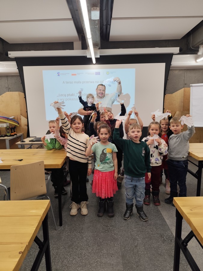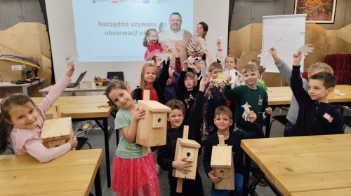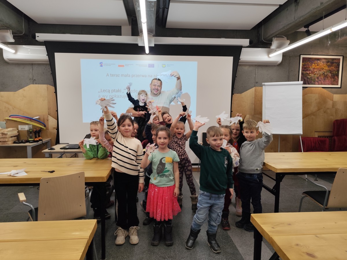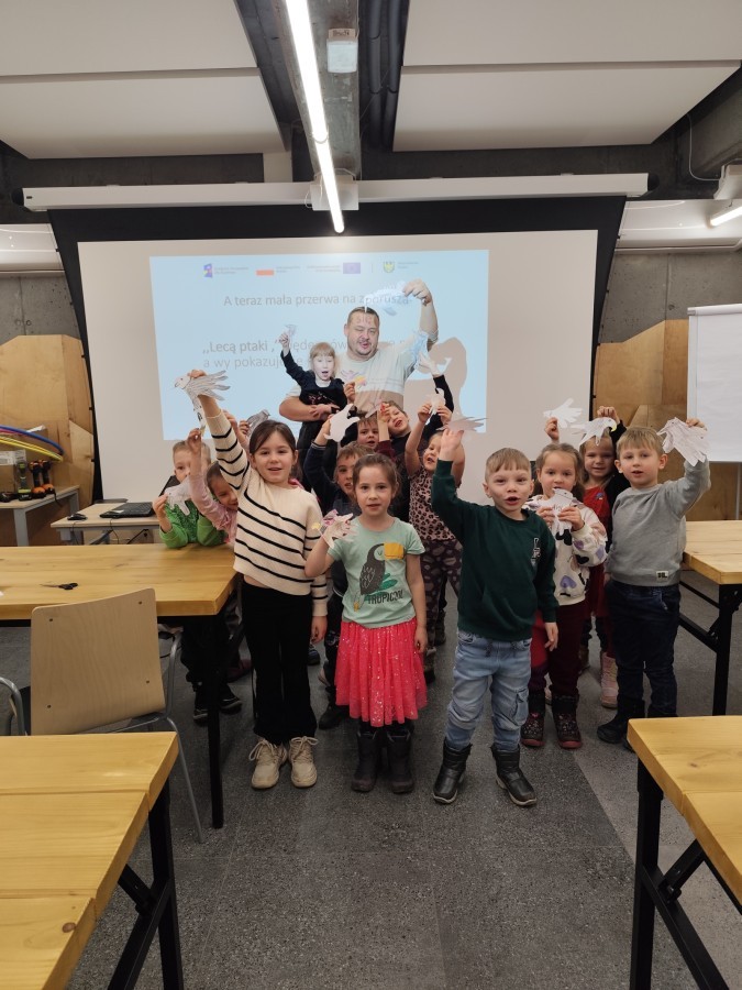 Podczas wizyty wyszliśmy również do ogrodu znajdującego się obok Centrum, gdzie dzieci — przy pomocy lornetek — mogły obserwować ptaki przelatujące między drzewami. Przedszkolaki wykonały papierowe ptaszki, dowiedziały się, na czym polega obrączkowanie ptaków, a także stworzyły własne „obrączki” na rękę lub nogę.