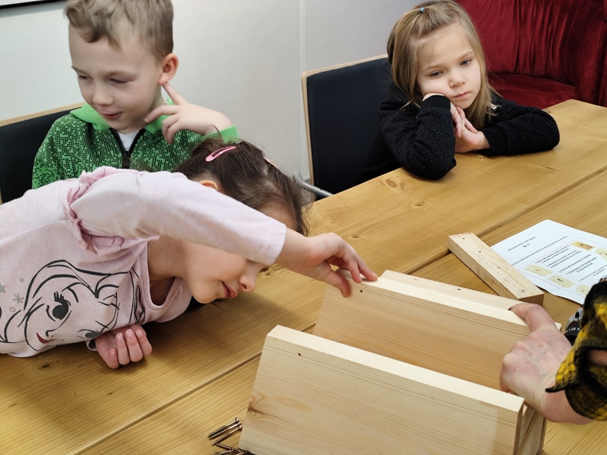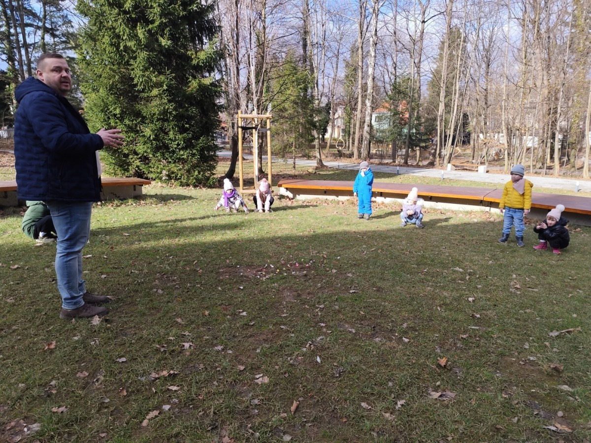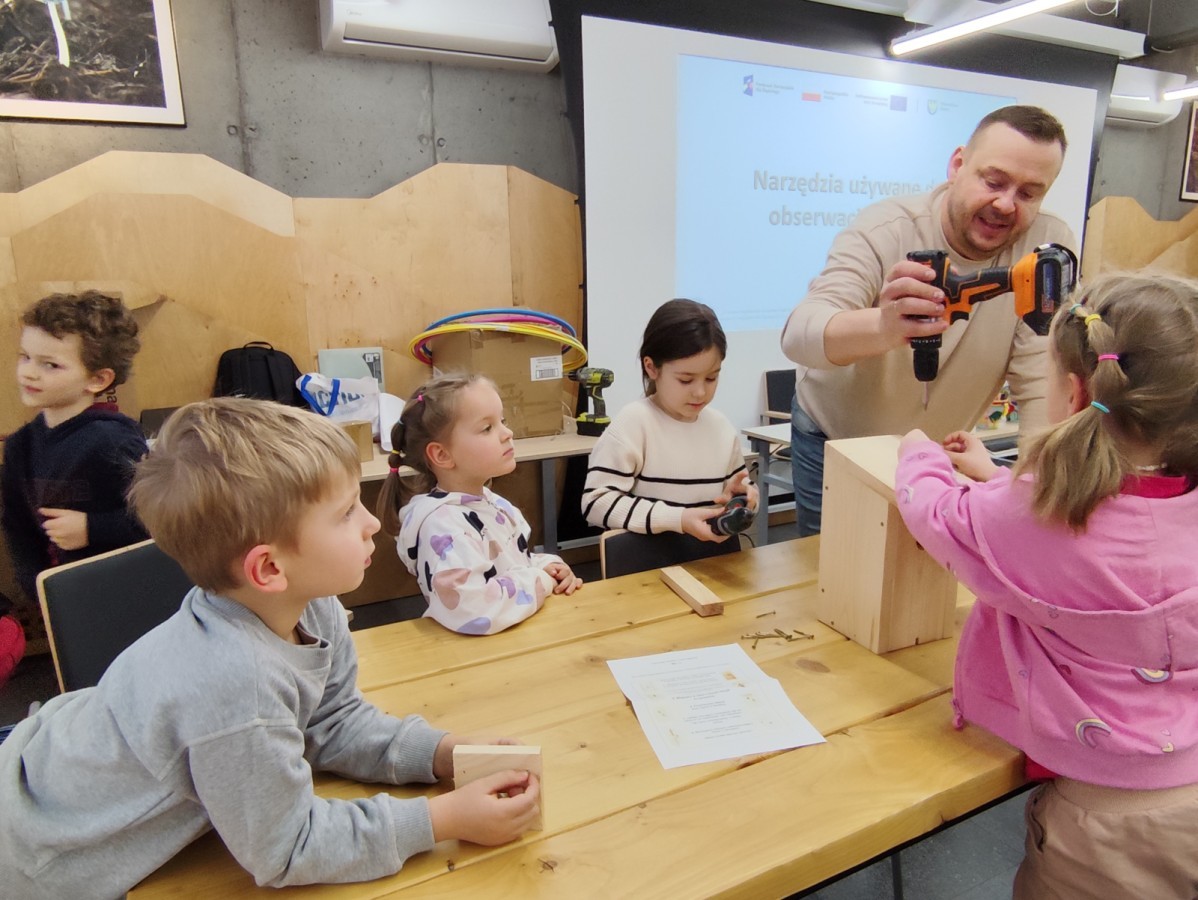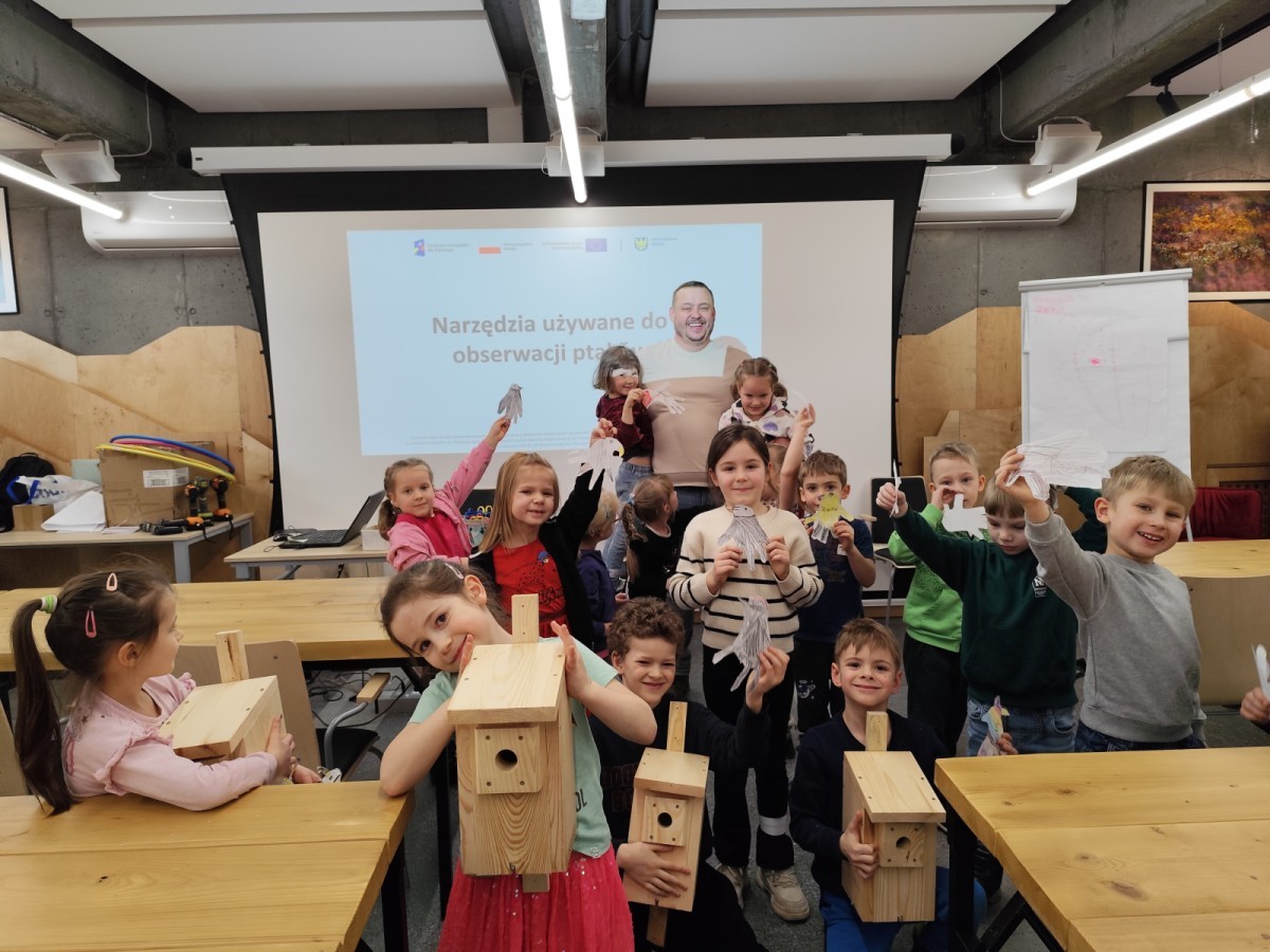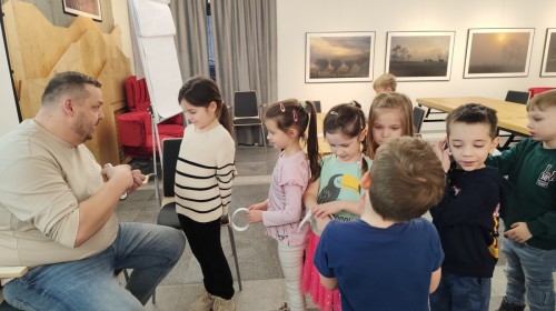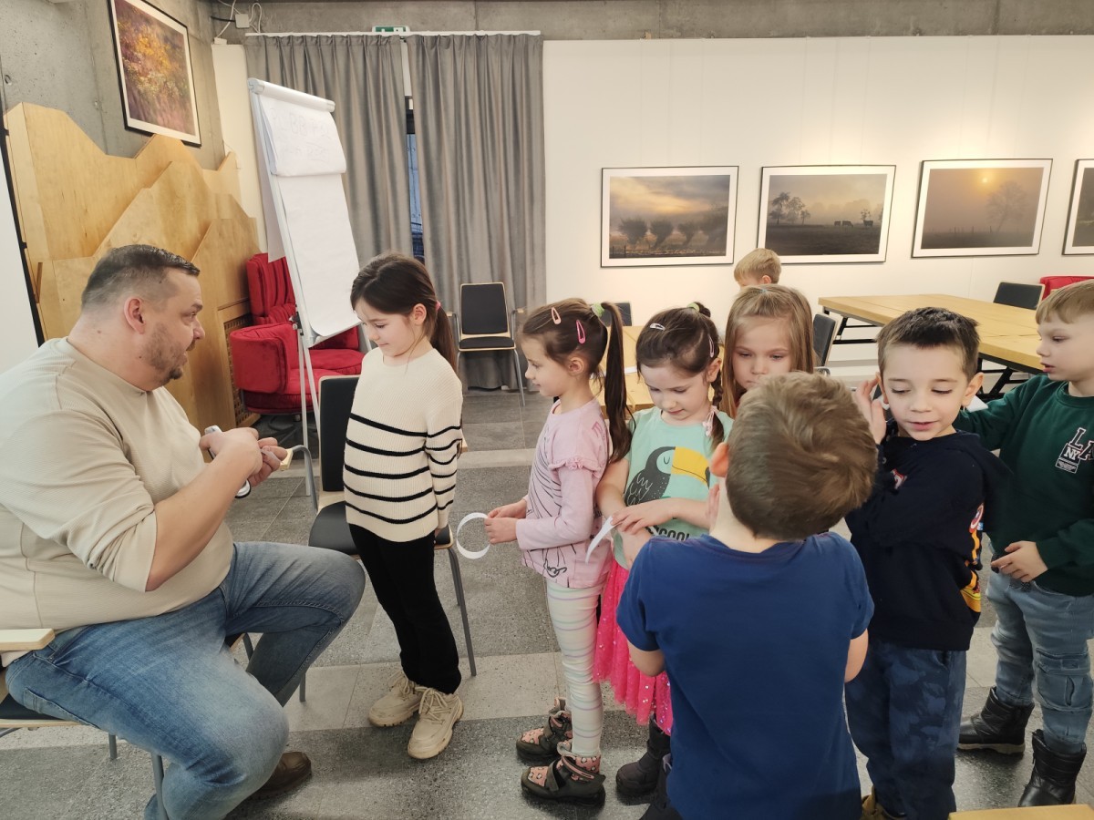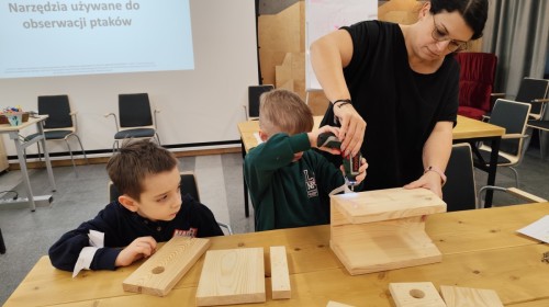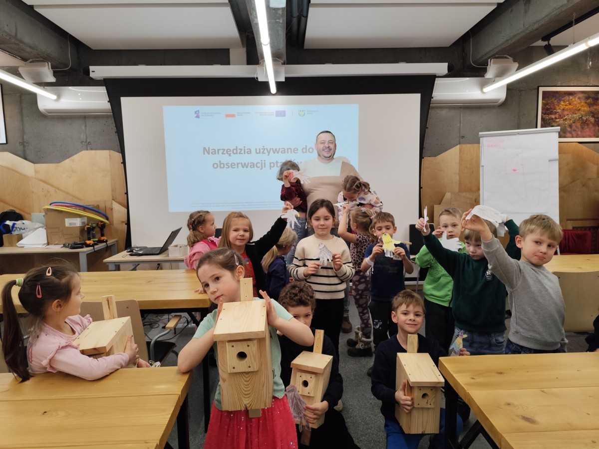Podczas wizyty wyszliśmy również do ogrodu znajdującego się obok Centrum, gdzie dzieci — przy pomocy lornetek — mogły obserwować ptaki przelatujące między drzewami. Przedszkolaki wykonały papierowe ptaszki, dowiedziały się, na czym polega obrączkowanie ptaków, a także stworzyły własne „obrączki” na rękę lub nogę.