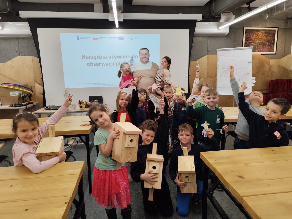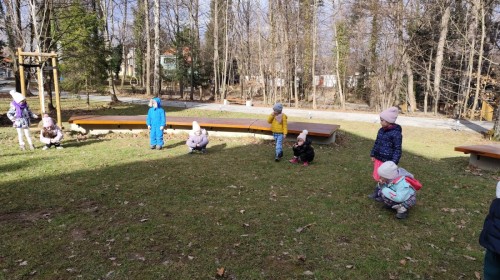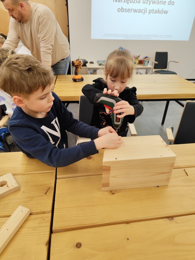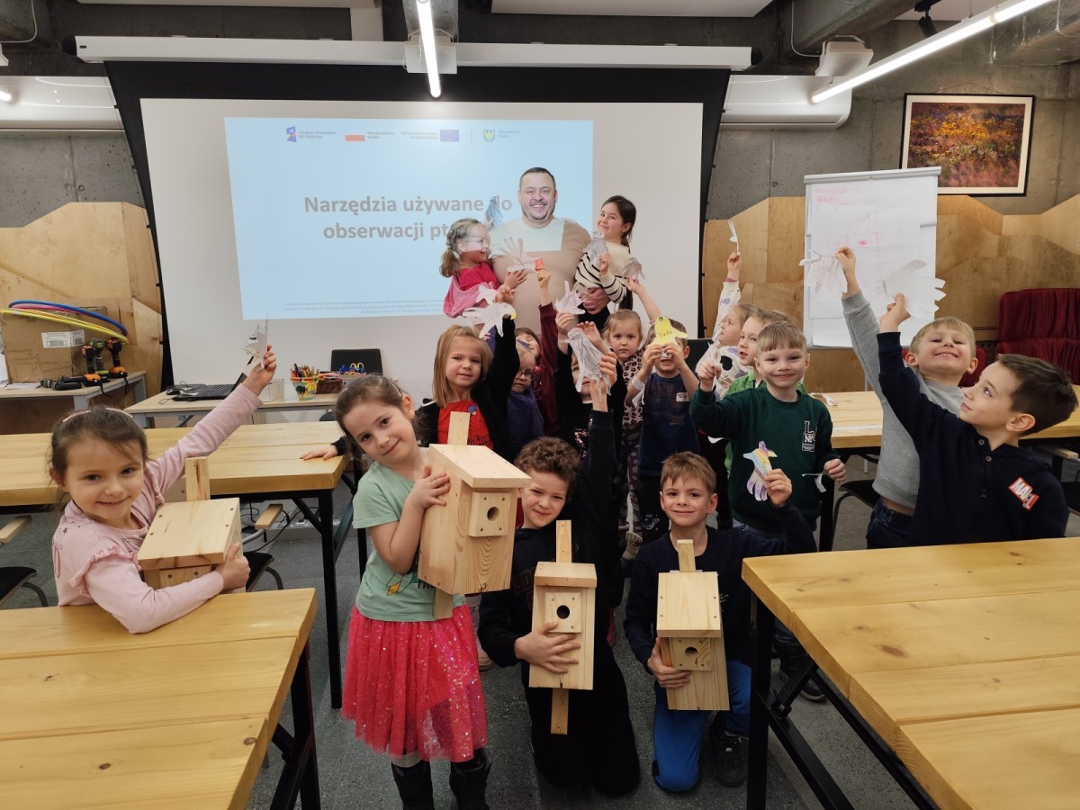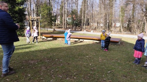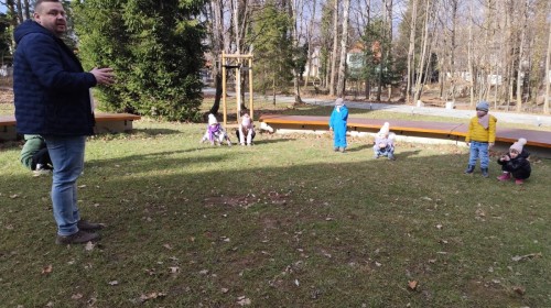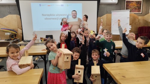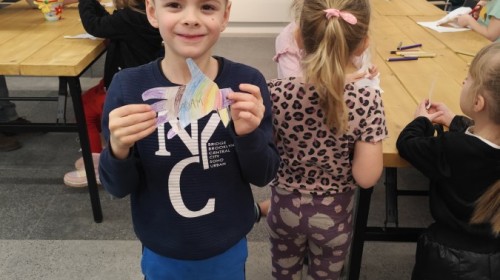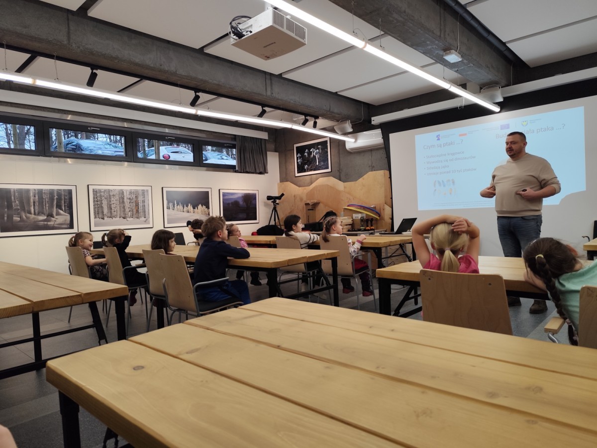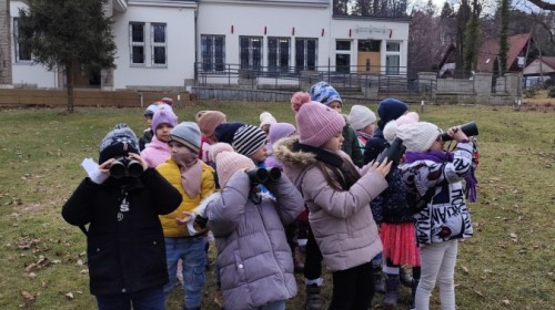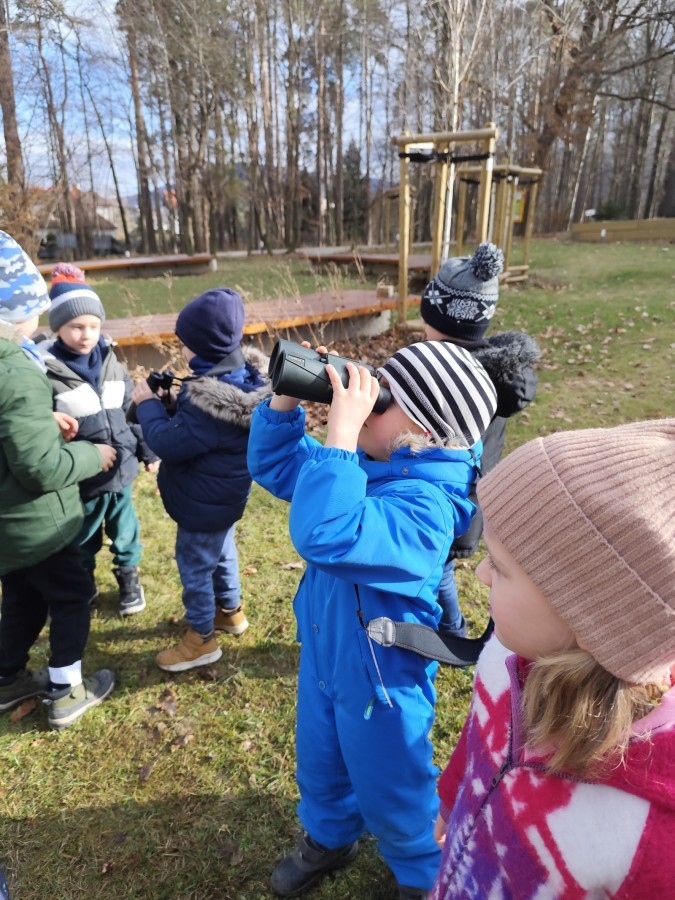 Podczas wizyty wyszliśmy również do ogrodu znajdującego się obok Centrum, gdzie dzieci — przy pomocy lornetek — mogły obserwować ptaki przelatujące między drzewami. Przedszkolaki wykonały papierowe ptaszki, dowiedziały się, na czym polega obrączkowanie ptaków, a także stworzyły własne „obrączki” na rękę lub nogę.