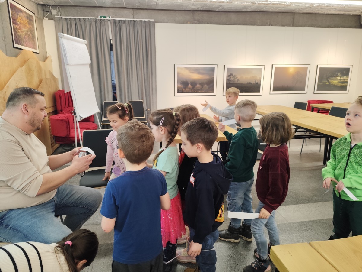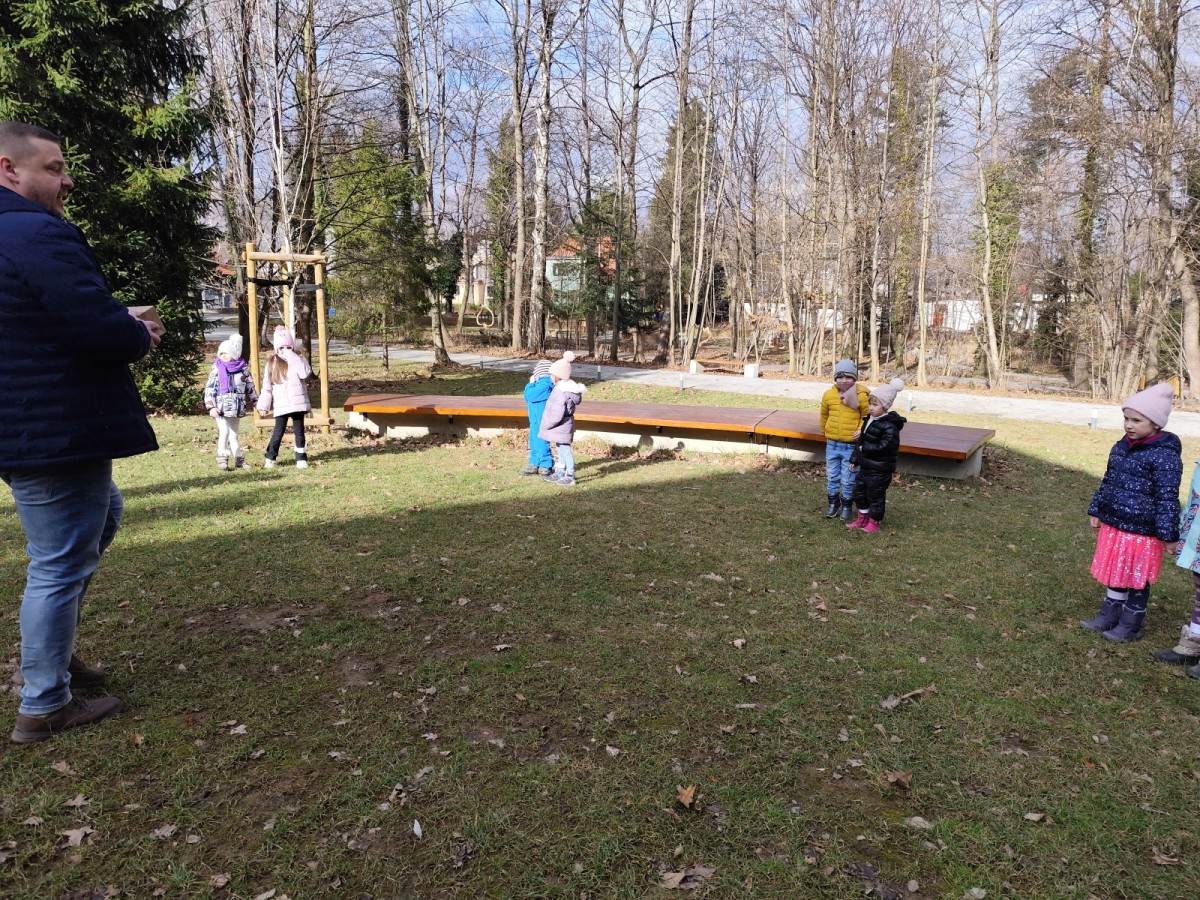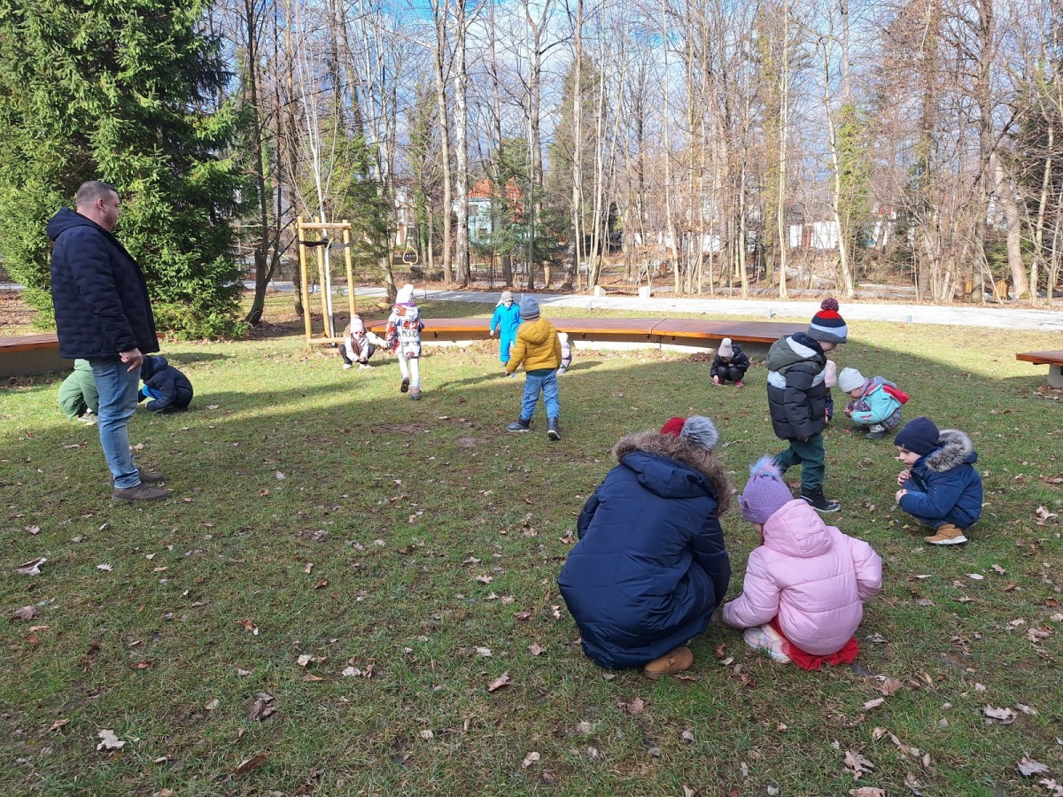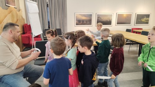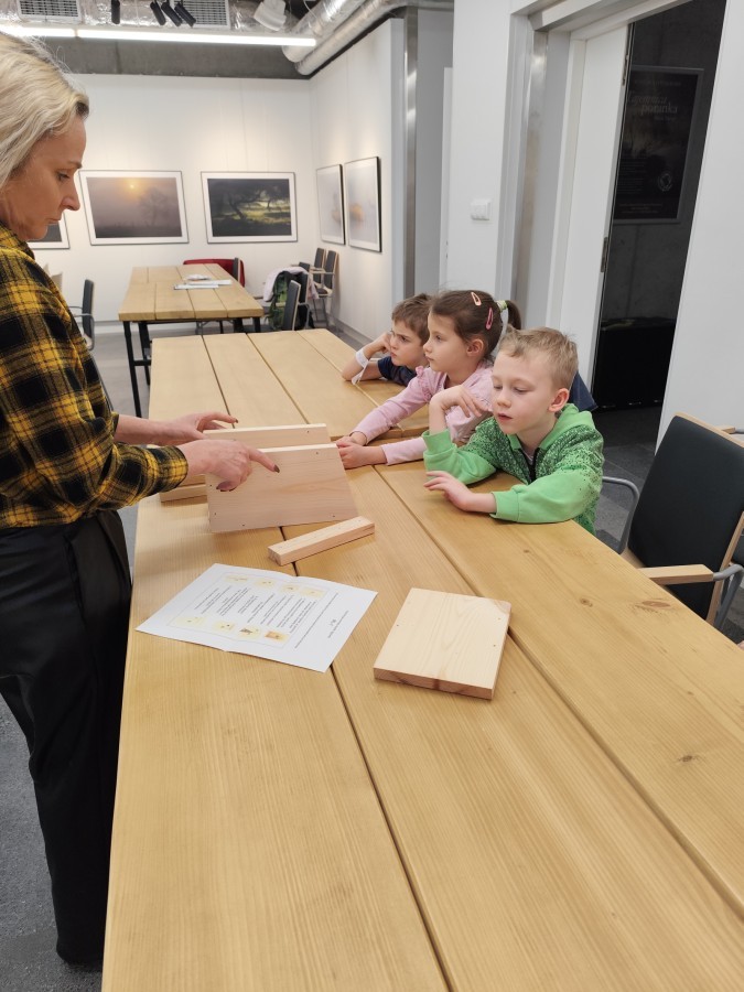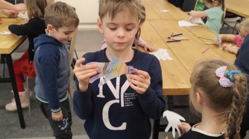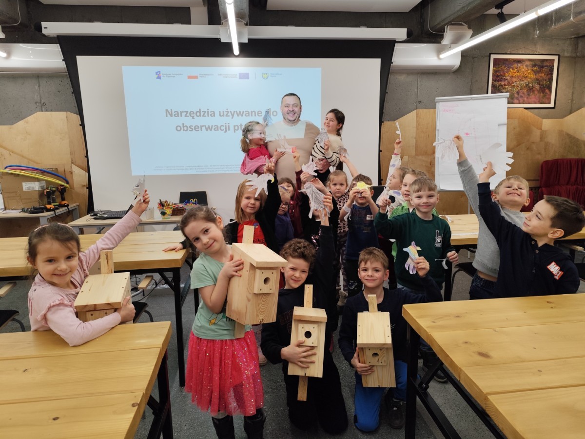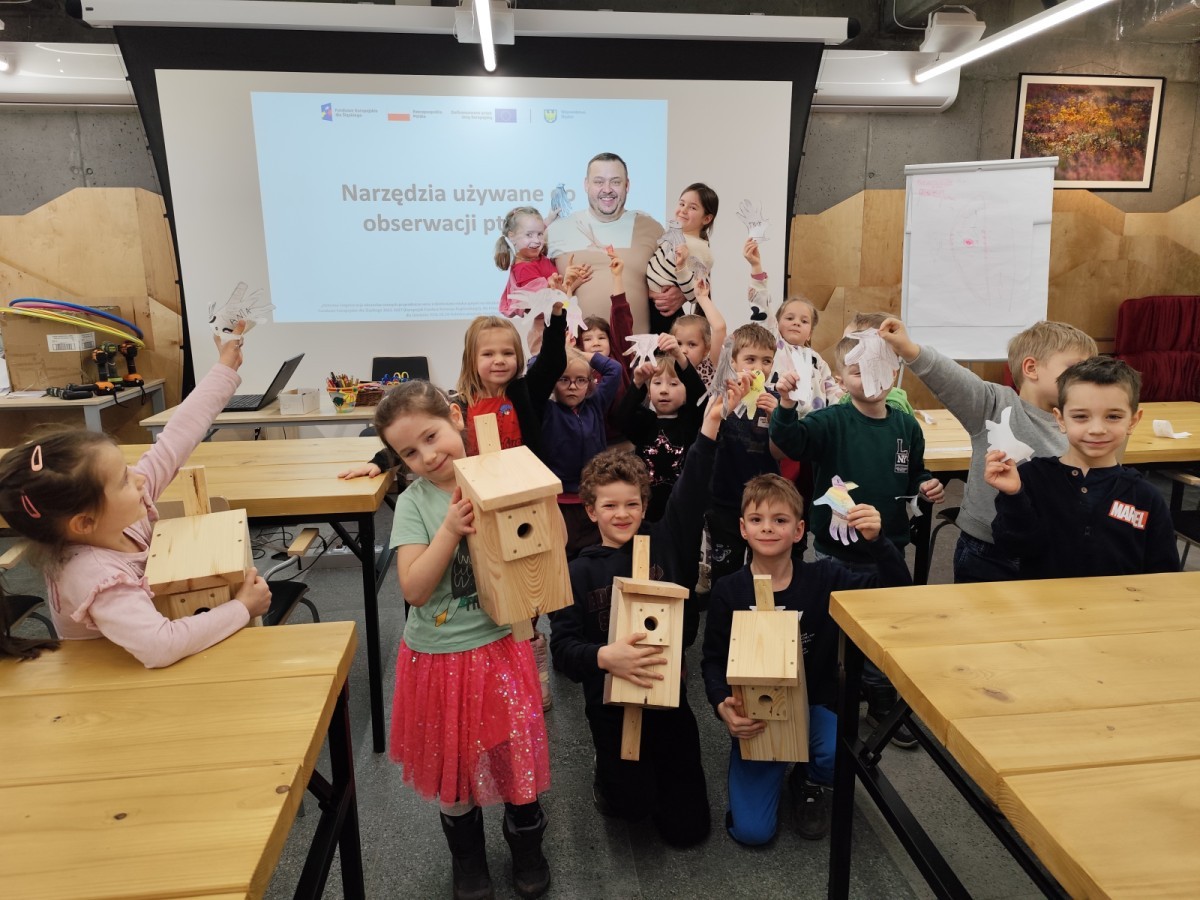 Podczas wizyty wyszliśmy również do ogrodu znajdującego się obok Centrum, gdzie dzieci — przy pomocy lornetek — mogły obserwować ptaki przelatujące między drzewami. Przedszkolaki wykonały papierowe ptaszki, dowiedziały się, na czym polega obrączkowanie ptaków, a także stworzyły własne „obrączki” na rękę lub nogę.