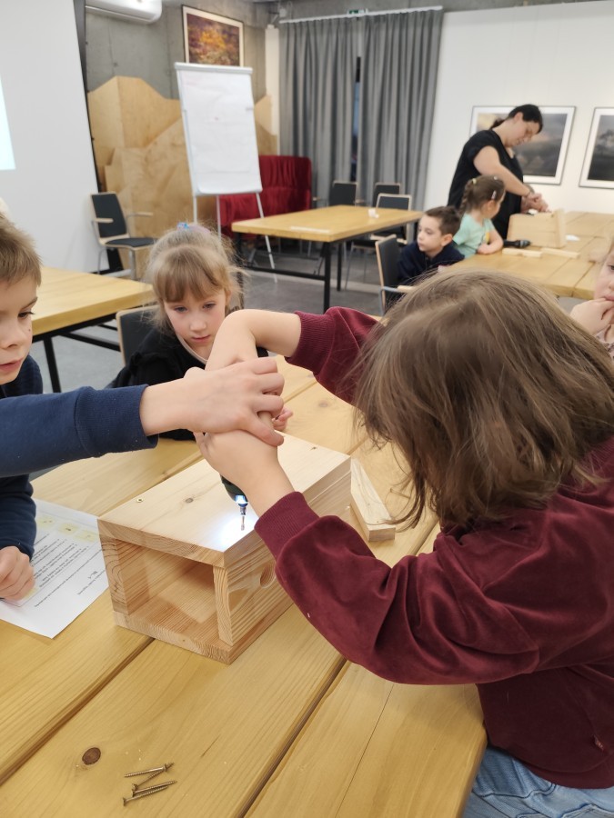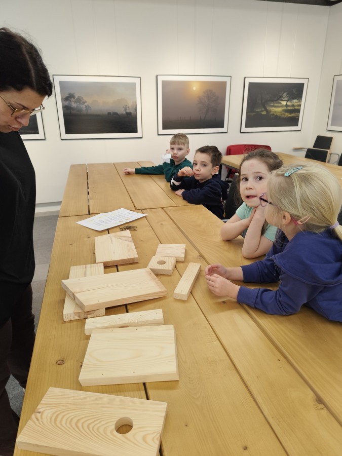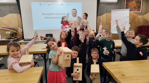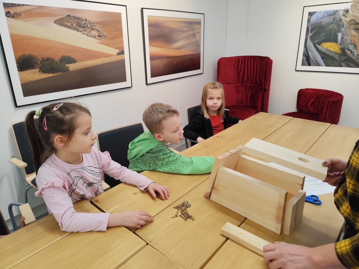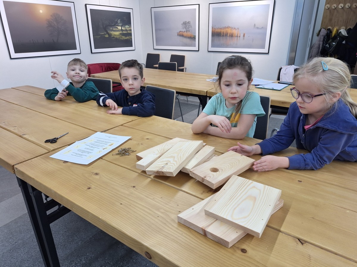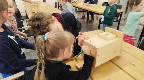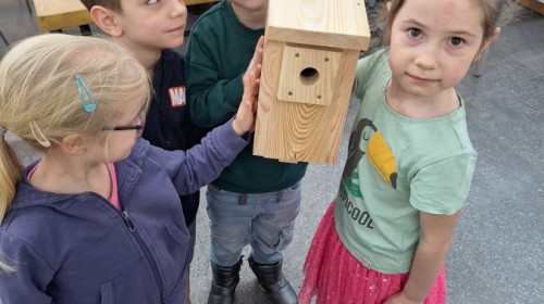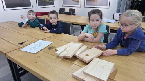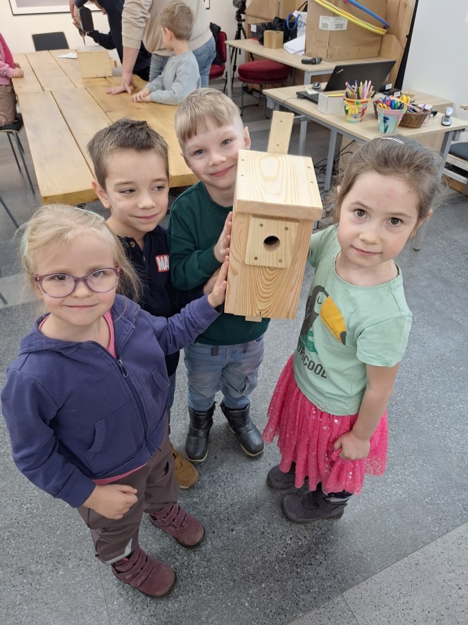Na zakończenie warsztatów dzieci w grupach przygotowały piękne budki dla ptaków. Zabraliśmy je do przedszkola i już wkrótce zawisną na drzewach w naszym ogrodzie.