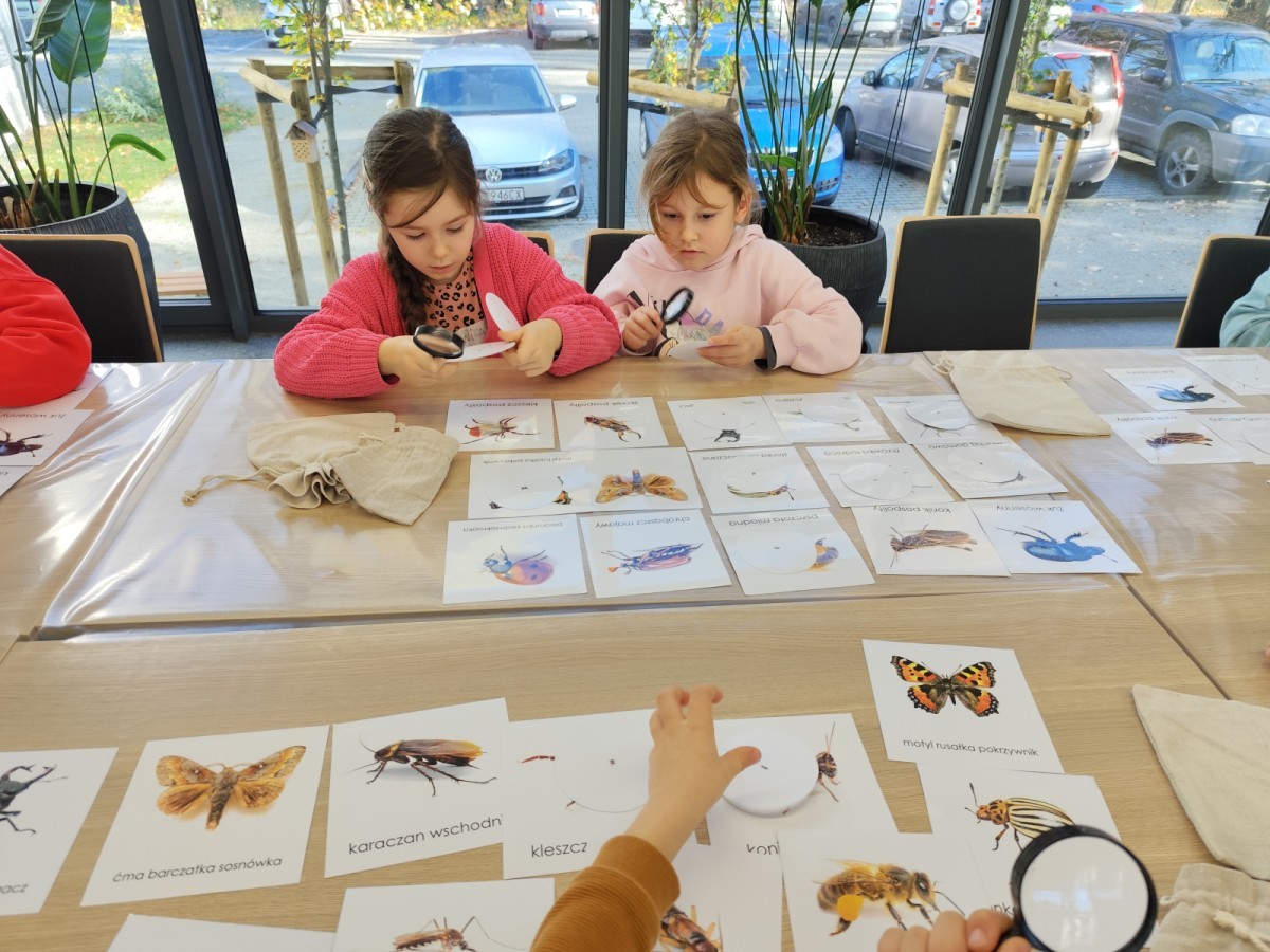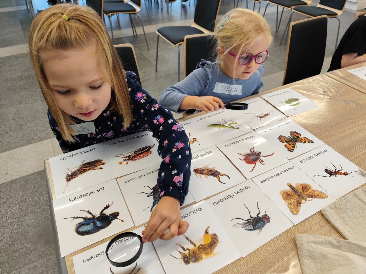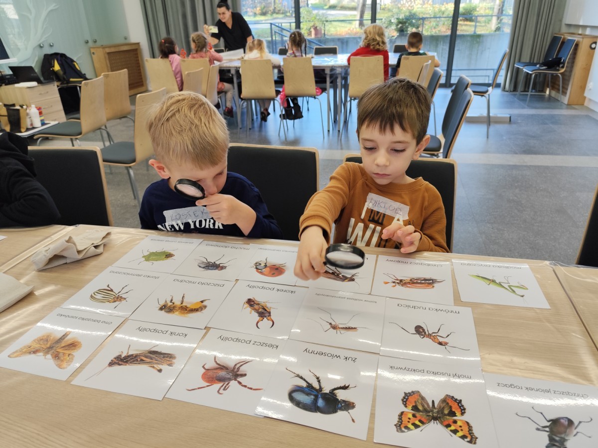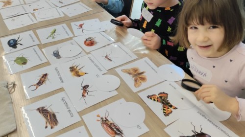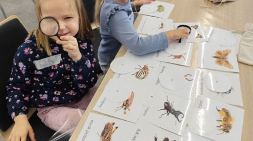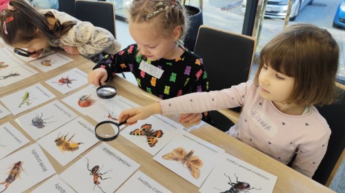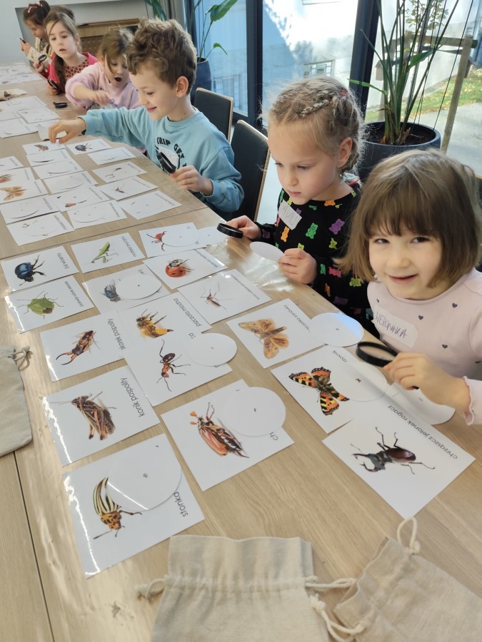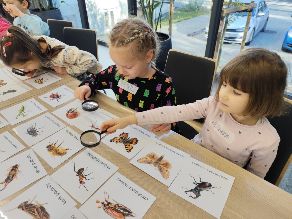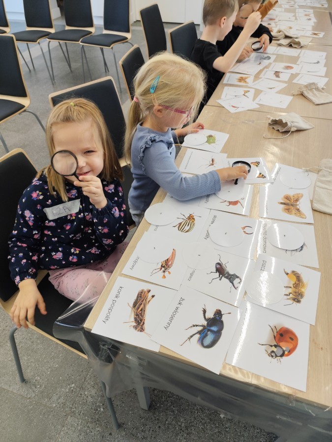 Na warsztatach poznaliśmy owady, które żyją wśród nas, oglądaliśmy eksponaty przez szkła powiększające, poznaliśmy cykl życiowy motyla a także wykonaliśmy swoje owady z piankoliny.